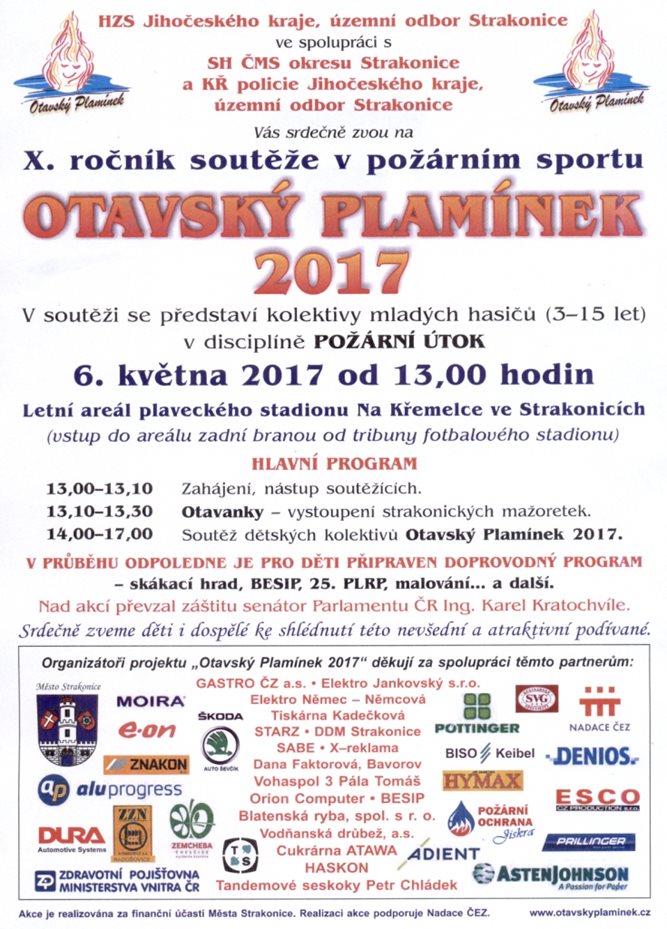 HZS Jihočeského kraje územní odbor Strakonice pořádal ve spolupráci se Sdružením hasičů Čech, Moravy a Slezska okresu Strakonice dne 6. května 2017 od 13:00 hodin v letním areálu plaveckého stadionu ve Strakonicích jubilejní X. ročník soutěže v požárním sportu „Otavský Plamínek“.