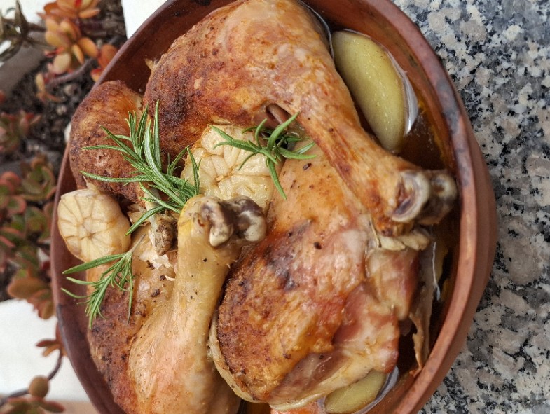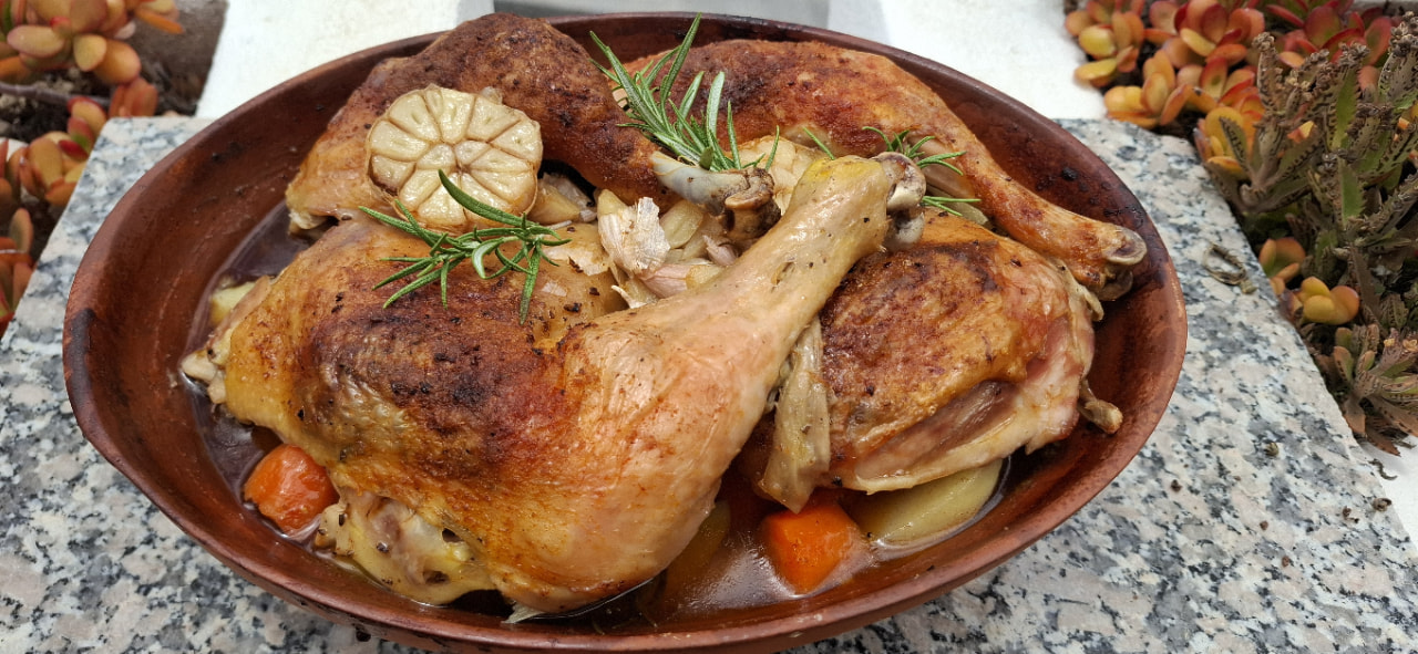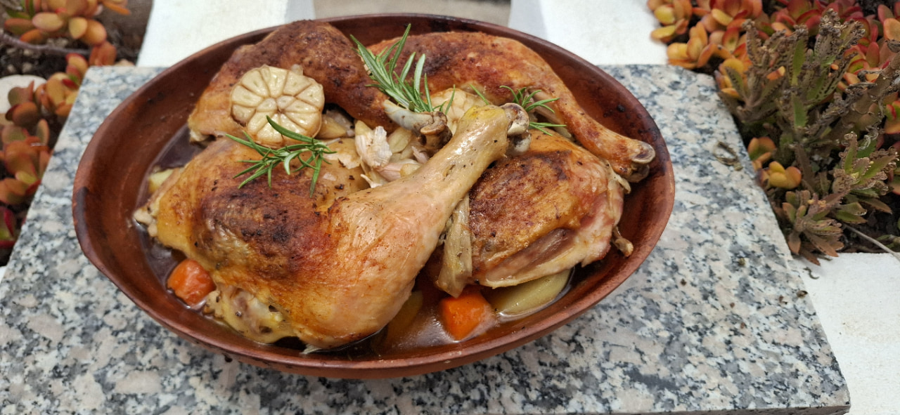 Pomalu pečené kuře s uzeným bůčkem, bramborami a rozmarýnem v hliněném hrnci je ideální víkendový pokrm. Díky pečení ve vlastní šťávě s aromatickým česnekem a karamelizovanou zeleninou získáte lahodné jídlo bez zbytečné práce. Stačí naložit, zavřít a nechat troubu pracovat za vás.