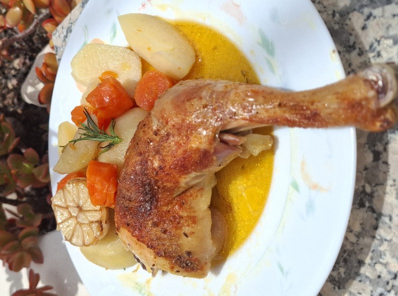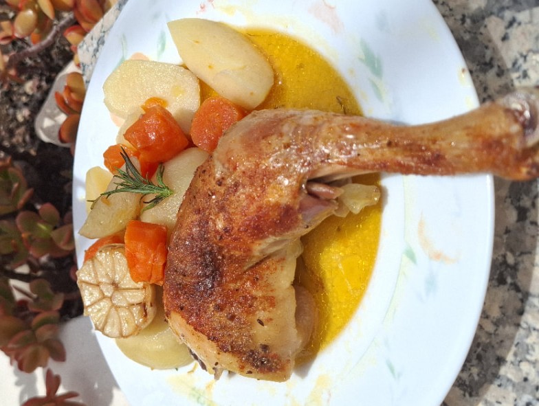 Kuře je měkké, šťavnaté, zelenina karamelizovaná a česnek lze vytlačit jako pomazánku. Podávejte s pečivem nebo samotné – pokrm je sytý a kompletní.