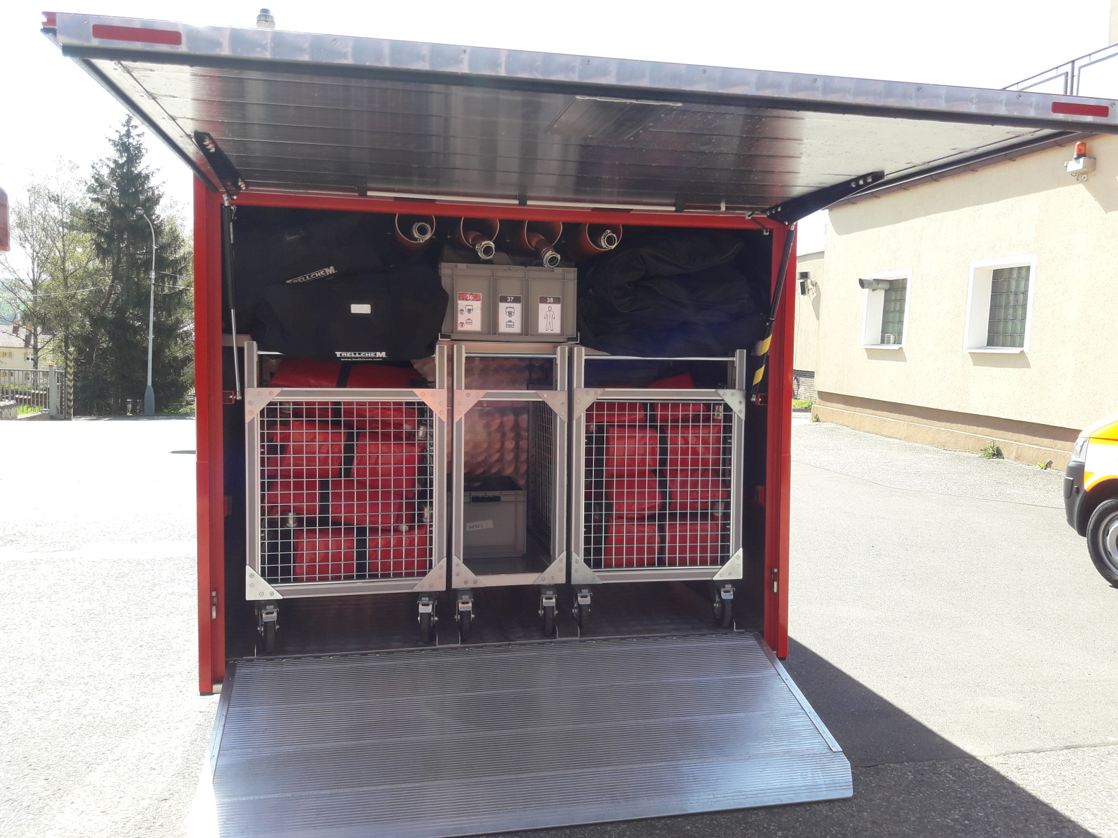 Kontejner je v maximálních možných rozměrech přizpůsoben nosiči kontejnerů s užitečnou hmotností 7 760 kg. Vnitřní uspořádání kontejneru je do sekcí podle uloženého materiálu. Drobný materiál je uložen v unifikovaných plastových přepravkách tak, aby manipulace s ním byla například pro hasiče oblečené do přetlakových obleků co možná nejkomfortnější. Zadní čelo je zároveň projektováno jako krycí střecha pro oblékání hasičů při zásahu v nepříznivém počasí. Vozíky s nornou stěnou v zadní části lze operativně zaměnit za vozíky s náhradními dýchacími přístroji a tlakovými lahvemi.