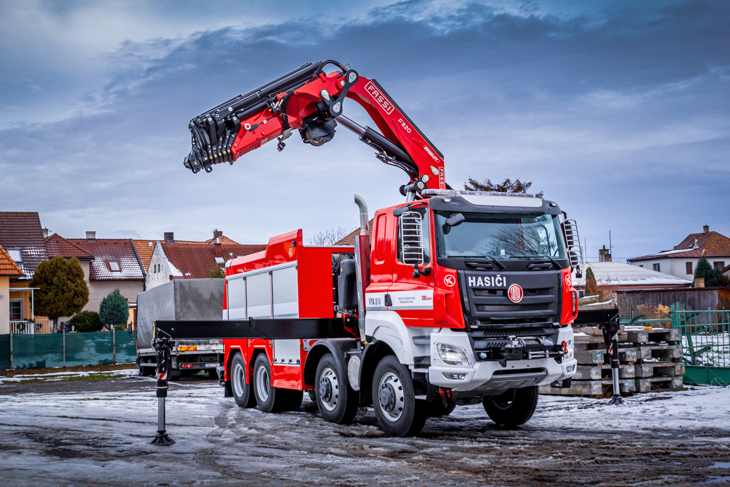 „Nový vyprošťovací automobil je za kabinou vybaven plně hydraulickým nakládacím jeřábem FASSI F820RA.2.28 xhe-dynamic se zdvihovým momentem 69tm. Tento jeřáb umožňuje nosnost 21500 kg při vyložení 2,8m a při maximálním možném dosahu 20,6m vyložení úctyhodných 2740 kg. Úhel otáčení výložníku je 360°s možností nekonečného otáčení. Hydraulický nakládací jeřáb je vybaven vlastním navijákem o výkonu 3 000 daN. Ten má automatické odvíjení lana, které zabezpečuje konstantní vzdálenost mezi kladkou a hákem na konci lana, bez ohledu na délku vyložení. Součástí dodávky je dálkové proporcionální radiové ovládání s možností dobíjení,“ vyjmenovává přednosti vozu Jan Badalec.