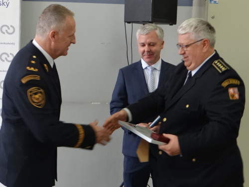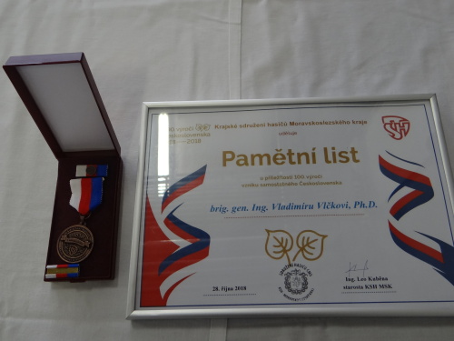 Poznámka: Dnešního slavnostního předávání darů jednotkám profesionálních (HZS MSK) a dobrovolných hasičů (42 obcí) Moravskoslezským krajem se vedle náměstka hejtmana kraje pro regionální rozvoj Jana Krkošky a ředitele HZS MSK brig. gen. Vladimíra Vlčka zúčastnil tradičně starosta Krajského sdružení hasičů Sdružení hasičů Čech, Moravy a Slezska (SH ČMS) Leo Kuběna. Ten předal generálu Vlčkovi pamětní medaili SH ČMS ke stému výročí vzniku Československa za vzornou spolupráci, stejnou medaili obdržel i zástupce ředitele HZS MSK plk. Radim Kuchař.