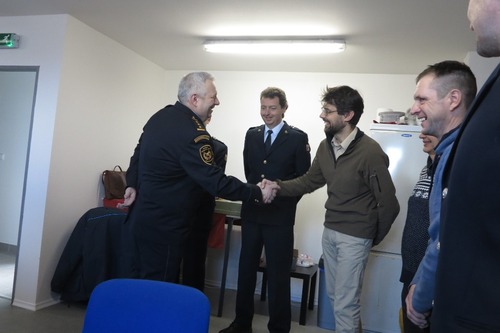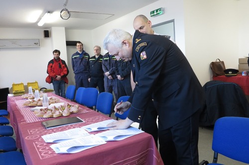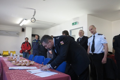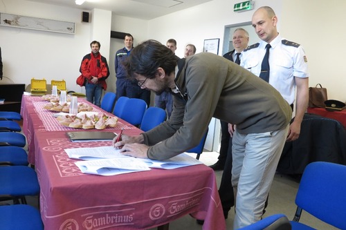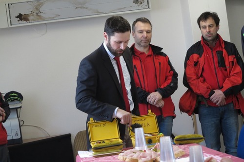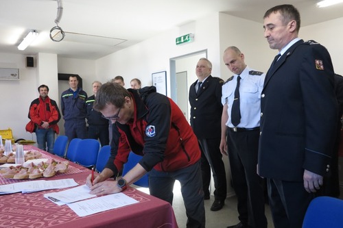 Předseda České speleologické společnosti Marek Audy předal řediteli Hasičského záchranného sboru Jihomoravského kraje plk. Jiřímu Pelikánovi do užívání dvě sady zařízení Nicola.