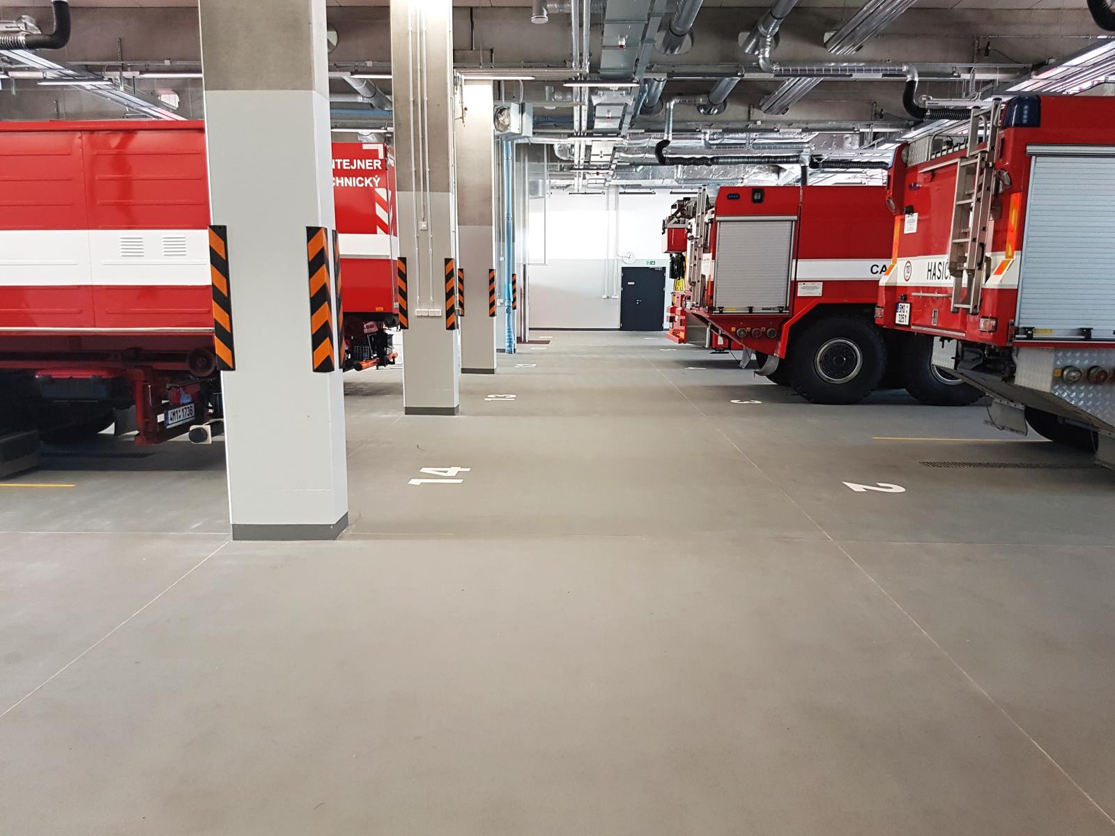 Nová budova rovněž nabízí prostorné garáže pro hasičské automobily. Místo původních sedmi výjezdových vrat jich je na nové stanici k dispozici třiadvacet. Součástí garáží je velký mycí box, strojní dílna i montážní jáma pro servis zásahových vozů. Nové zázemí získali také příslušníci spojové, technické a chemické služby, kteří se starají o technické vybavení a dýchací přístroje profesionálních i dobrovolných hasičů. Součásti dílen chemické služby je také vysokotlaký kompresor na plnění tlakových láhví dýchacích přístrojů vzduchem. Nechybí ani skladovací prostory na hasiva, sorbenty, pěnidla, pneumatiky či ochranné prostředky.