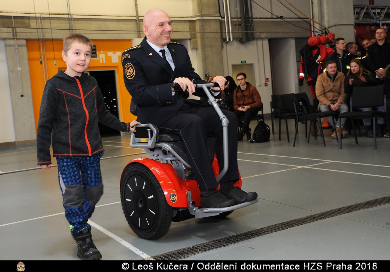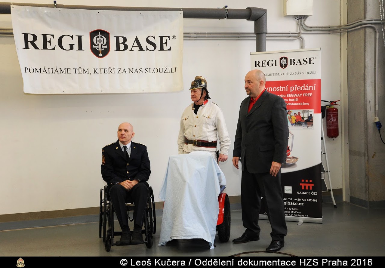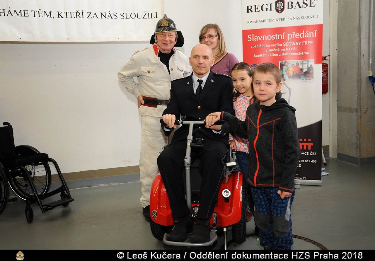 Predani-024.jpgJaký je největší sen hasiče, kterého úraz vyřadil z běžného života? Co nejvíce se přiblížit životu před touto událostí. Tyto sny se snaží alespoň částečně plnit Nadační fond REGI Base I., který pomáhá nejen novodobým válečným veteránům, ale všem, kteří za nás sloužili, tedy bývalým vojákům, policistům nebo hasičům. Jeden z těchto - tentokrát hasičských snů - se splnil tuto sobotu 17.2. 2018 , kdy zástupci nadace, HZS i herec Josef Dvořák, coby “hasič z kultovního seriálu Návštěvníci” předali Liborovi Bohdaneckému revoluční invalidní vozík Segway Freee, který umožní nejen ze deště nést deštník, ale i i telefonovat, vést psa nebo jen tak se s někým blízkým držet za ruku…