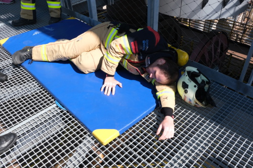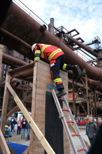 a) Disciplína „Žebříky“ - přenesení a postavení 4 ks nastavovacích žebříků k podestě, vytažení břemene (2x gumová hadice B) na plošinu pomocí lana a sestup na zem,