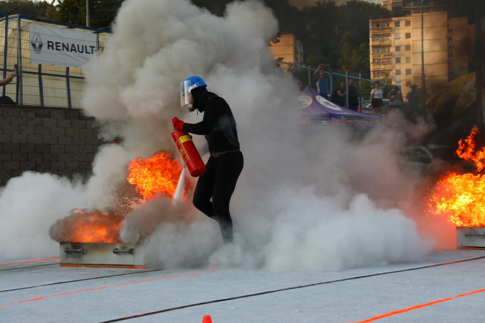 Soutěžící na prvním úseku je vyzbrojen štafetovou proudnicí, a sklapovacím žebříkem na překonání domečku. Po odstartování zdolá pomocí žebříku domeček. Poté soutěžící předává štafetu druhému závodníkovi, který zdolá dva metry vysokou bariéru a předá štafetu v pásmu předání soutěžícímu na třetím úseku. Ten uchopí hadice, přeběhne kladinu na jejímž konci hadice rozvine a následně spojí, jednu půlspojku napojí na rozdělovač, na druhou půlspojku napojí na proudnici. Poté ji ve vymezeném prostoru odpojí a předá čtvrtému závodníkovi. Soutěžící na čtvrtém úseku uchopí přenosný hasicí přístroj, kterým uhasí hořící kapalinu v nádrži, odloží jej tak, aby se nedotýkal nádrže, a přitom zůstal ve své dráze a běží do cíle.
