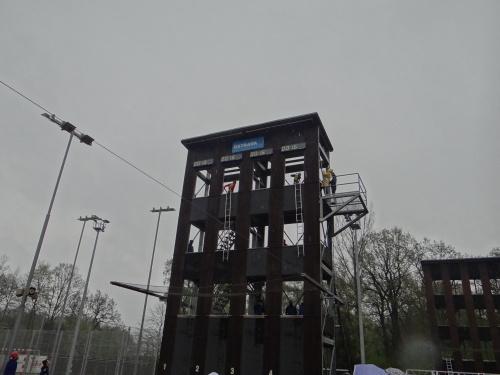 Během středečního dopoledne již skončila soutěž jednotlivkyň ve výstupu na cvičnou věž (výsledky foto č.14). Na rozdíl od mužů ženy vyšplhají po žebříku pouze do prvního patra věže a s žebříkem neběží, visí z okna věže.