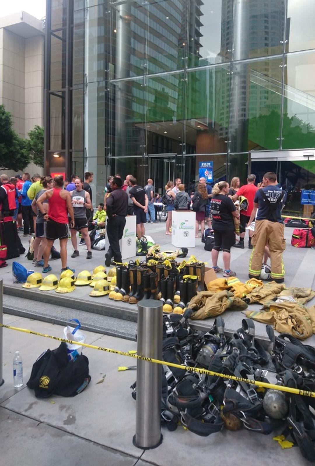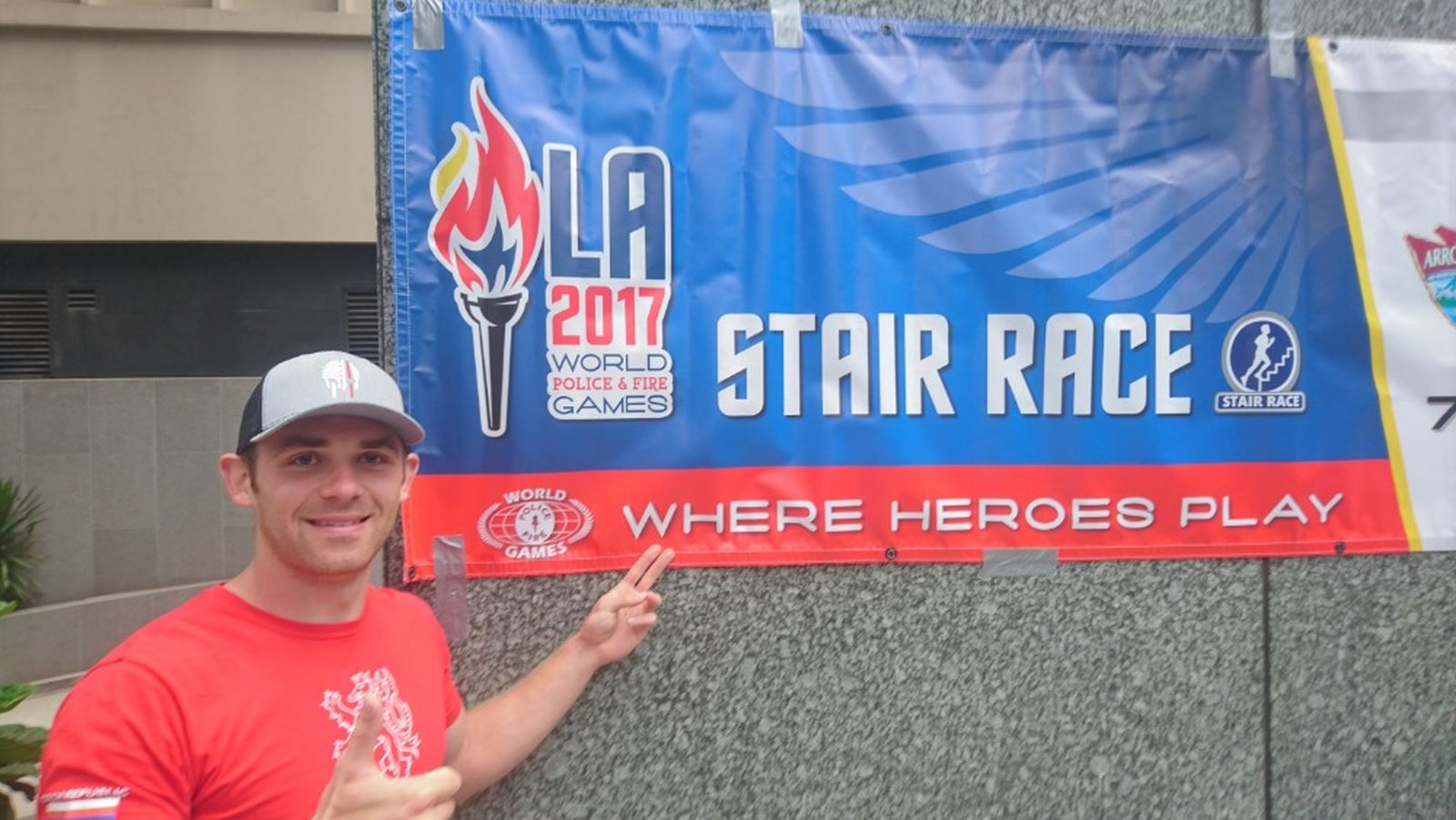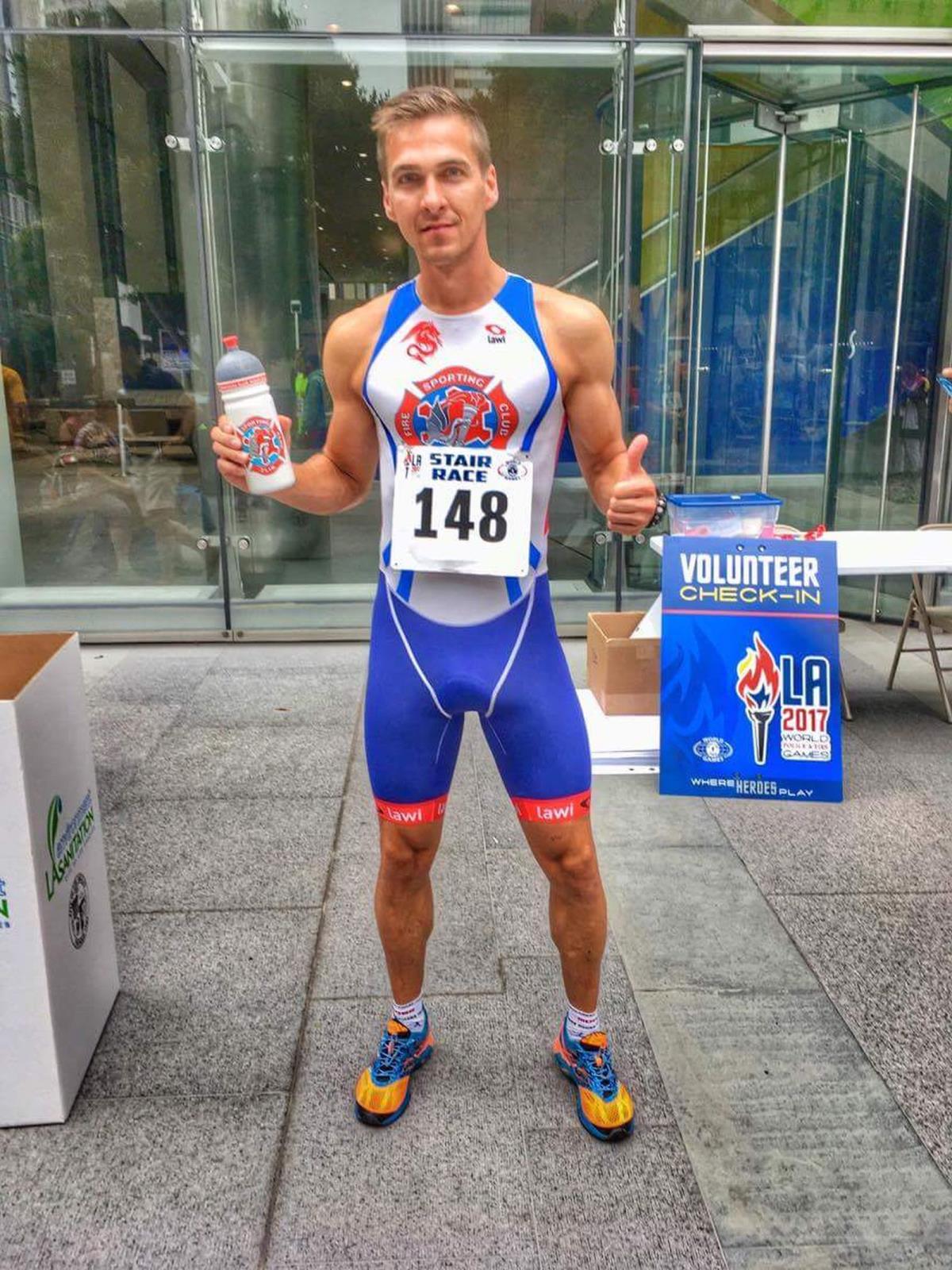 Další disciplinou, kterou oba zlínští hasiči absolvovali, byl výběh výškové budovy. V soutěži bez hasičské zásahové výstroje doběhl Petr Smilek na vynikajícím čtvrtém místě. Stejnou disciplinu ale v zásahové výstroji absolvoval i Jan Haderka. Ten se v silné konkurenci umístil na devátém místě. V této disciplíně byly hodnoceny i týmy, kdy součástí toho vítězného byl i Jan Haderka. Touto soutěží tak doplnil svou kolekci medailí o třetí zlato.