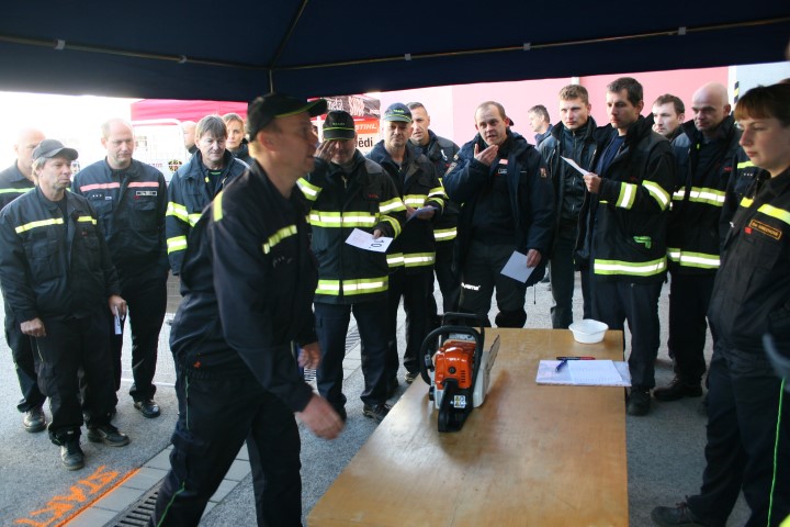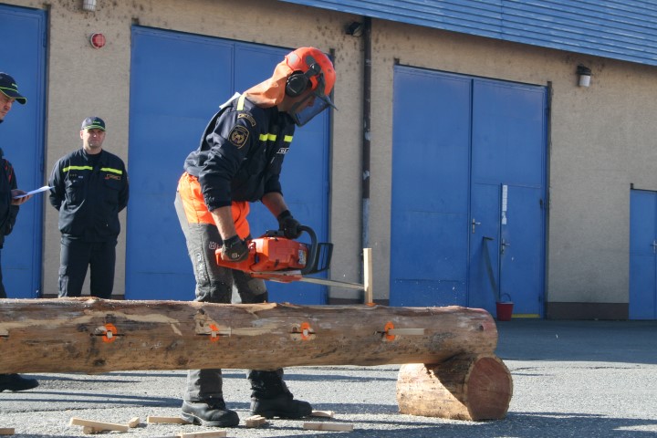 - Soutěžící vstupuje do soutěžního prostoru na pokyn rozhodčího, nastartuje motorovou pilu a položí na startovní čáru (závodník i všechny části motorové pily musí být za startovní čarou).