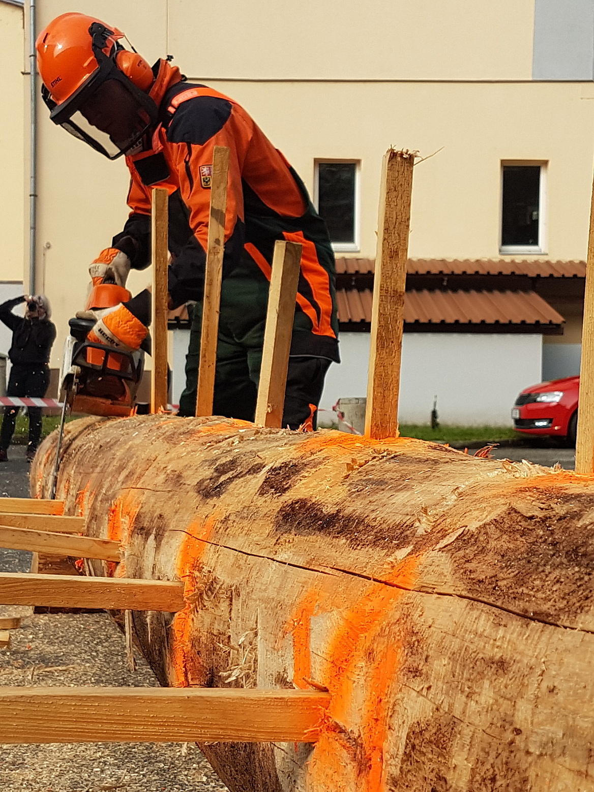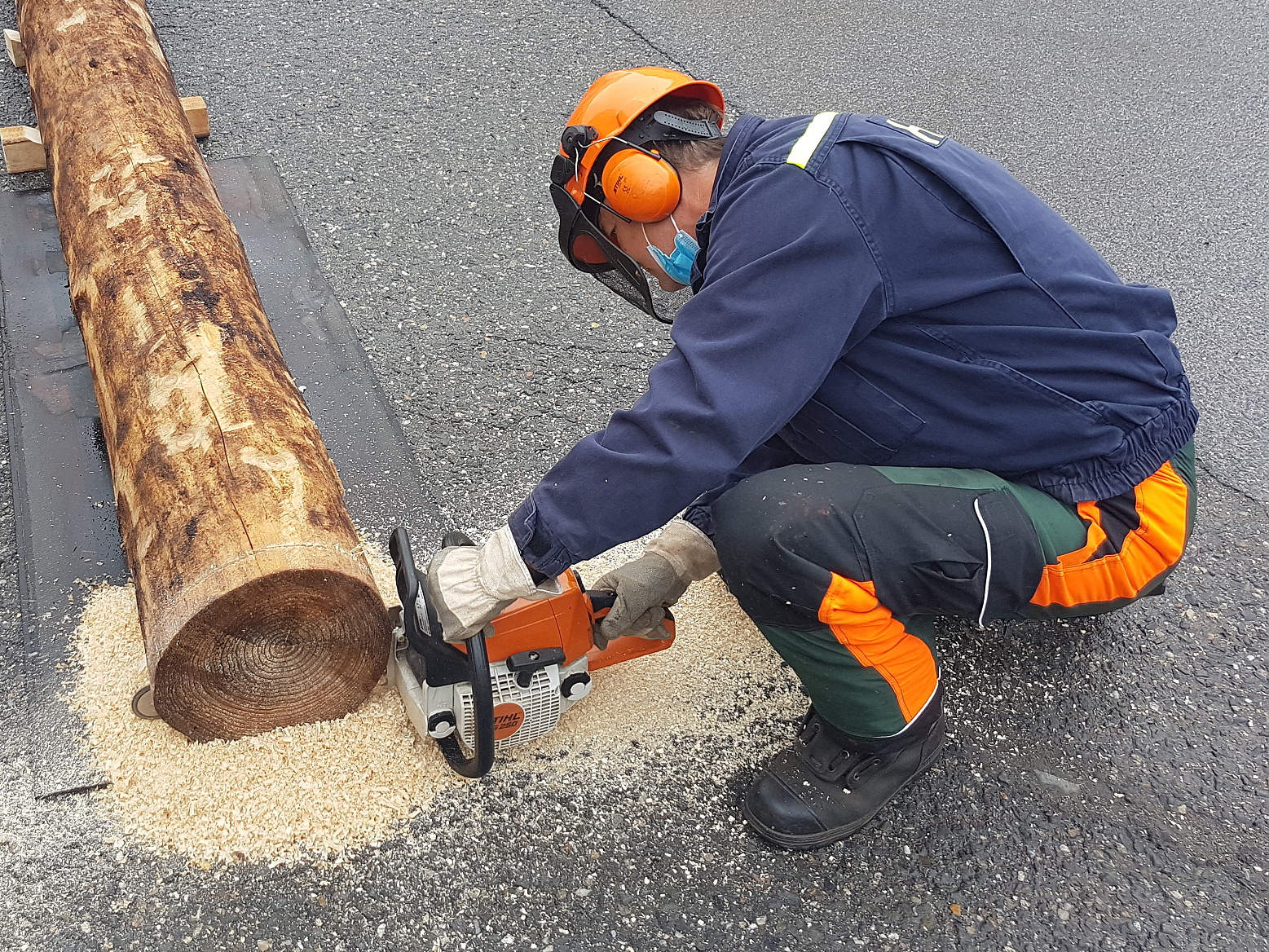 Jakmile dostane soutěžící pokyn ke startu od rozhodčího, uchopí motorovou pilu a přistoupí ke kmeni; vede řez odspodu a zakončí ho v polovině kmene; vyjme pilu z řezu a pokračuje řezem shora, dokud kotouč nespadne na zem; provede odříznutí druhého kotouče v obráceném pořadí; disciplína končí v okamžiku, kdy se druhý kotouč po odříznutí dotkne země.