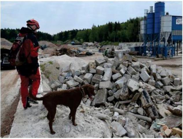 Ve druhém terénu naopak musel pes sestoupit dolů do prostoru sutiny a tu pak samostatně prohledat. Zde se nacházely dvě ukryté osoby, obě tak, že si mohl pes vizuálně ověřit, že se zde osoba opravdu nachází. Úkryty tedy nebyly obtížné, ale mladí a nepříliš zkušení psi měli hlavně problém s pohybem po suti a někteří psovodi přiznávali, že na takovém typu sutiny jsou psi poprvé v životě. Bohužel trénink na reálných sutinách je komplikovaný a většině psovodů nedostupný. Také z toho důvodu jsme velice rádi za spolupráci s firmou AZS 98, která nám umožnila zprostředkovat psovodům a jejich psům tuto zkušenost a nový zážitek.