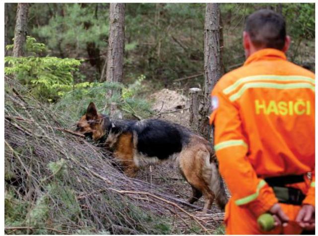 Na závodníky čekaly také dva terény plošného pátrání. V tom prvním, větším, byly ukryté tři osoby. Zároveň jsme si zde také nachystali „malý chyták“ na psovody v podobě úkrytu pod hromadou větví v prostoru, který byl vyhrazen pro pohyb psovoda, ale jasně zahrnut na plánku do prohledávané oblasti. Většina psů se nenechala psovody zmást a odvolat a tuto osobu bez problému i pod větvemi označili. Některým do toho bohužel psovodi příliš intenzivně zasahovali, psy si odvolali, nebo je do tohoto prostoru odmítali pustit, což je stálo další nález. Potěšilo nás, že s další osobou, která byla oblečena do maskovacího oděvu, tzv. hejkala, neměli psi nejmenší problém, stejně tak jako s tou poslední, která ležela pod celtou.