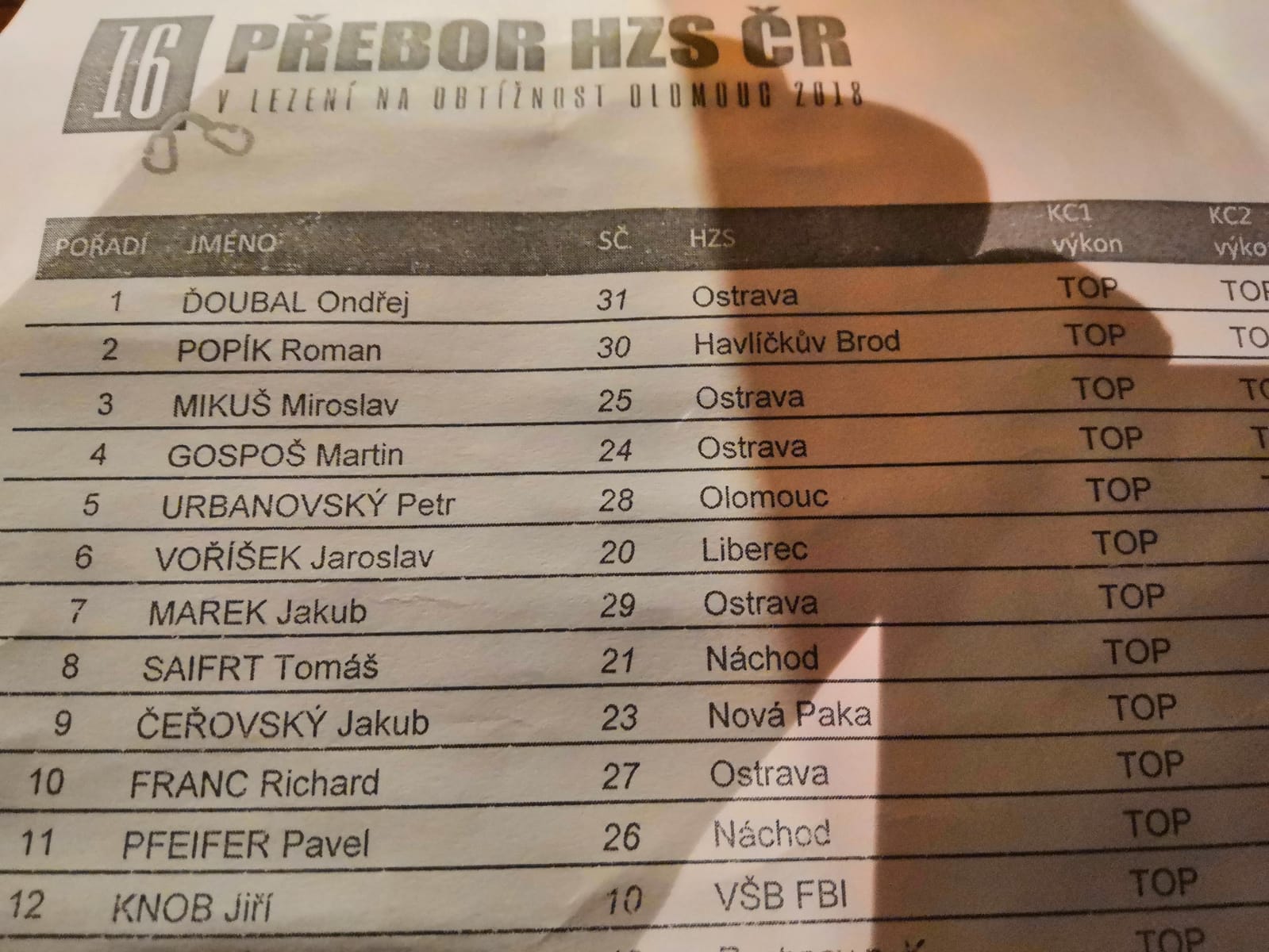 Další dva lezci z HZS Moravskoslezského kraje skončili na sedmém a desátém místě – Jakub Marek a Richard Franc. Dvanácté místo získal v Olomouci Jiří Knob, student Fakulty bezpečnostního inženýrství VŠB-TU Ostrava.