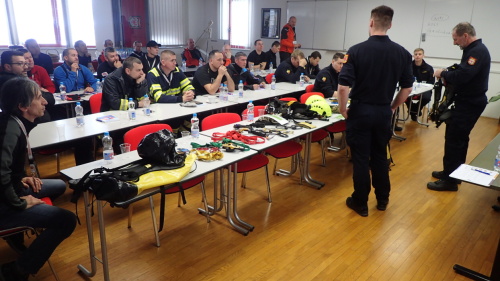 První den cvičení - v prostorách hasičské stanice v Kranji - byl zaměřen na teorii a výměnu zkušeností, probíraly se možnosti použití lezeckého materiálu. Navazovala praktická ukázka základních postupů při práci na laně.