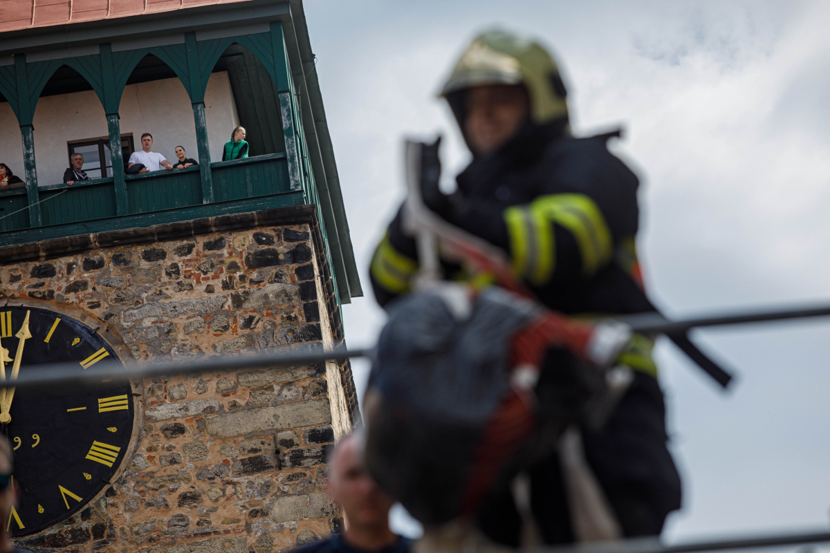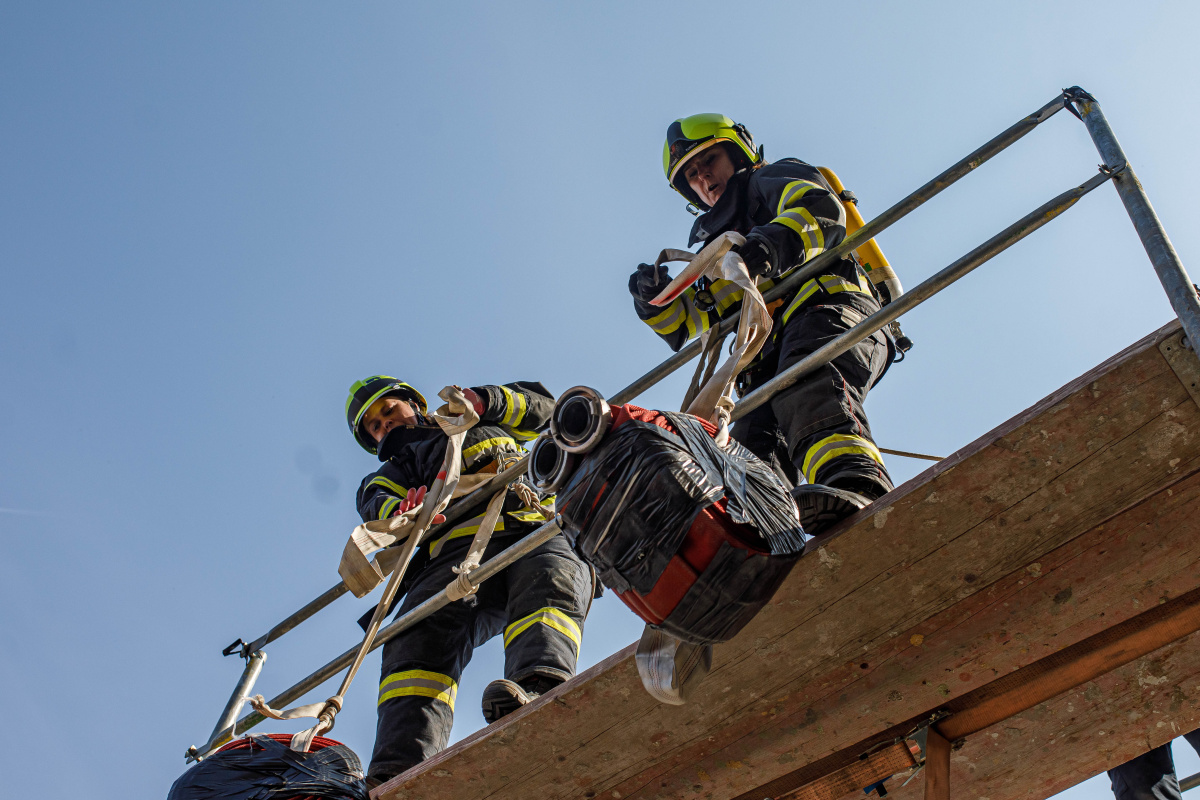 - Lešení – Soutěžící se připnuli karabinou k jistícímu zařízení a vystoupali po žebříku. Vytáhli dva kusy hadic B na plošinu lešení. Poté se museli dostat co nejrychleji opět dolů po žebříku.