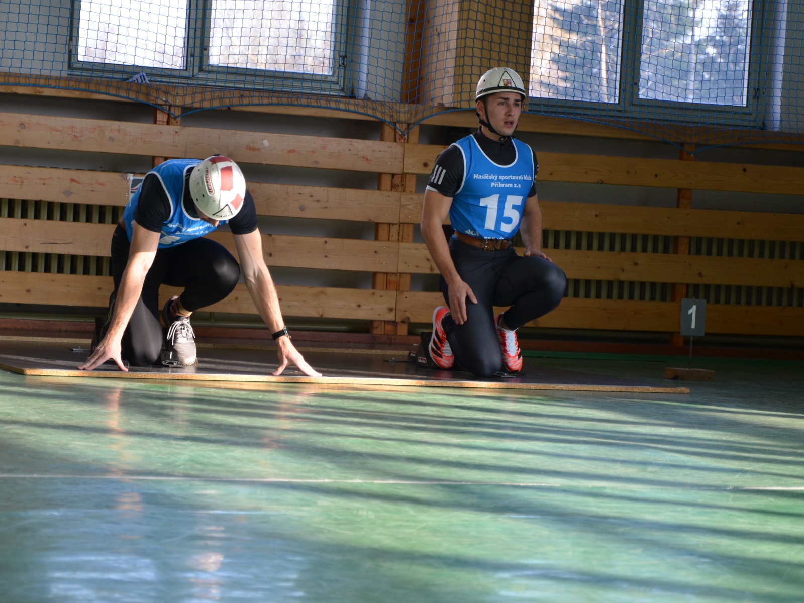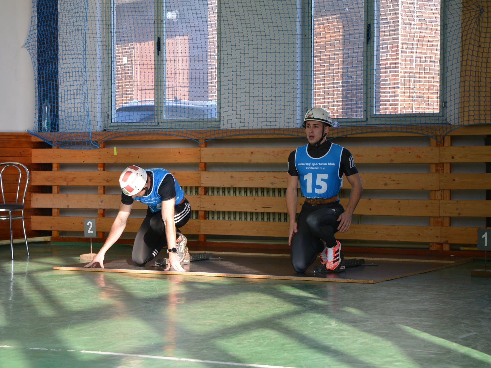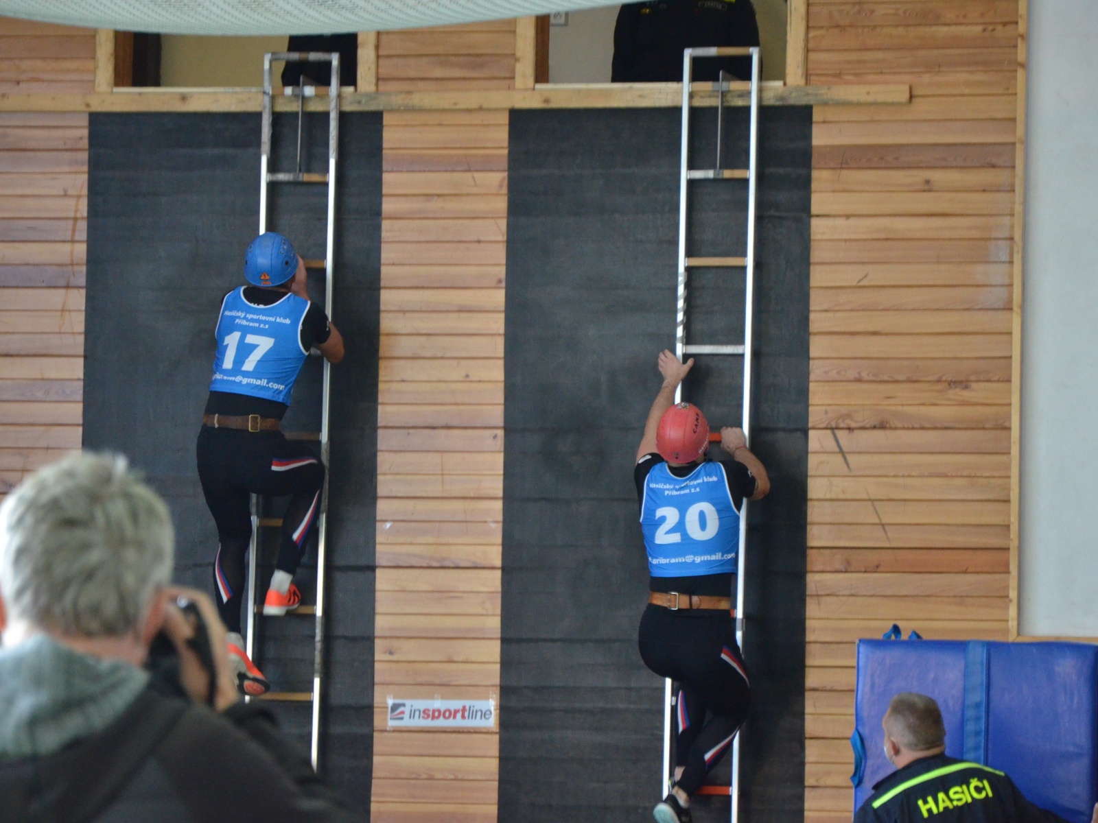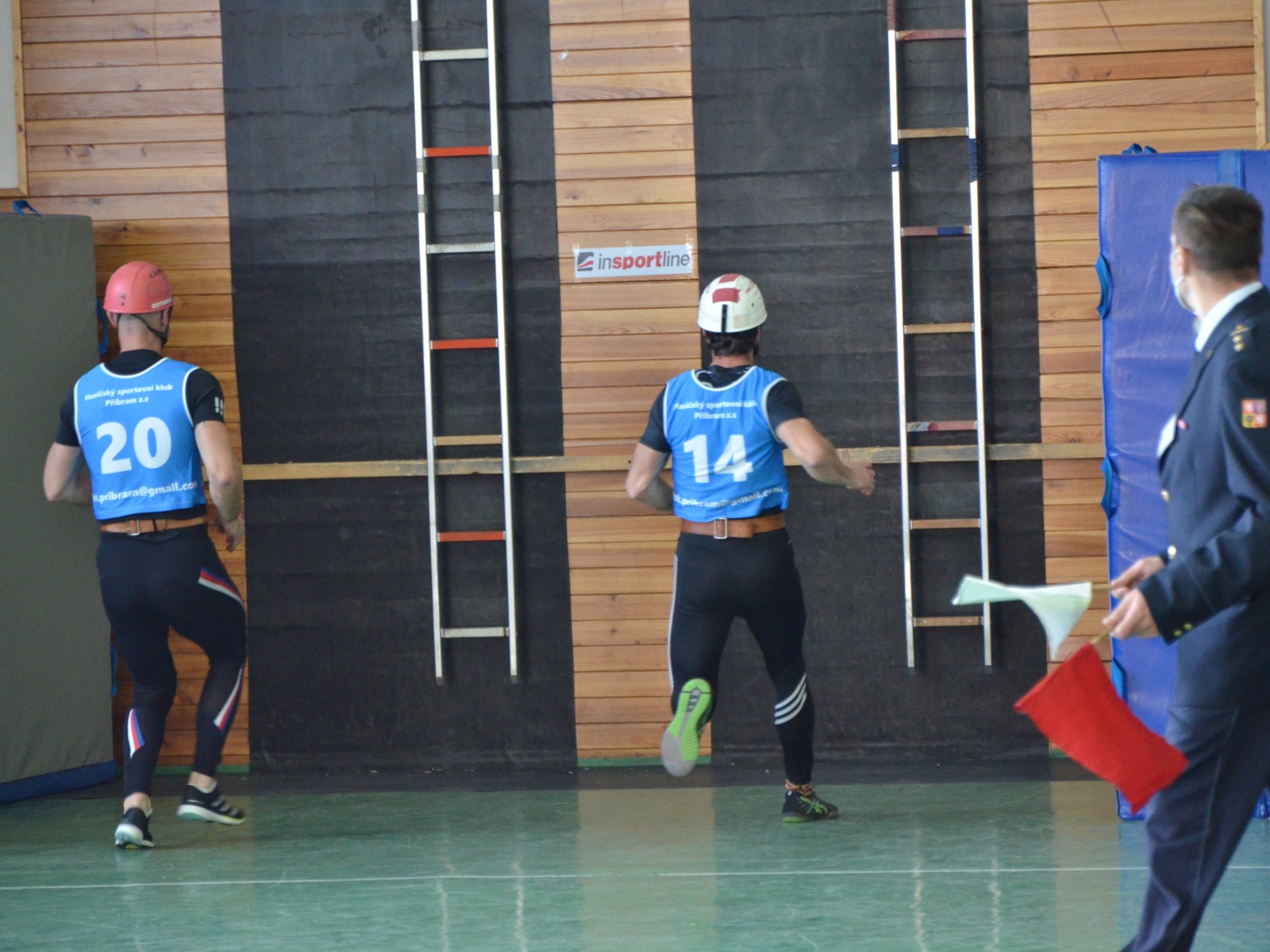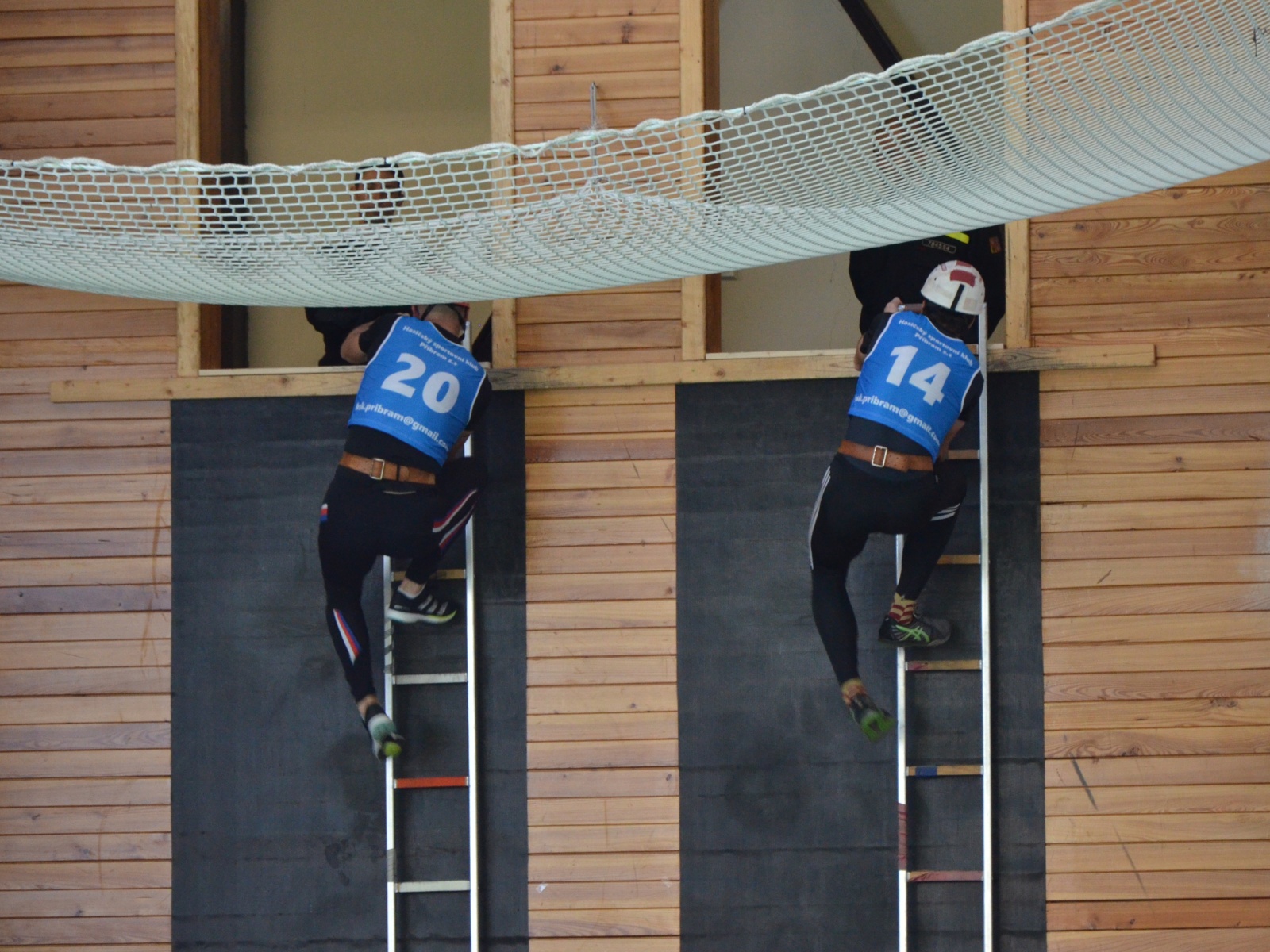 Poslední říjnovou sobotu se na stanici v Příbrami od devíti hodin dopoledne konal už čtvrtý ročník halové soutěže ve výstupu do čtvrtého podlaží cvičné věže pomocí jednohákového žebříku.