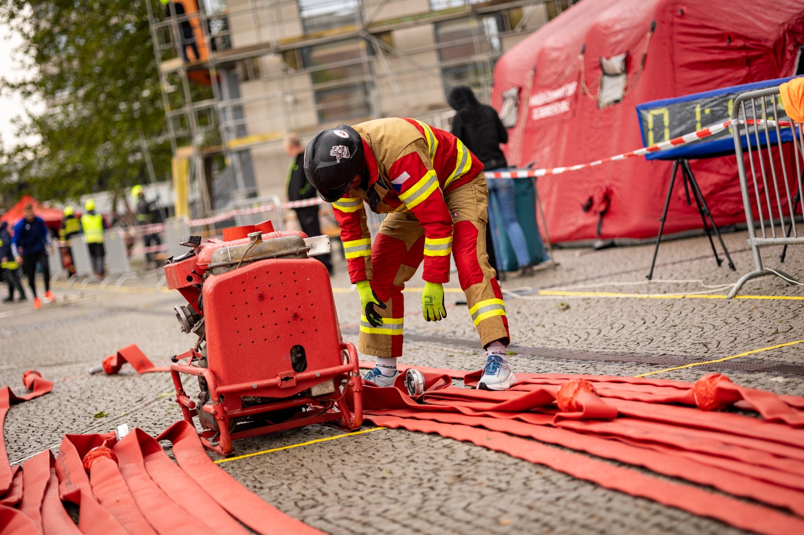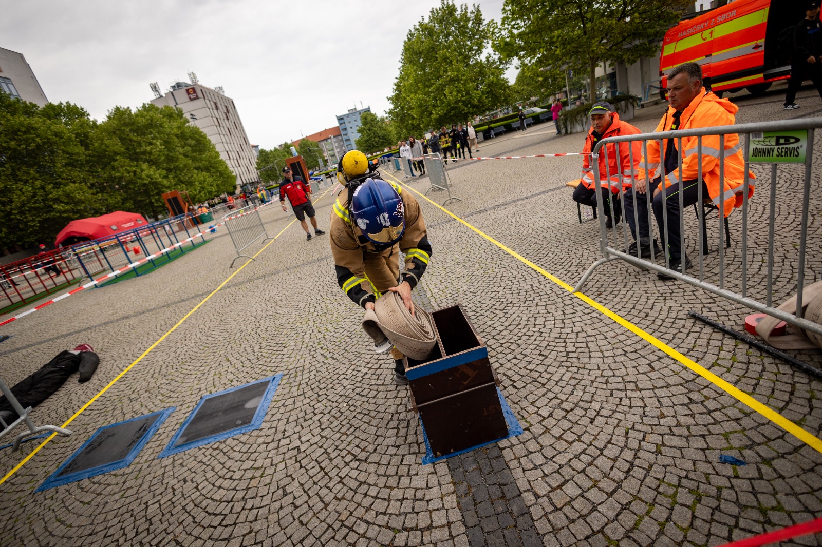Závodník po startu běží k požární stříkačce, napojí dvě hadice, rozvine je, smotá dvě další a přesně je uloží do boxu. Rychlost a přesnost rozhodují.