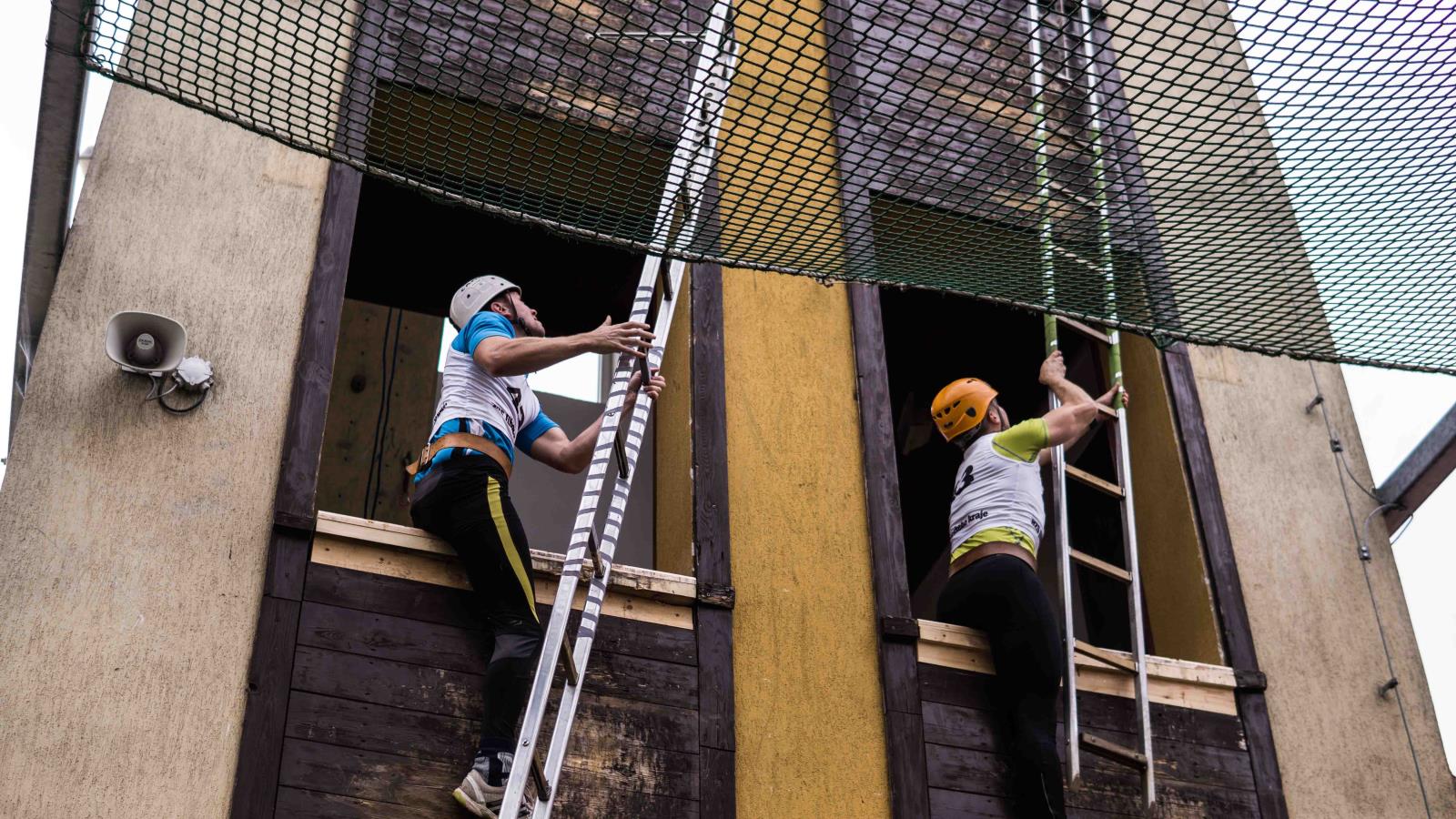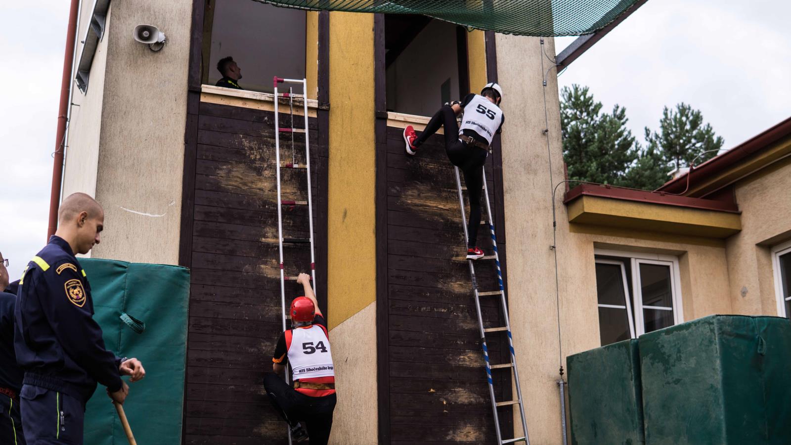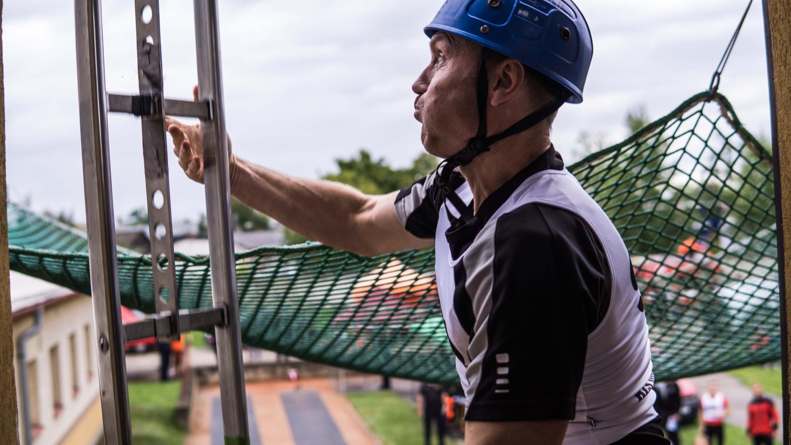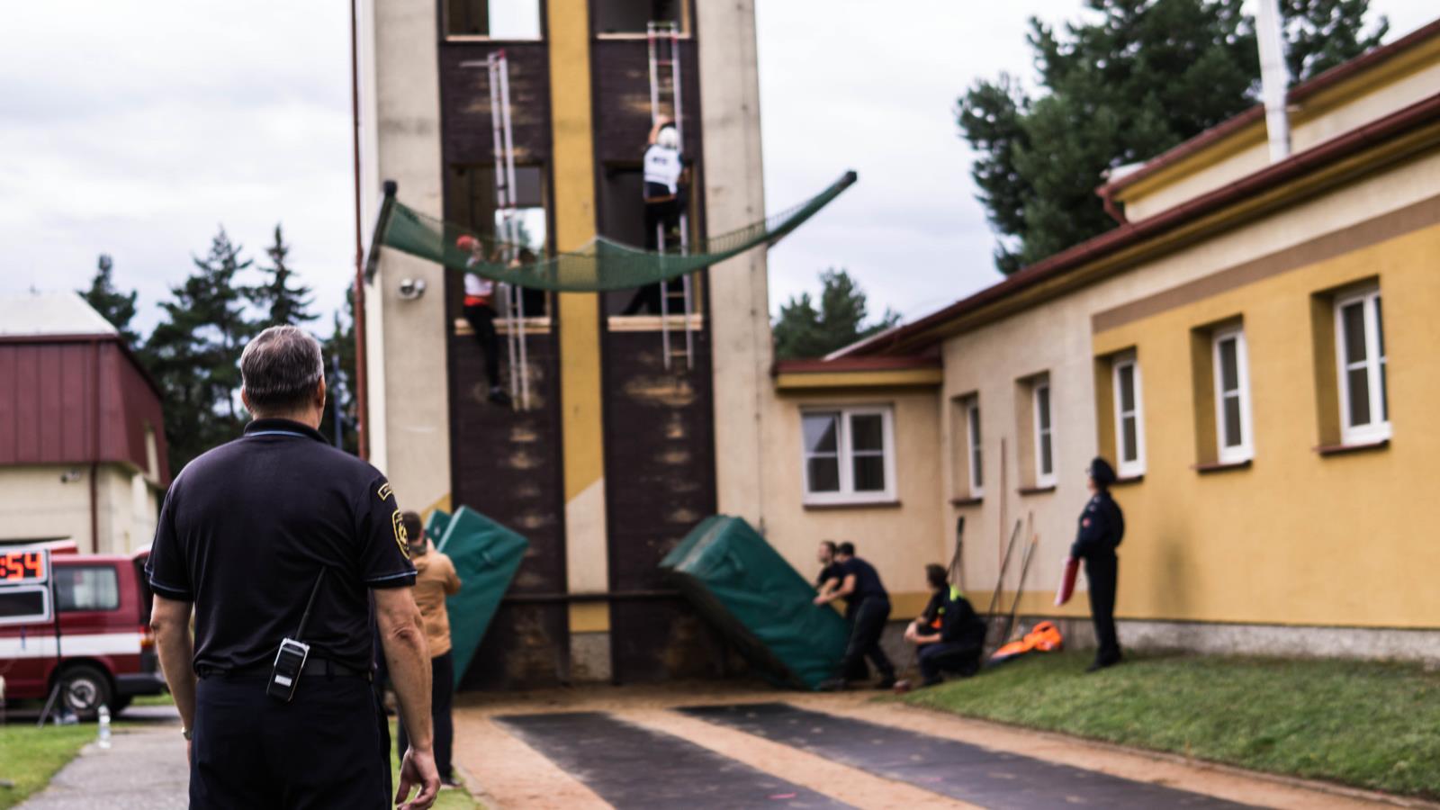 výstup do 4. podlaží cvičné věže pomocí hákového žebříku: