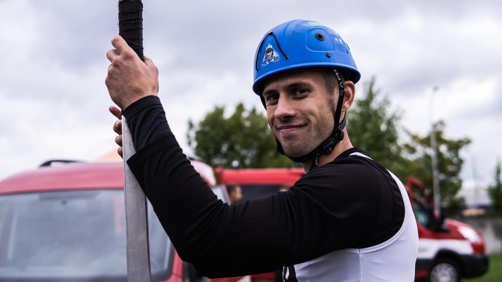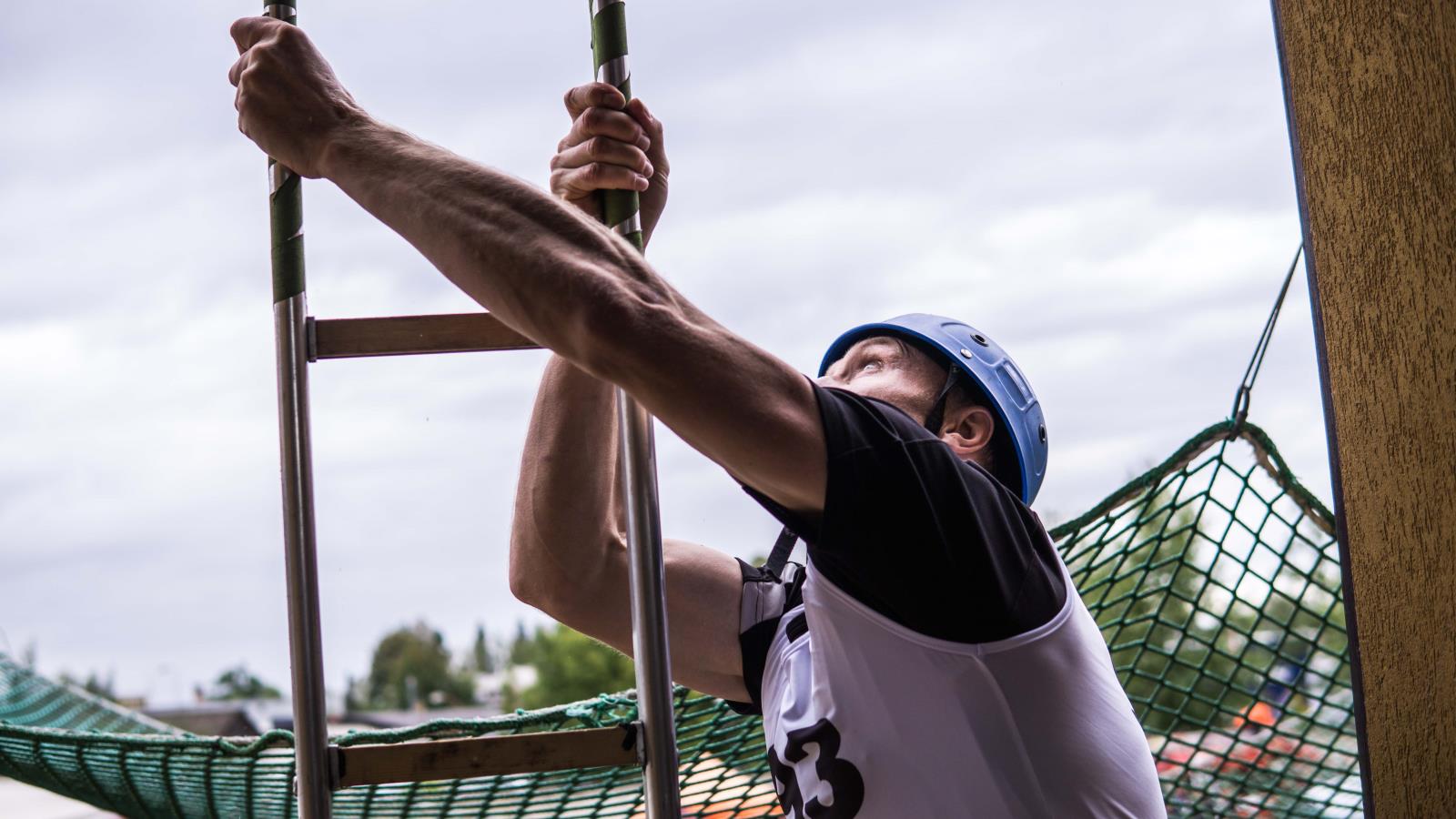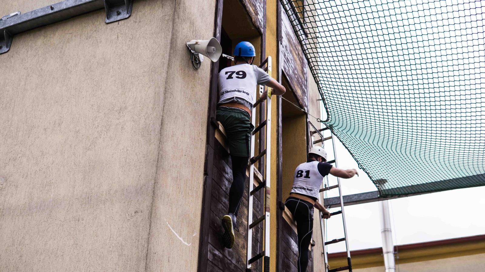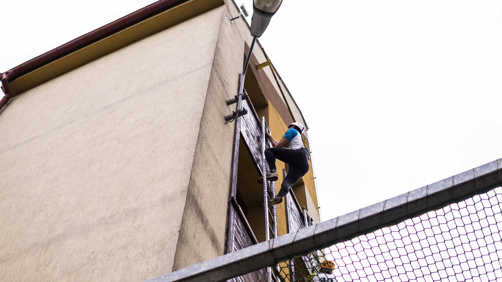 výstup do 4. podlaží cvičné věže pomocí hákového žebříku: