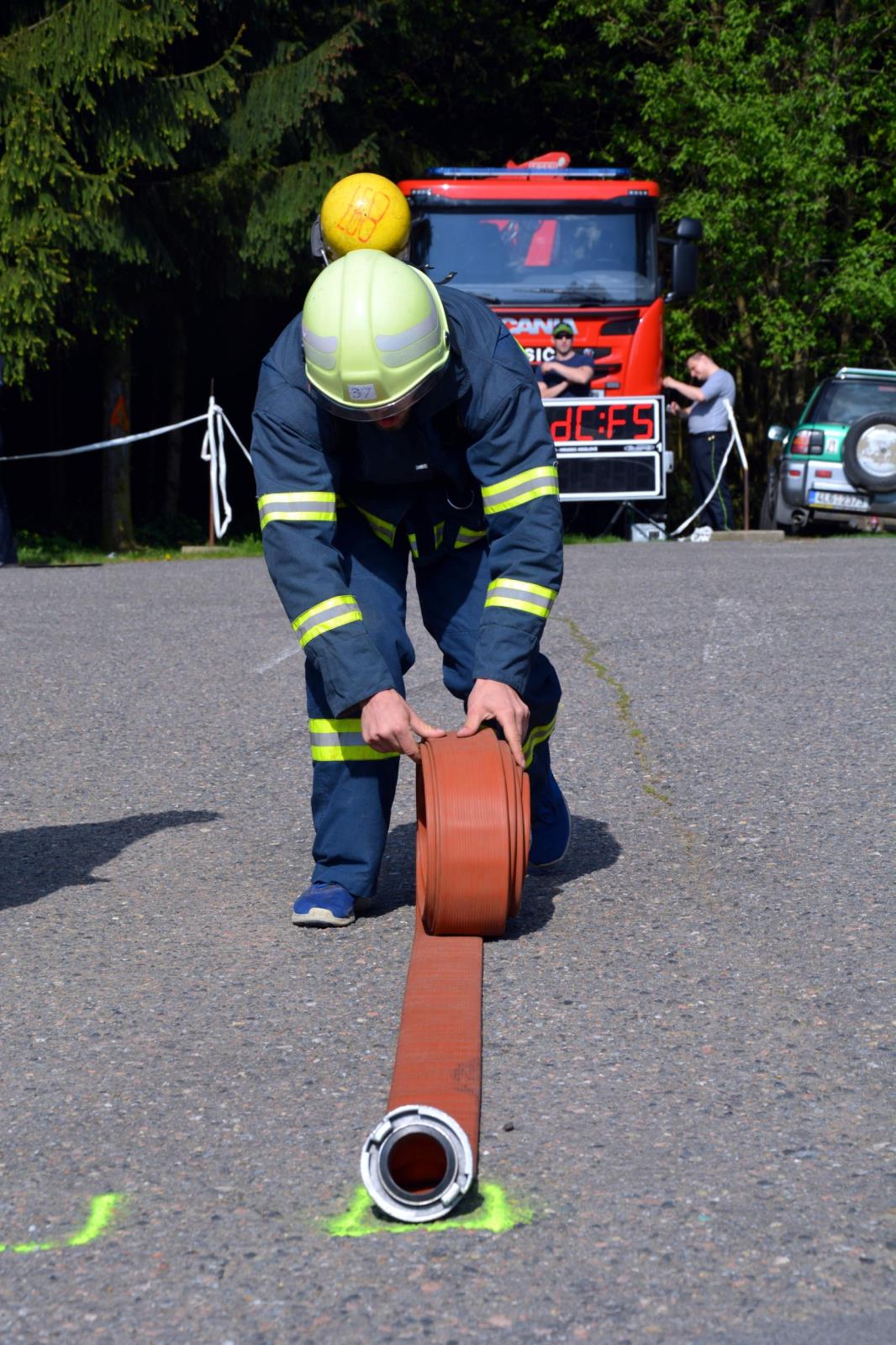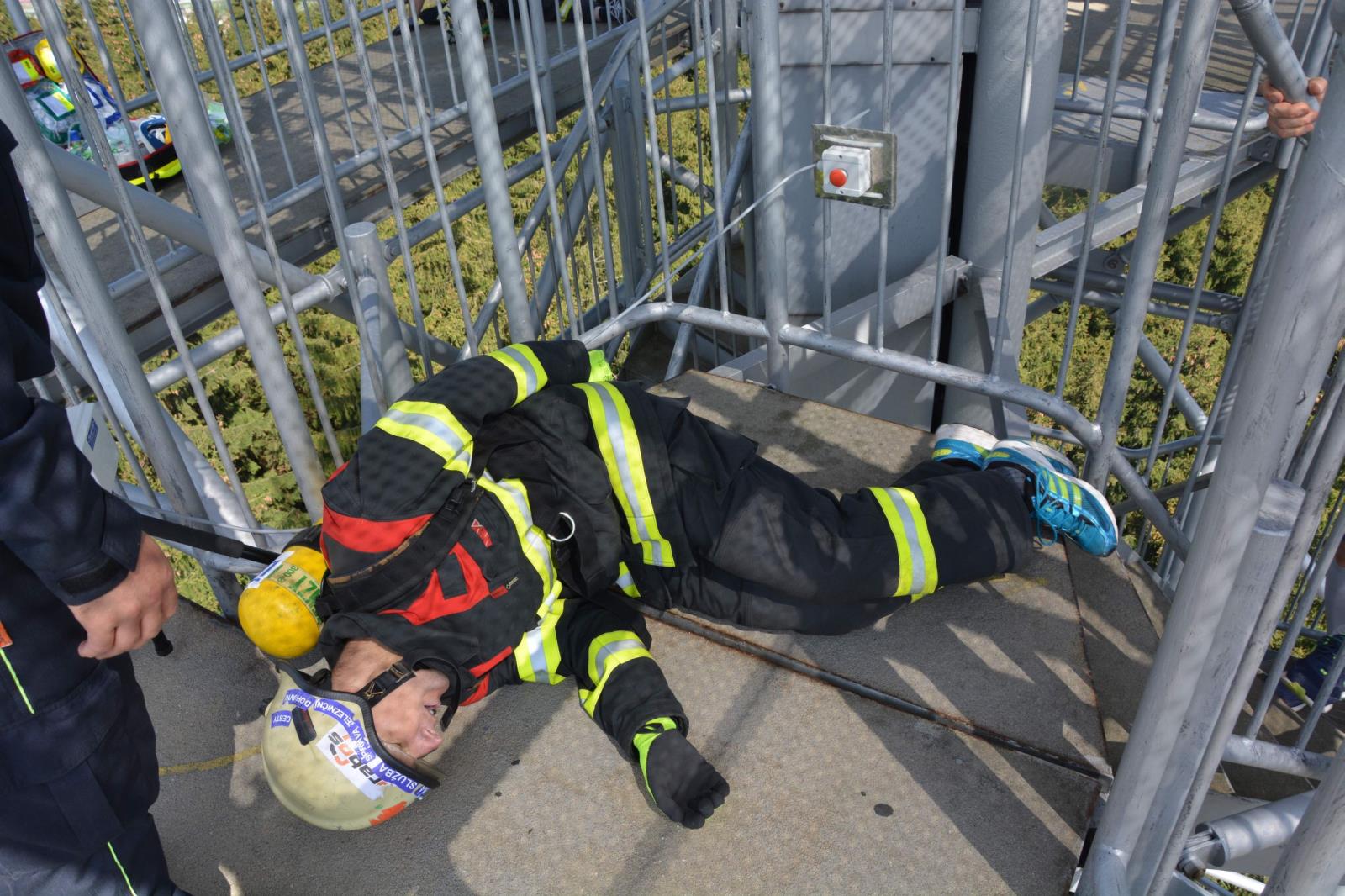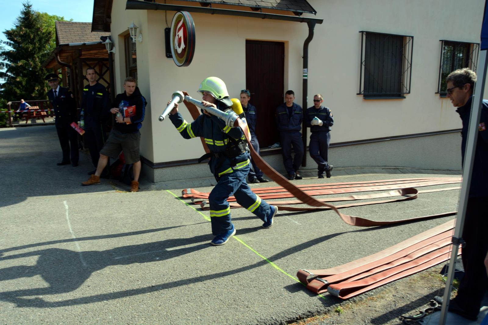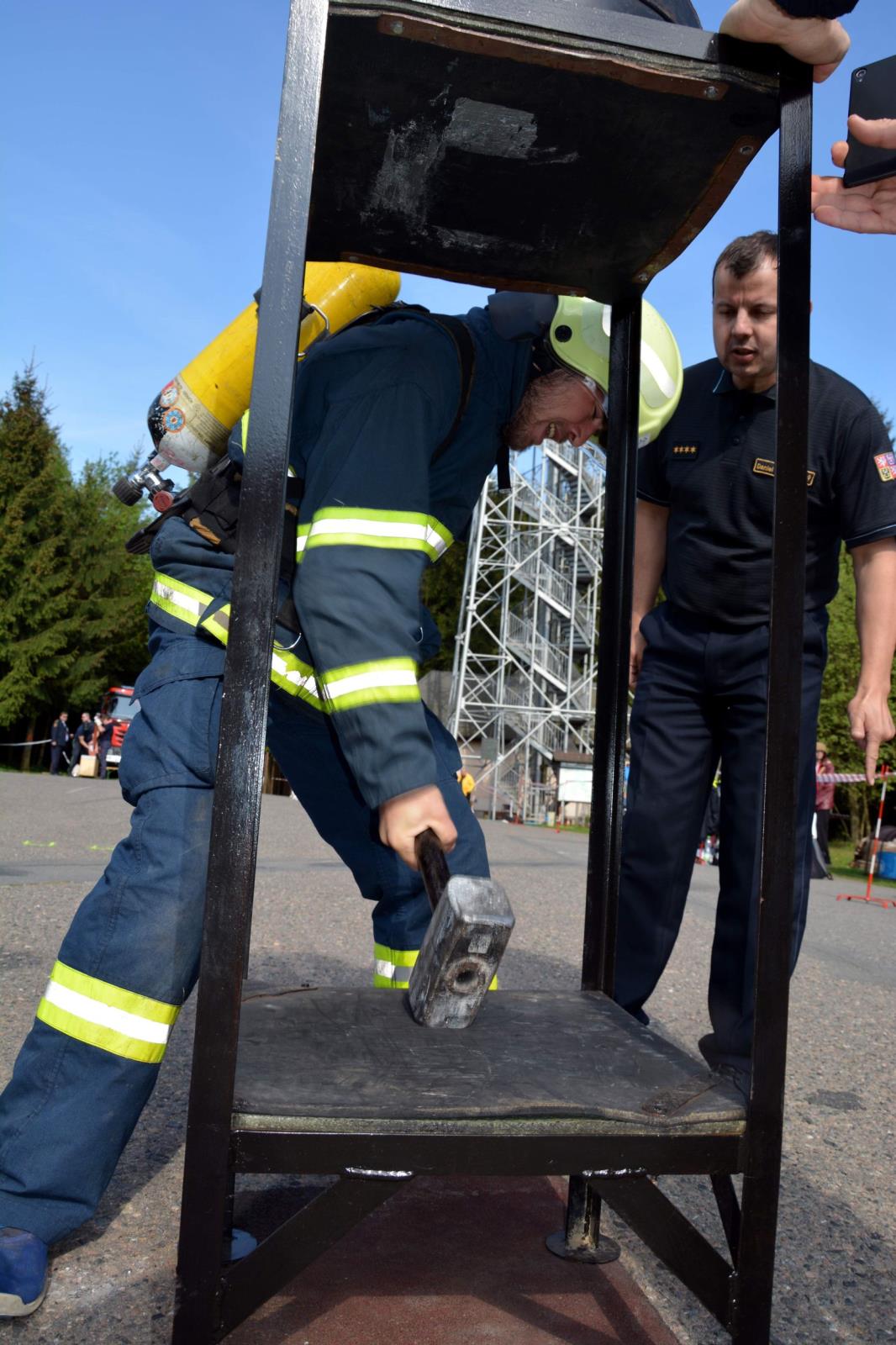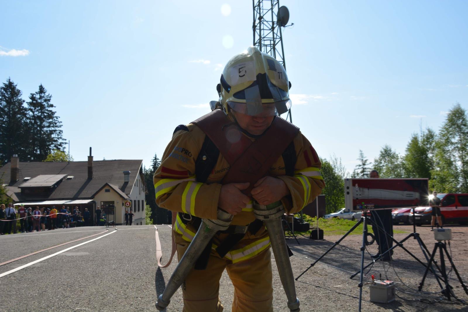 – na startovní čáře soutěžící uchopil obě hadicová vedení za proudnice a poté celé vedení rozvinul na 55 m, kde proudnice odložil na metu, smotal dvě hadice B, položil rovnoběžně vedle sebe, každou zvlášť do kotouče půlspojkou dovnitř a uložil je do boxu tak, aby z něj žádnou částí nepřečnívaly přes půdorys, doběhl k hammer boxu, uchopil obouruční palici a provedl 80 úderů do jeho konstrukce (střídavě nahoru a dolů), poté palici odložil na určené místo, běžel k figuríně, uchopil ji a přemístil koridorem do stanovené vzdálenosti (30 m) a kolem kuželu zpět a položil ji na stanovené místo, doběhl k 2 m bariéře, překonal ji a pokračoval výstupem po schodech na plošinu rozhledny (183 schodů, cca 12. NP) kde se nacházel cíl.