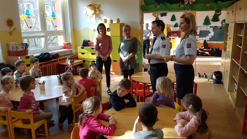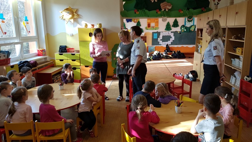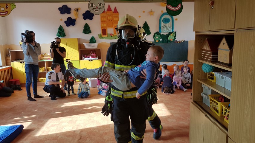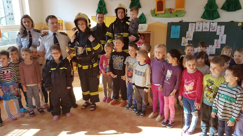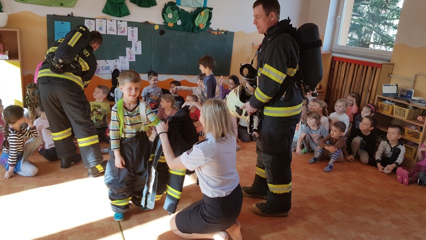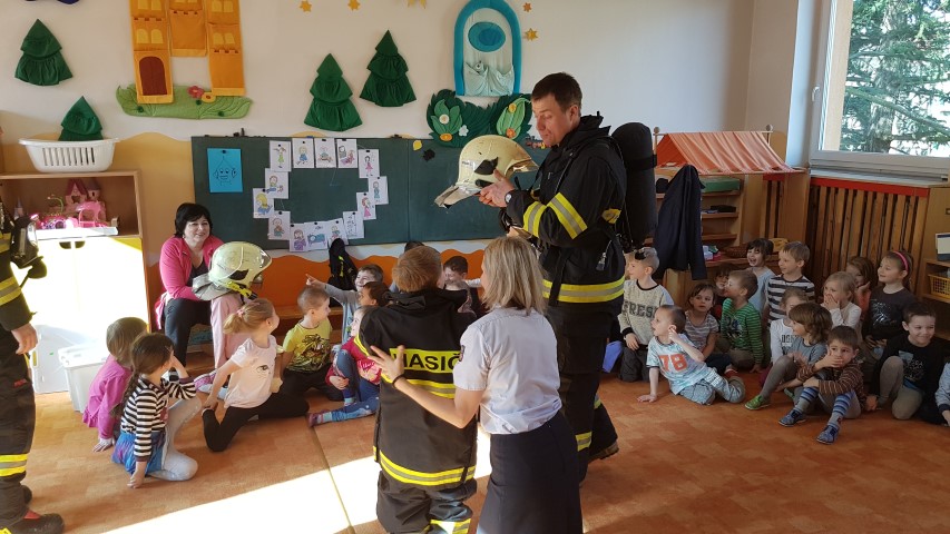 Pro děti z MŠ byl připraven jeden pracovní list z publikace, který jsme společně vyplnili. Poté se děti v rámci vzdělávacího programu Hasík dozvěděly, jak vypadá hasič, co všechno má na sobě při zásahu, jaká jsou telefonní čísla tísňového volání, jak se zachovat, pokud na procházce najdou sirky apod. Největší zájem měly děti tradičně o zkoušení hasičské přilby a dětského zásahového obleku. Hasiči také oblékli jednu z paních učitelek, kterou chtěli dětem odvézt na požární stanici. To jim však děti nedovolily...
