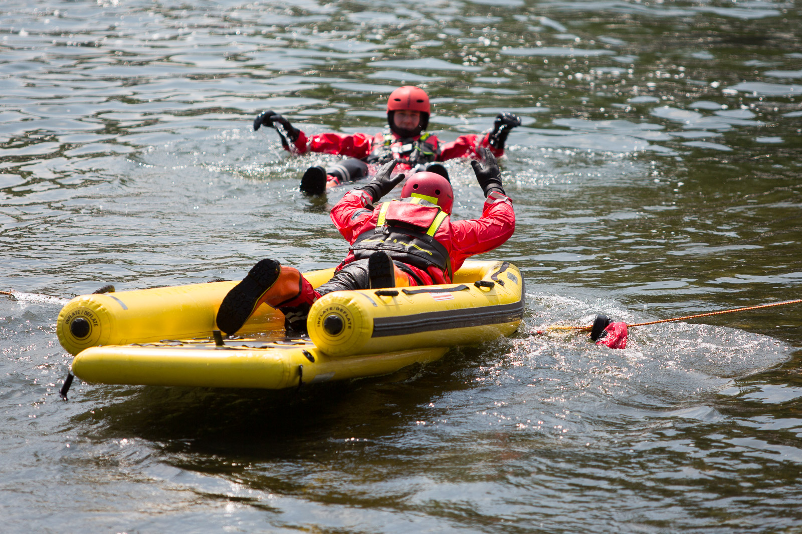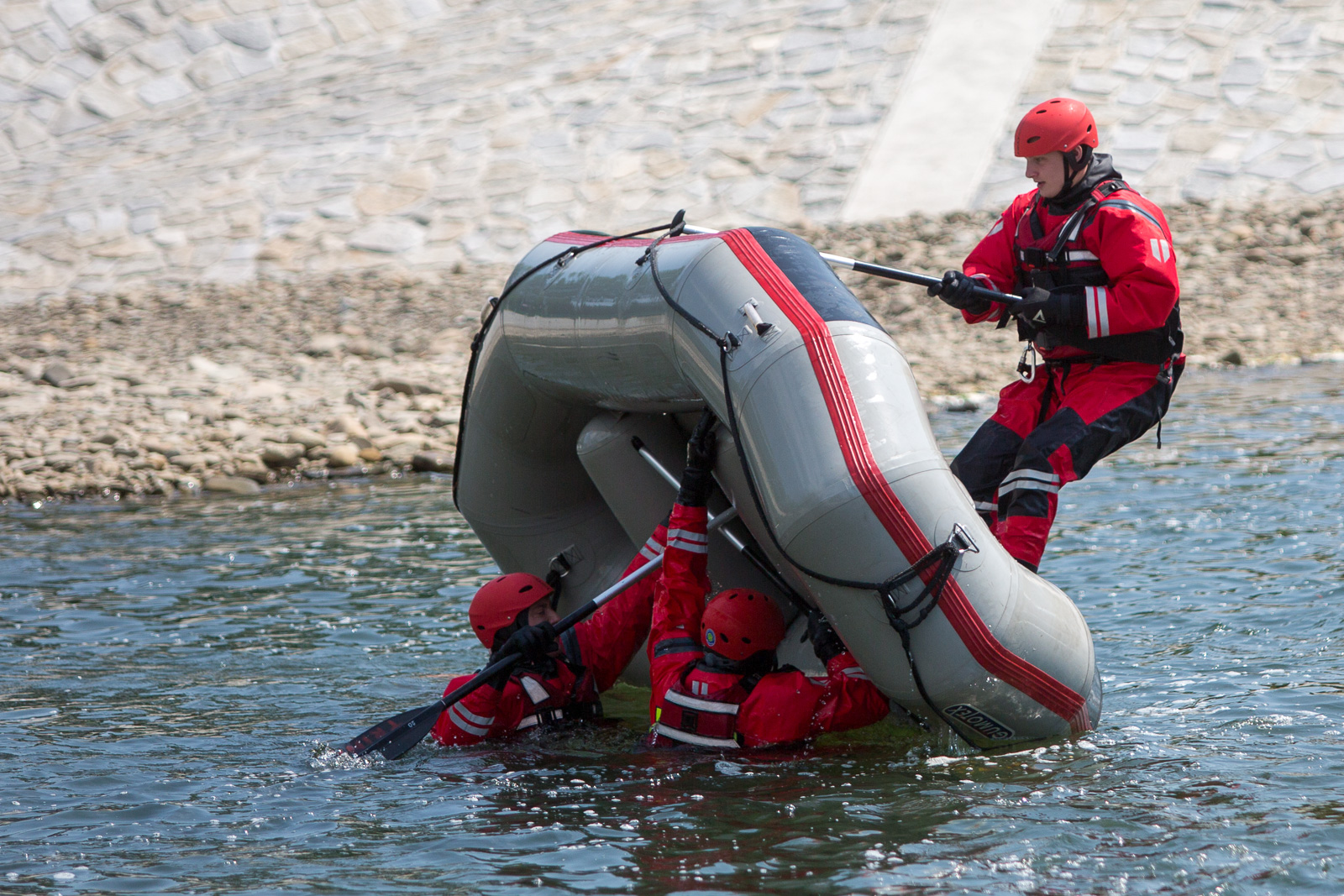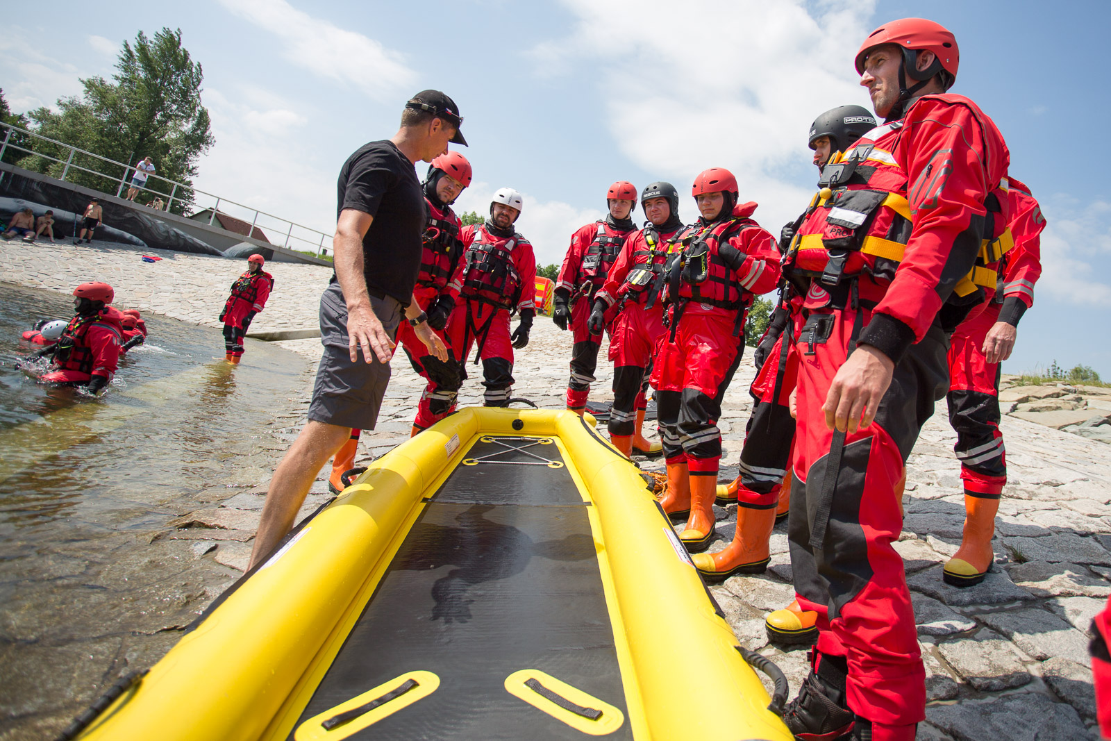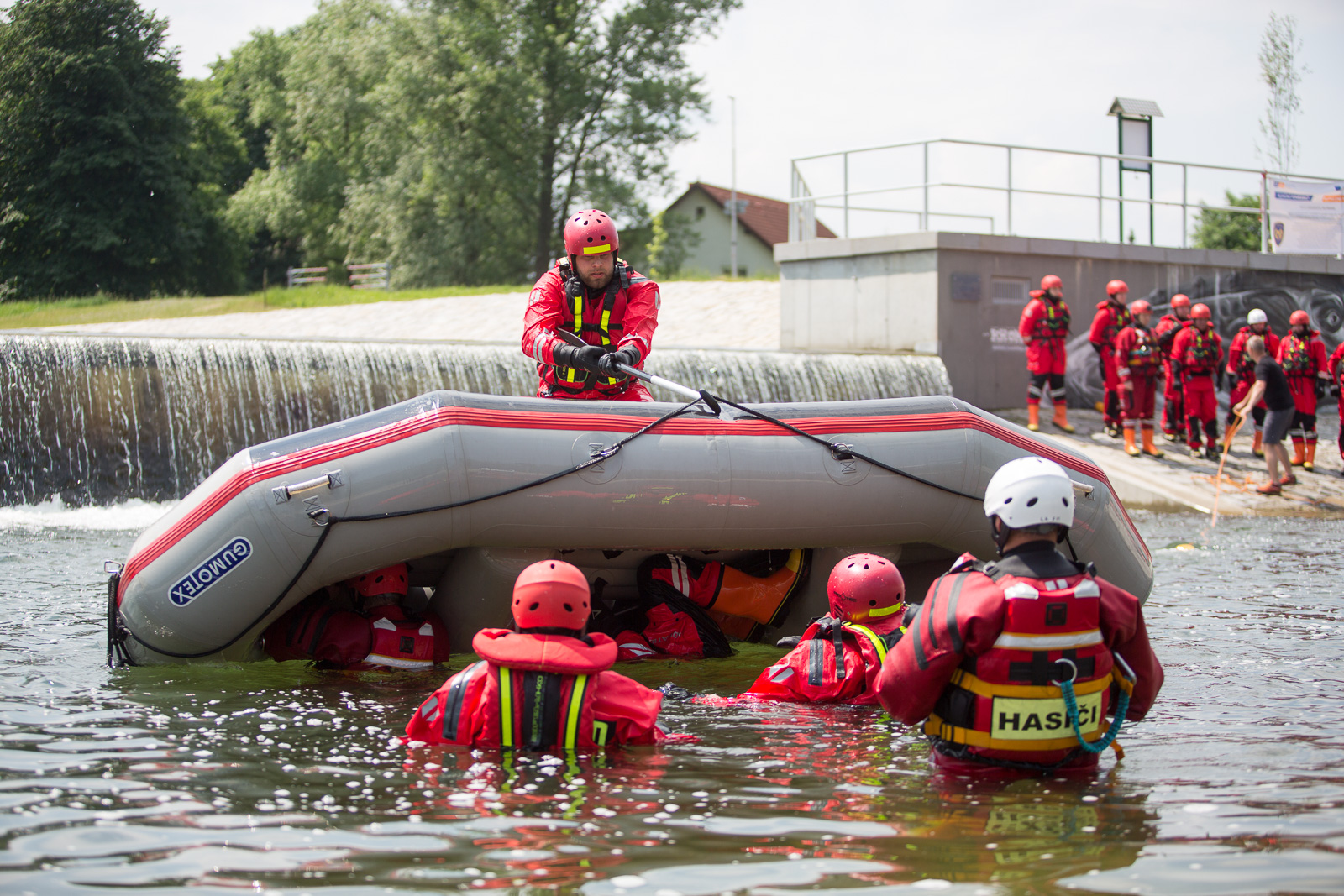 Na prvním stanovišti hasiči cvičili ovládání raftu a speciálních nafukovacích záchranných saní RS5 a záchranné práce pomocí těchto prostředků. Trénovali i obrácení ve vodním toku.