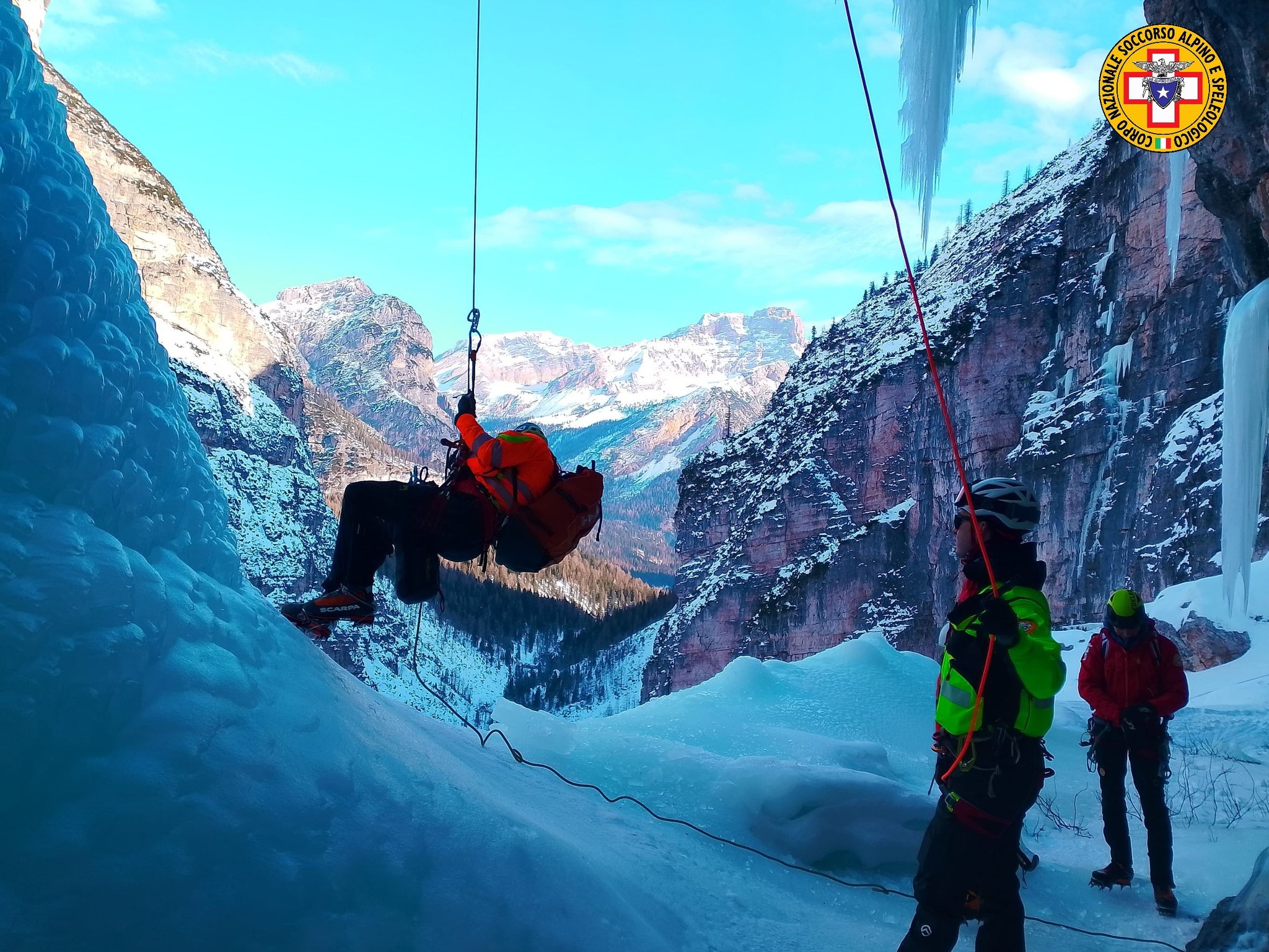 Dolomity, Val Travenanzes – Ledové stěny, extrémní podmínky a záchranné manévry v těch nejdrsnějších podmínkách. Italské záchranné týmy se včera podrobily náročnému výcviku v lezení na ledopádech, který simuloval reálné zásahy v těžko přístupném horském terénu.