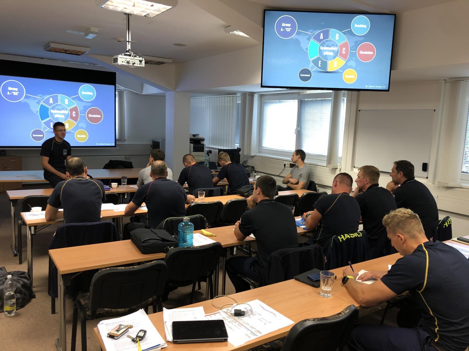Kromě teoretické přípravy byl kladen velký důraz na praktické poskytování první pomoci při komplexních modelových situacích, mezi které patřily simulované zásahy například u osob s náhlou zástavou oběhu, cévní mozkovou příhodou, po pádech z výšky, u dopravních nehod, při požárech, únicích nebezpečných chemických látek apod. Praktická část výuky byla rovněž zaměřena na zásahy u mimořádných událostí s velkým počtem zraněných osob a aplikaci metody START (snadná terapie a rychlé třídění). K tomuto účelu byli hasiči rozděleni do 3 výcvikových družstev po 4 hasičích, kde byl vždy určen velitel, zdravotník a dva hasiči, přičemž si jednotlivé role pravidelně střídali. Hasiči si v rámci modelových situací mohli nejen přímo vyzkoušet naučené postupy, ale mohli je také bezprostředně porovnat s činnostmi svých kolegů z jiných družstev, kteří na daném stanovišti zasahovali po nich. Konkrétní postupy a činnosti na jednotlivých stanovištích pak vždy byly také vyhodnoceny a prodiskutovány.
