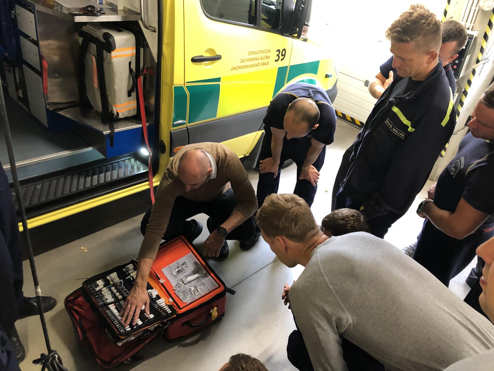 Součástí kurzu byla rovněž přednáška a exkurze v sídle Zdravotnické záchranné služby Jihomoravského kraje, kde se posluchači seznámili mj. s organizací ZZS, činností operátorů zdravotnického operačního střediska, vybavením a ovládáním prostředků sanitního vozu, speciální technikou ZZS JMK jako jsou vozidla pro ošetření a transport většího počtu pacientů či pro biohazard team, nebo např. prostředky pro transport nadrozměrných pacientů.