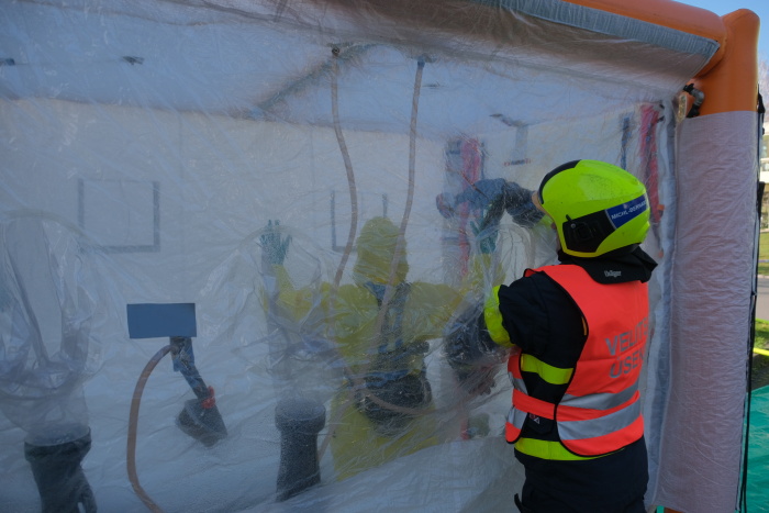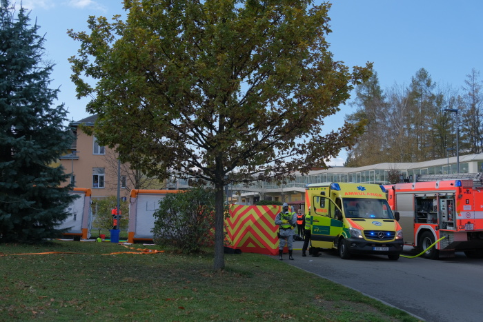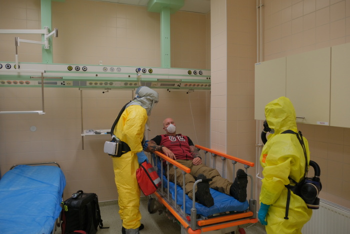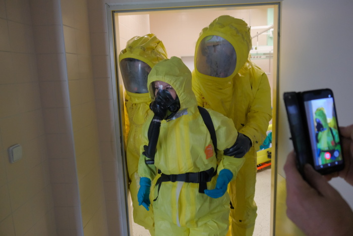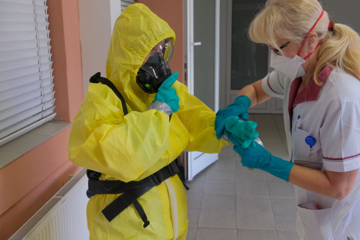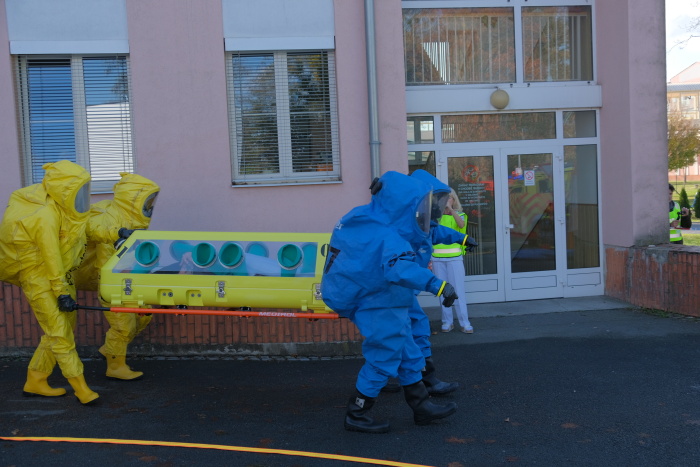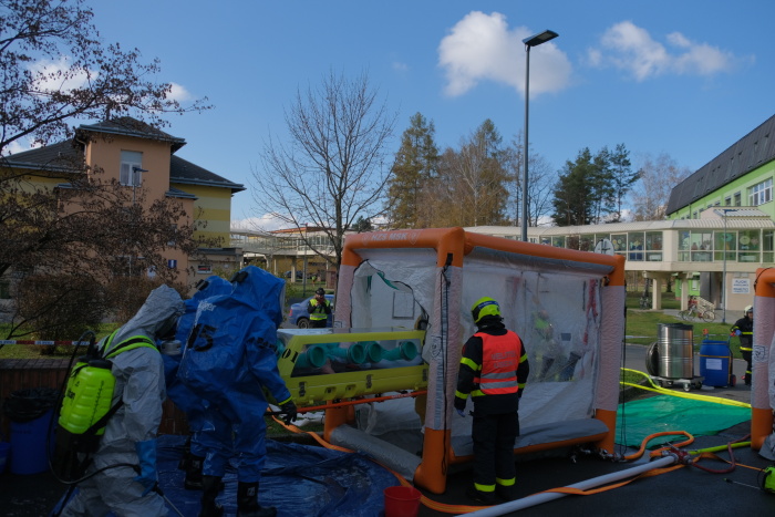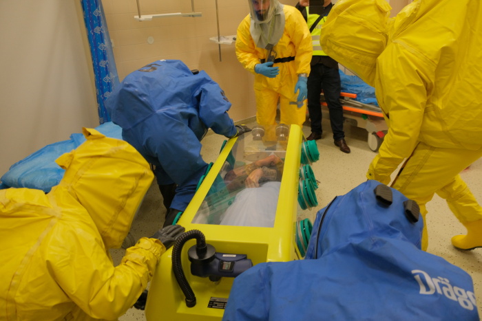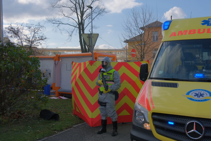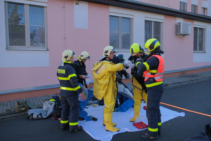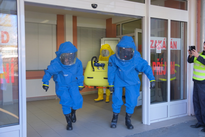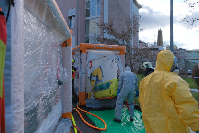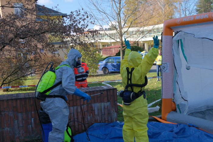 Dekontaminační sprchou musela projít také ošetřovatelka pacienta, rovněž všichni záchranáři v protichemických oblecích. Hasiči pak museli dekontaminovat izolační pokoj i celou cestu bioboxu s pacientem a jeho zachránci.