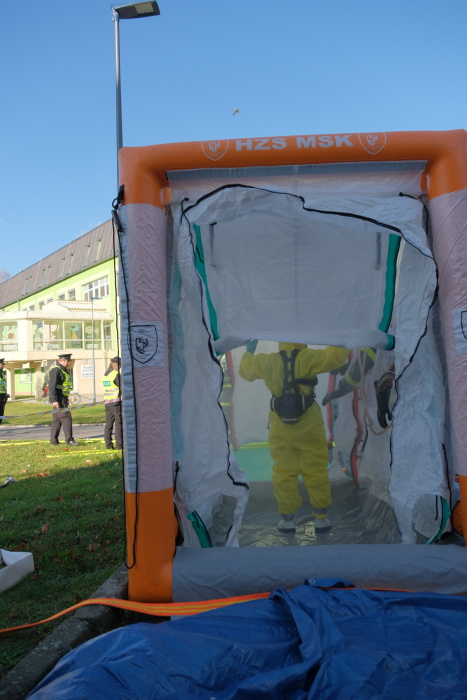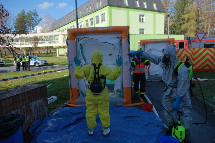 Několik desítek profesionálních hasičů (HZS MSK) zdravotníků ZZS MSK, policistů ČR, zaměstnanců krnovské nemocnice (Sdružené zdravotnické zařízení Krnov) a Krajské hygienické stanice v Bruntálu se zapojilo do čtvrtečního (7.11.2019) taktického cvičení v areálu nemocnice, zaměřené na záchranu pacienta s vysoce nakažlivou nemocí MERS i na to, aby tato neznámá nákaza neohrozila další obyvatele Krnova.