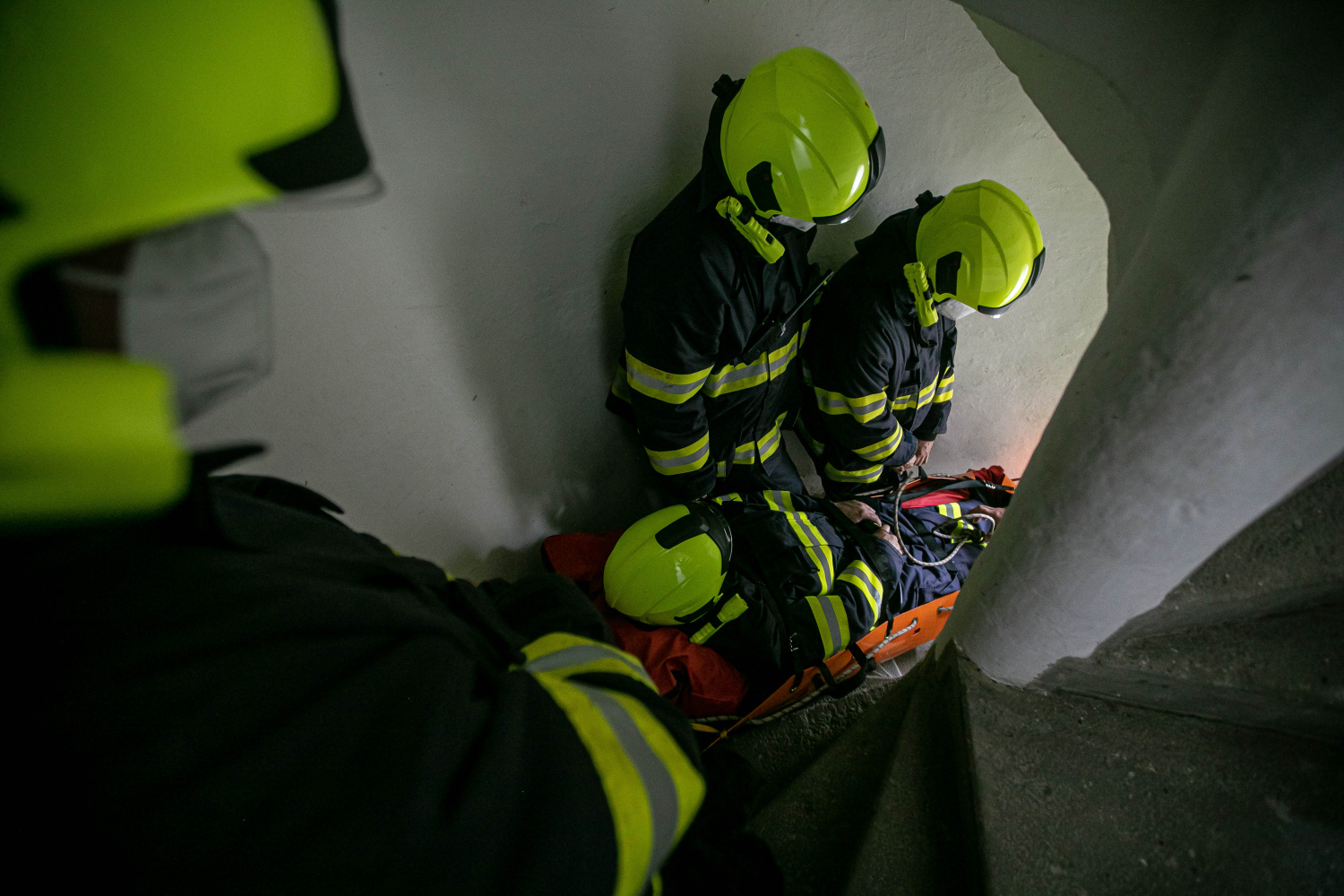 Jak je manipulace s pacientem v transportních prostředcích ve stísněných prostorech labyrintu schodišť obtížná, to cvičili profesionální hasiči ze stanice Dvůr Králové nad Labem a JSDH Žireč a Verdek.
