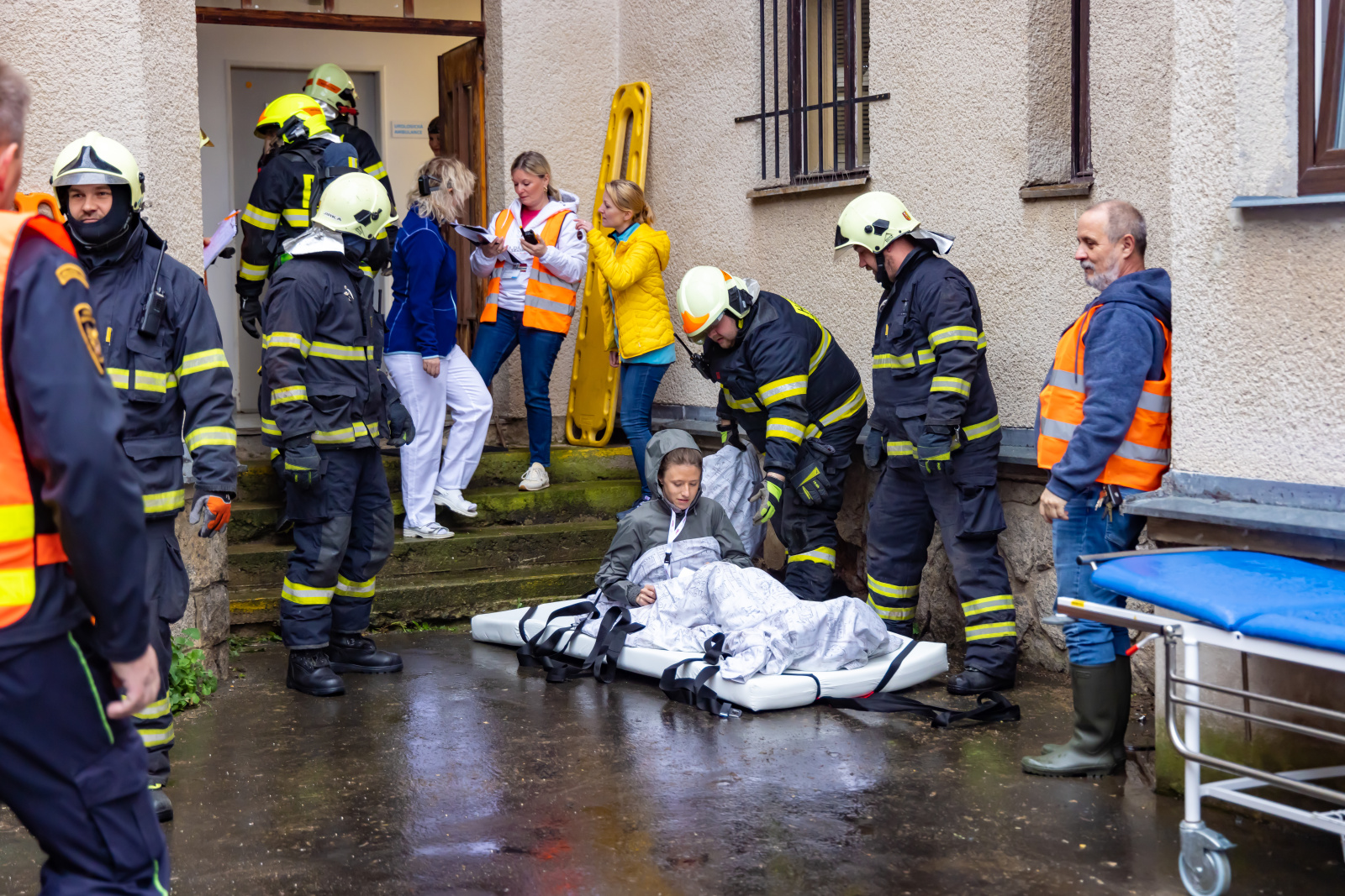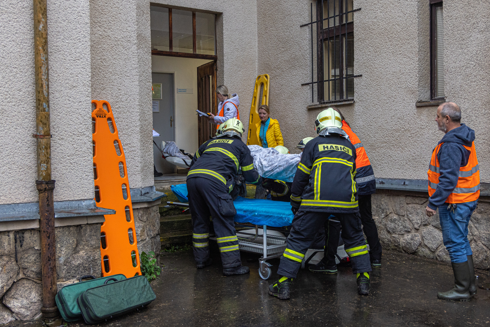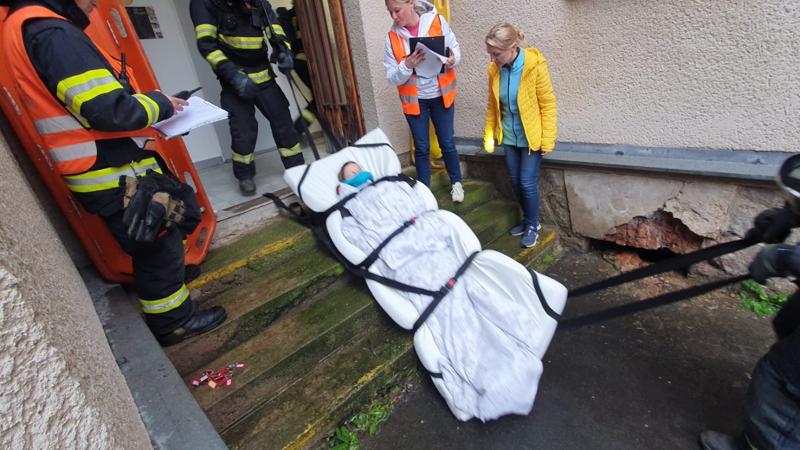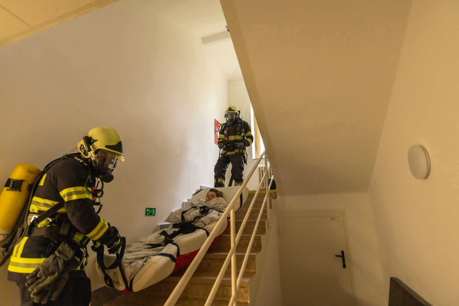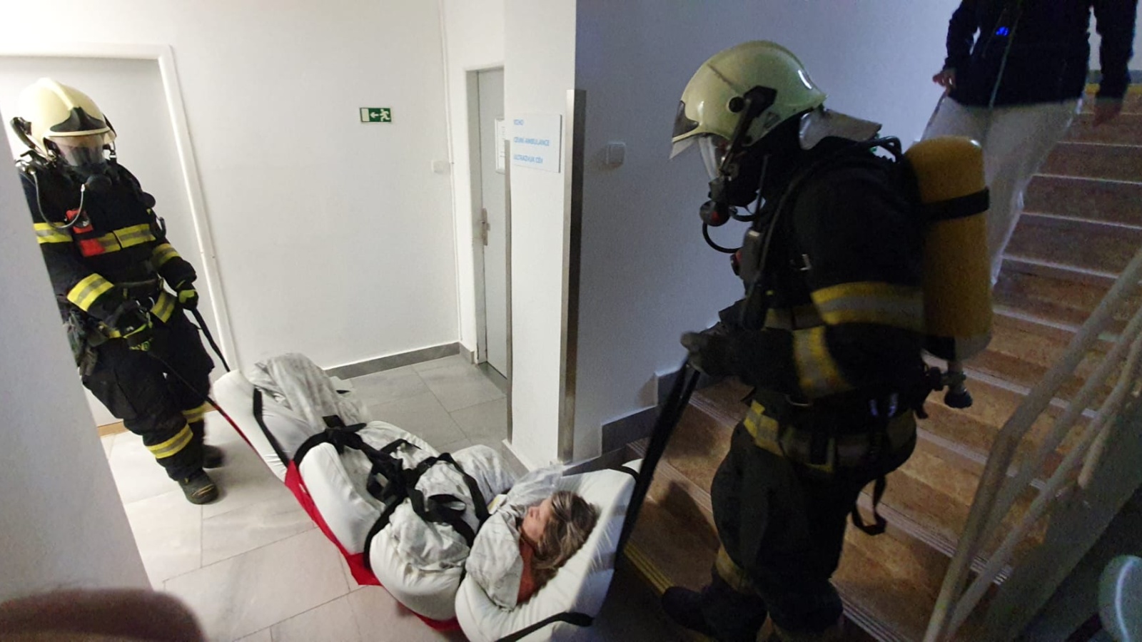 Fiktivní vypnutí přívodu medicinálních plynů a energií do budovy proběhlo před příjezdem jednotek pověřeným pracovníkem nemocnice. Velitel zásahu po příjezdu na místo události obdržel od zástupce nemocnice informaci o počtu osob, které je potřeba evakuovat, případně kolik osob z řad personálu už objekt opustilo. Evakuaci pacientů zajišťovaly tři skupiny hasičů v dýchacích přístrojích za použití speciálních evakuačních plachet, které umožňují transport imobilních osob i s matrací. Tyto plachty jsou v majetku nemocnice a lůžka jsou jimi vybavena.