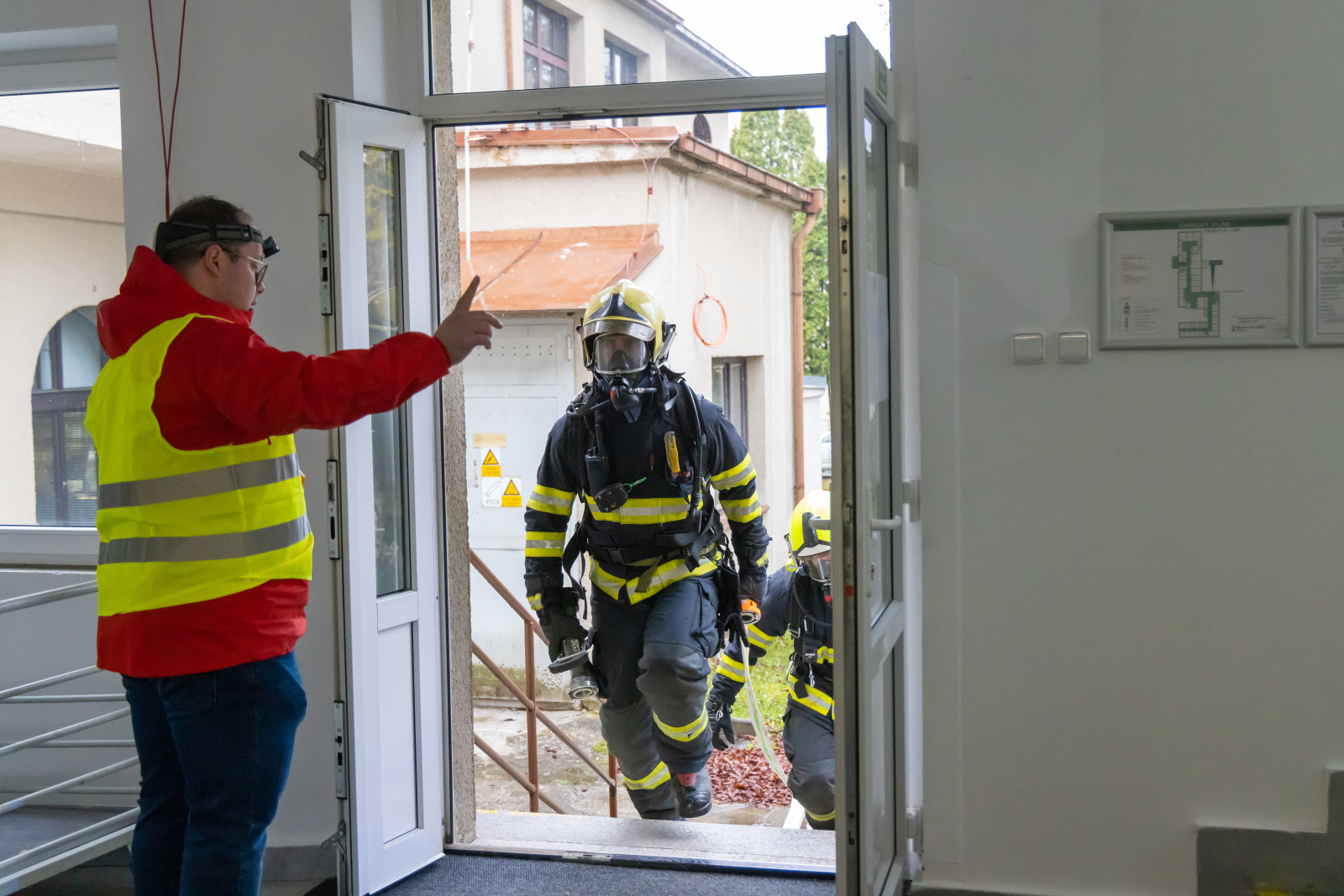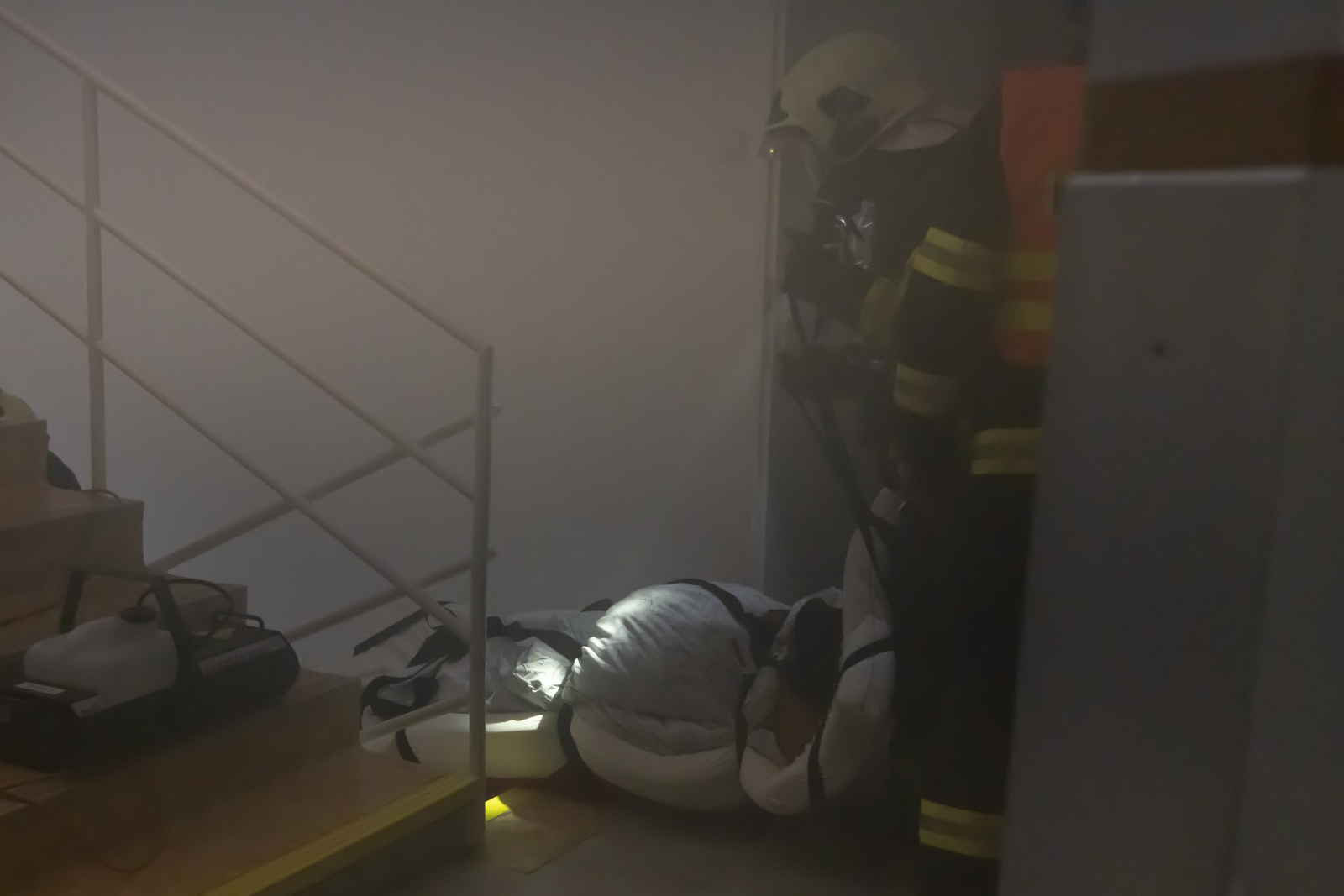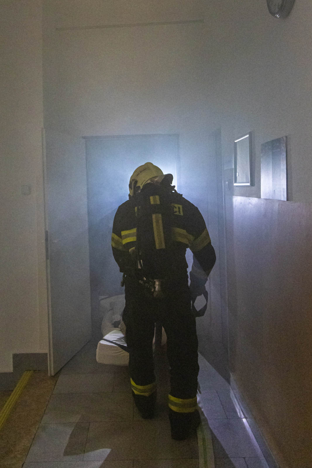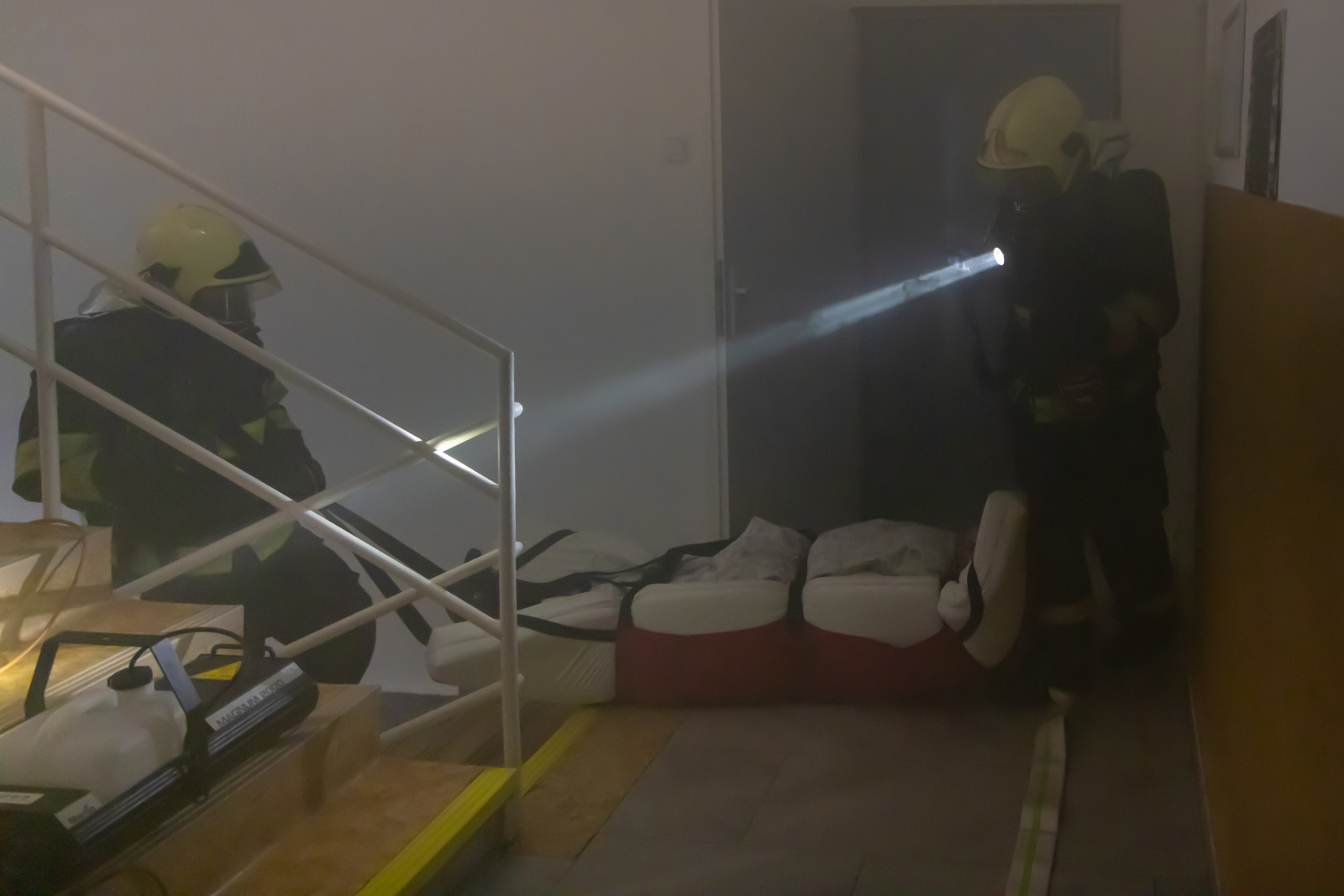 V souběhu se záchranou a evakuací osob bylo vytvořeno dopravní vedení B75 z CAS 30 před boční vstup z ulice Bezručova a tříčlenná průzkumná skupina provedla hasební zásah použitím jednoho útočného proudu C52. Zásah uvnitř objektu probíhal na sucho, pro navození reálné situace byly prostory zasažené simulovaným požárem uměle zadýmeny pomocí vyvíječe kouře.