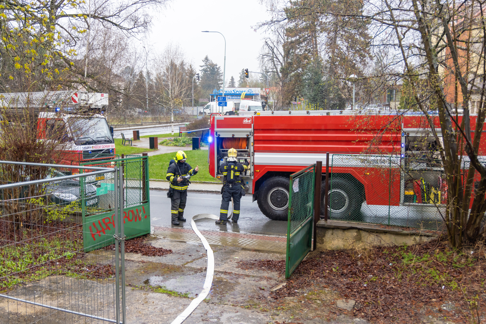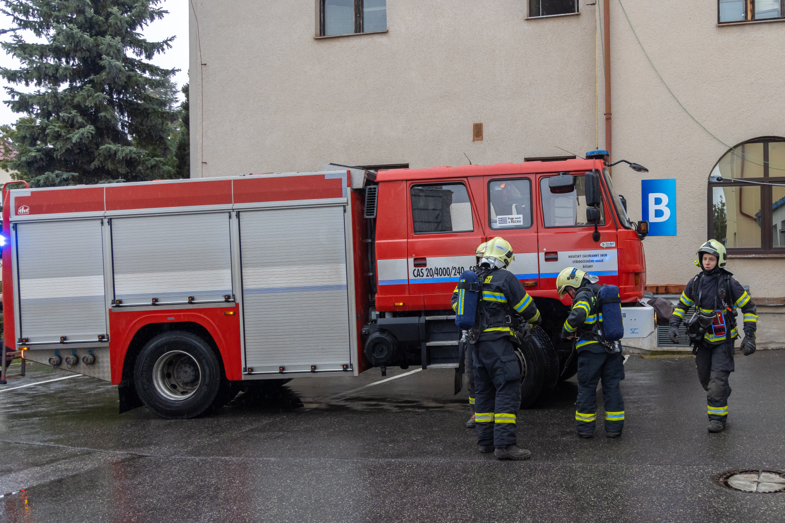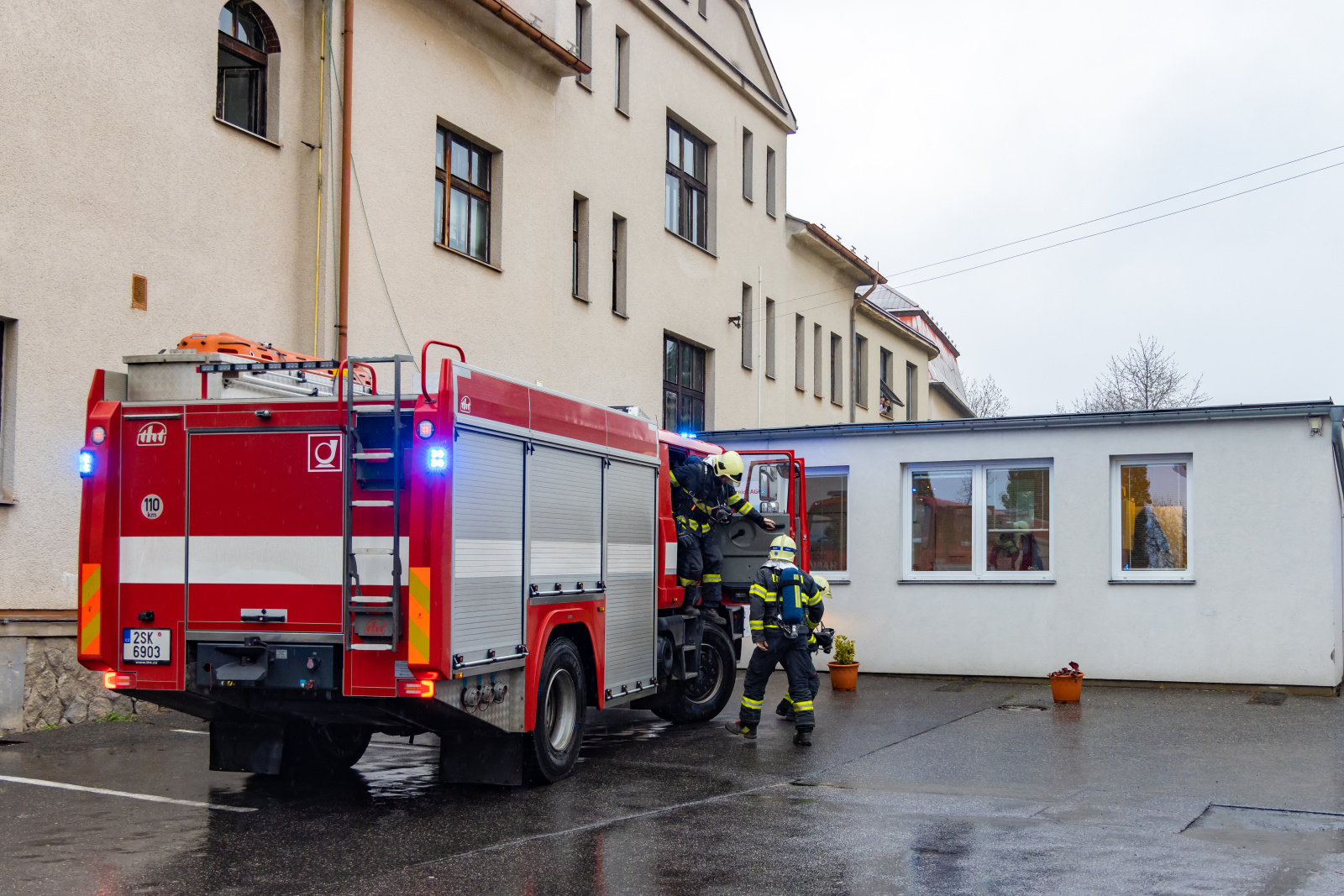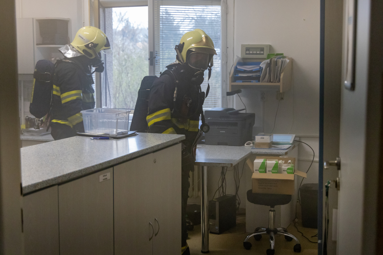 V souběhu se záchranou a evakuací osob bylo vytvořeno dopravní vedení B75 z CAS 30 před boční vstup z ulice Bezručova a tříčlenná průzkumná skupina provedla hasební zásah použitím jednoho útočného proudu C52. Zásah uvnitř objektu probíhal na sucho, pro navození reálné situace byly prostory zasažené simulovaným požárem uměle zadýmeny pomocí vyvíječe kouře.