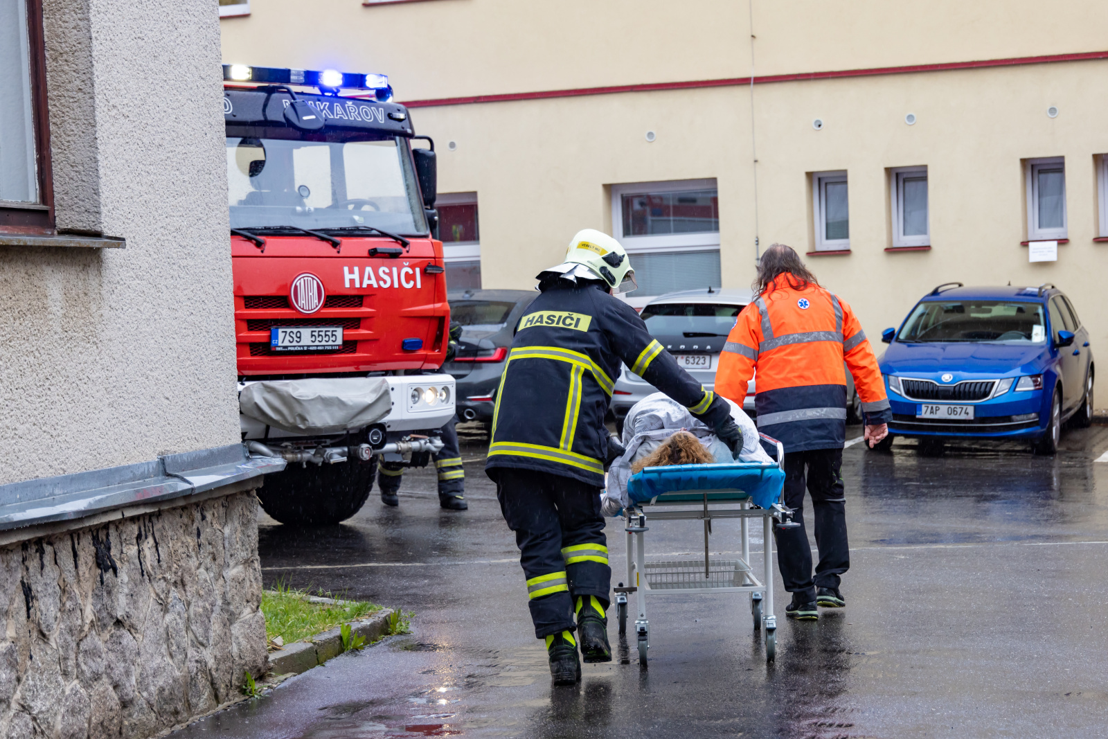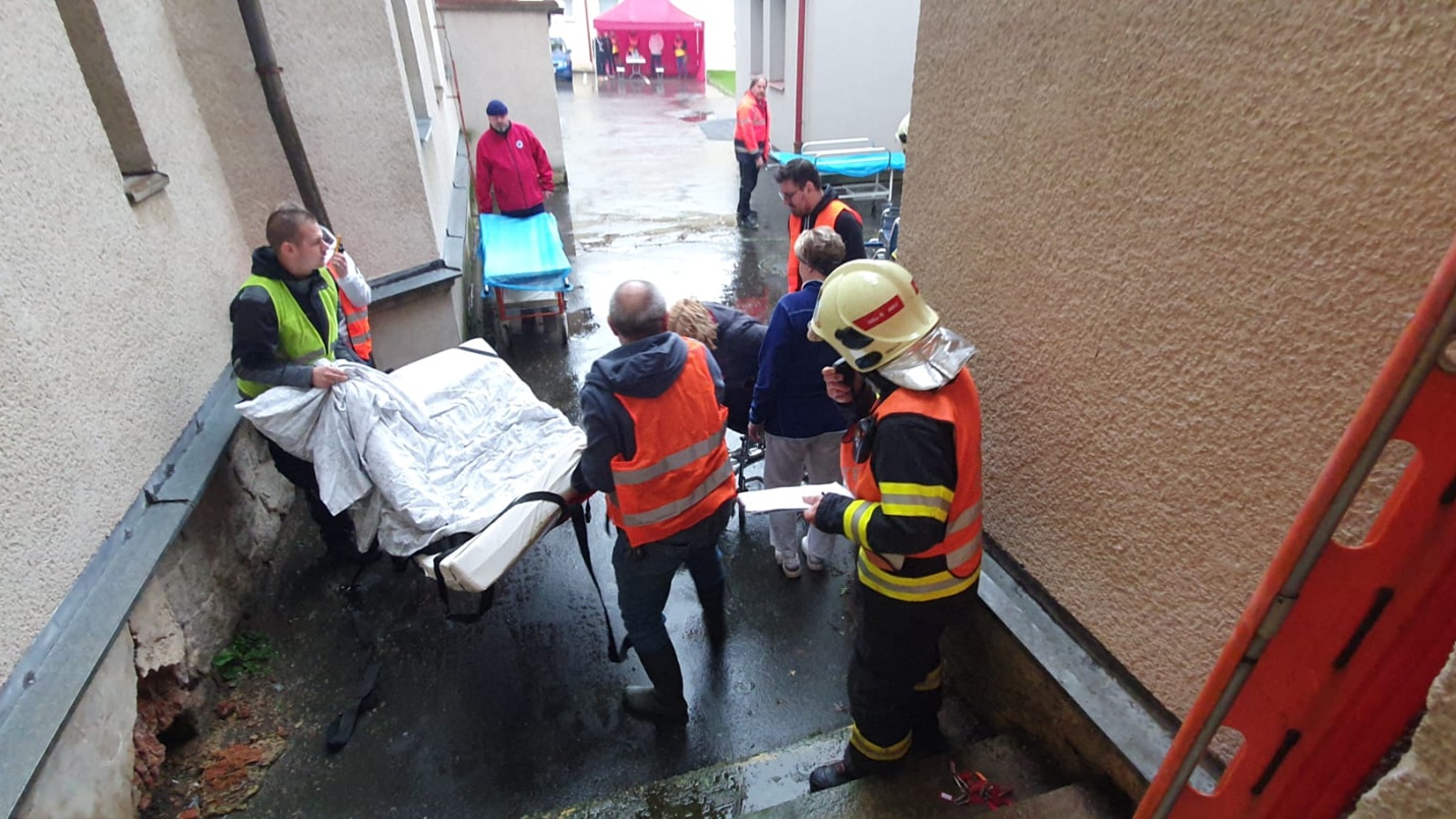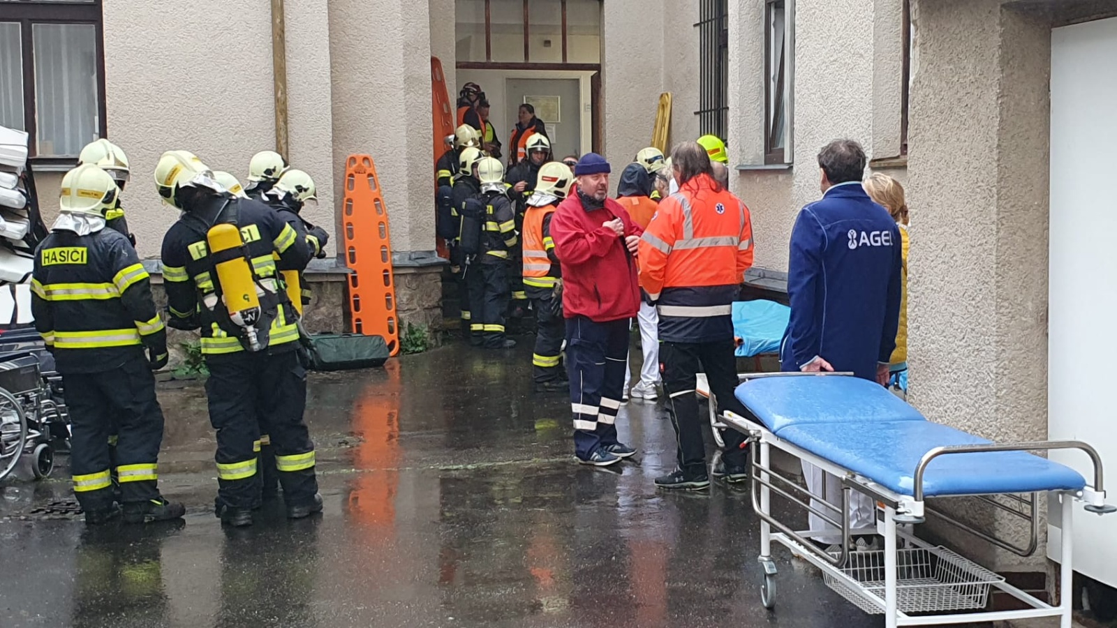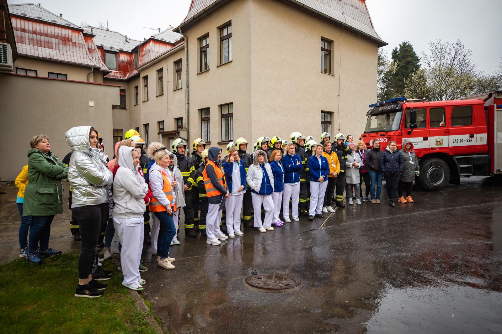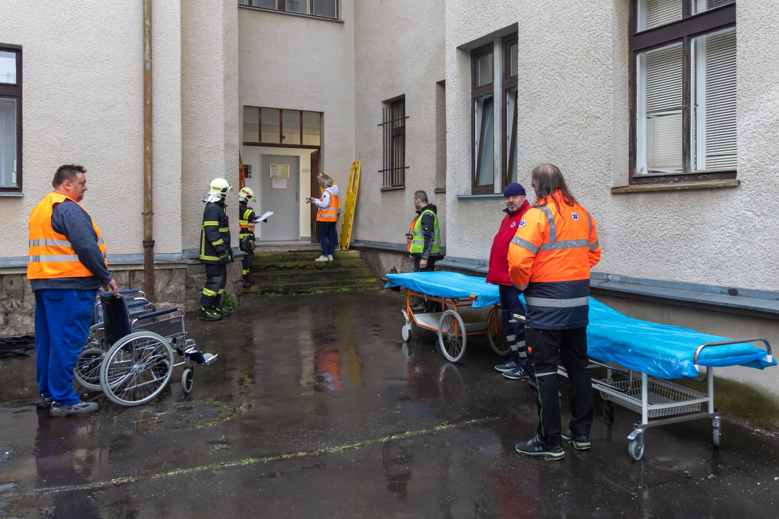 Evakuované osoby hasiči soustřeďovali u bočního vstupu, který vede na nádvoří areálu. Pacienty si zde přebíral k další péči personál nemocnice. Po evidenci počtu evakuovaných pokračoval jejich odsun na shromaždiště osob do objektu rehabilitace a následné péče, který se nachází asi 300 metrů od hlavní budovy. Přípravu pacientů pro odsun v evakuační podložce prováděl zdravotnický personál, samotný transport osob mimo objekt zajišťovali hasiči.