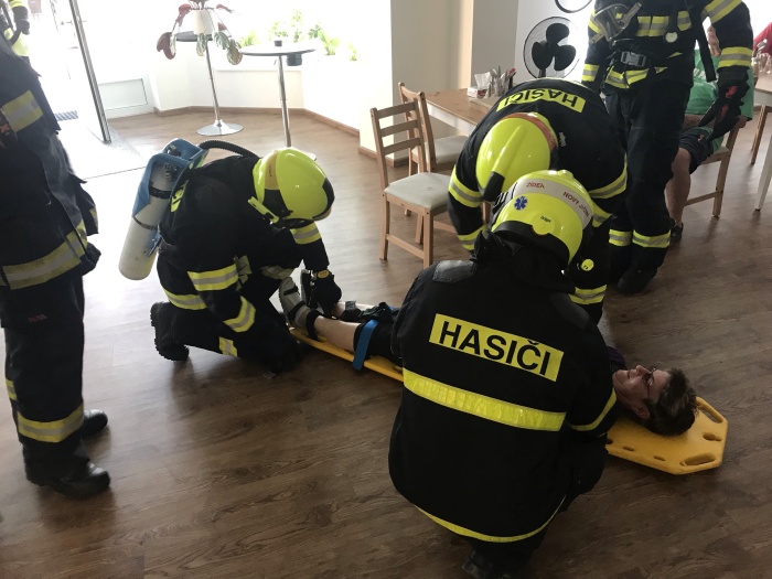 Hasiči rozvinuli hadice do nejvzdálenější části objektu a poté zahájili záchranu osob, celkem 12 chodících a 3 ležících osob, a to mj. s pomocí nosítek, páteřních desek či vyváděcích parat masek. Všichni figuranti byli klienty nebo zaměstnanci domova.