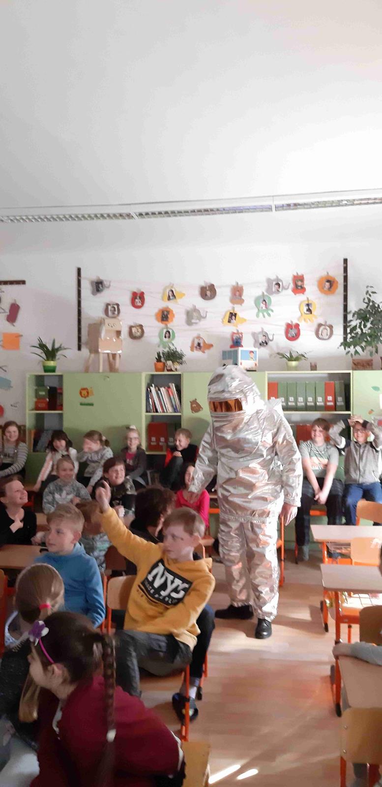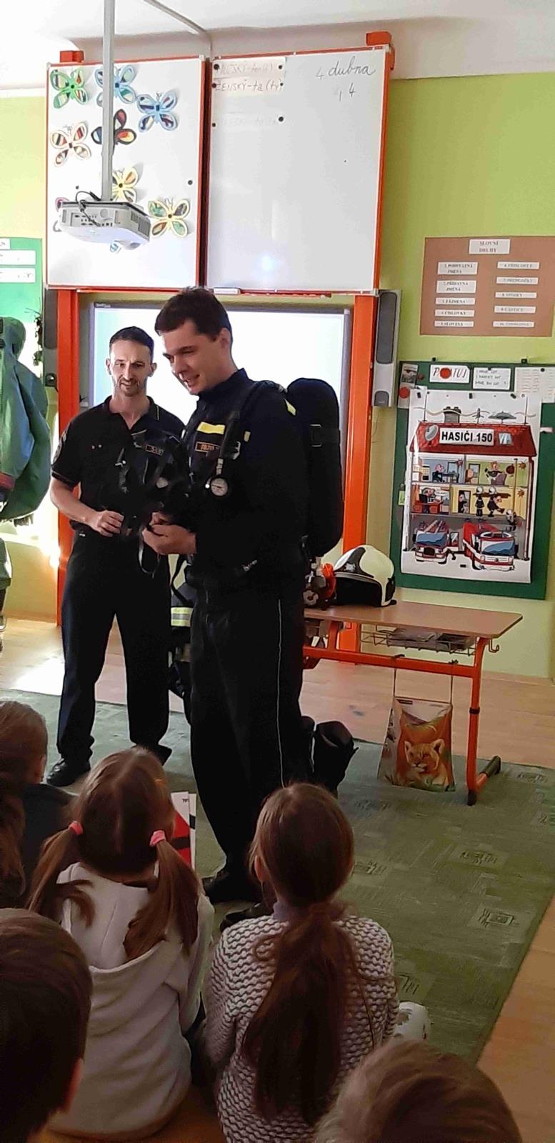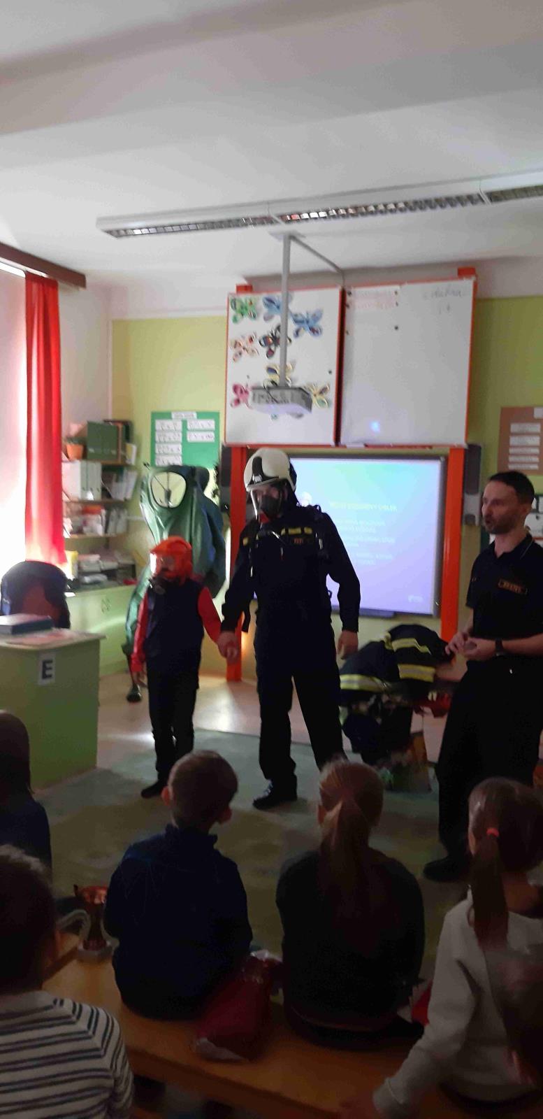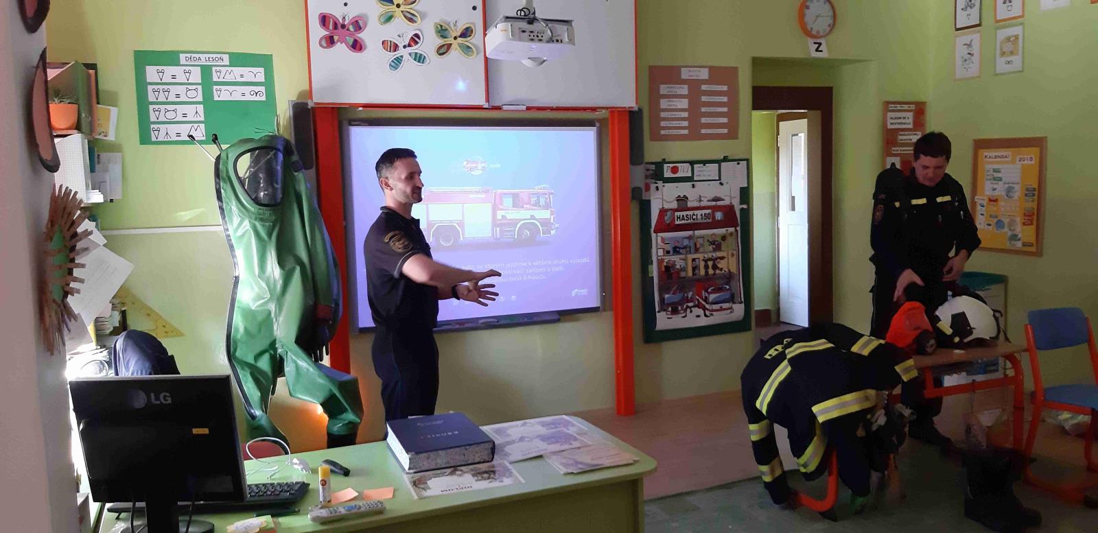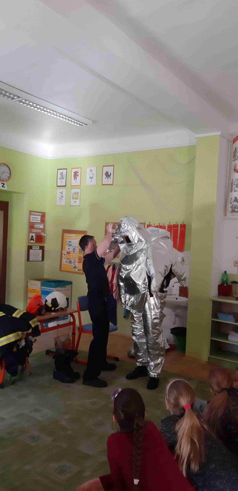 Pomocí materiálů z projektu Hasiči pro školy bylo představeno, co si hasiči na sebe oblékají při různých činnostech u zásahu. Děti na vlastní oči viděly a osahaly si vícevrstvý zásahový oblek s přilbou a zásahovou obuví, protichemický přetlakový oblek a oblek proti sálavému teplu.