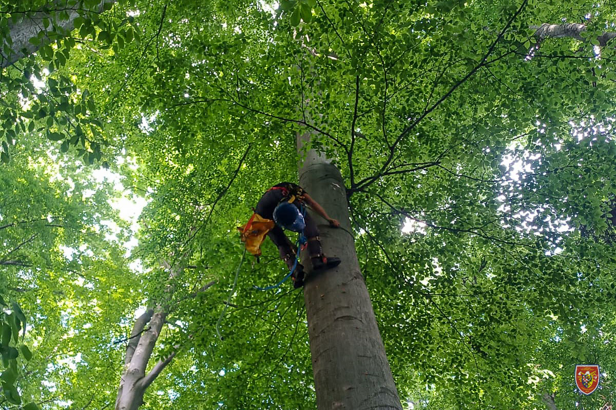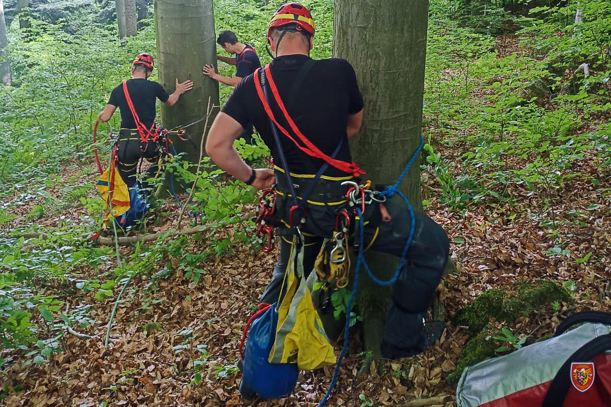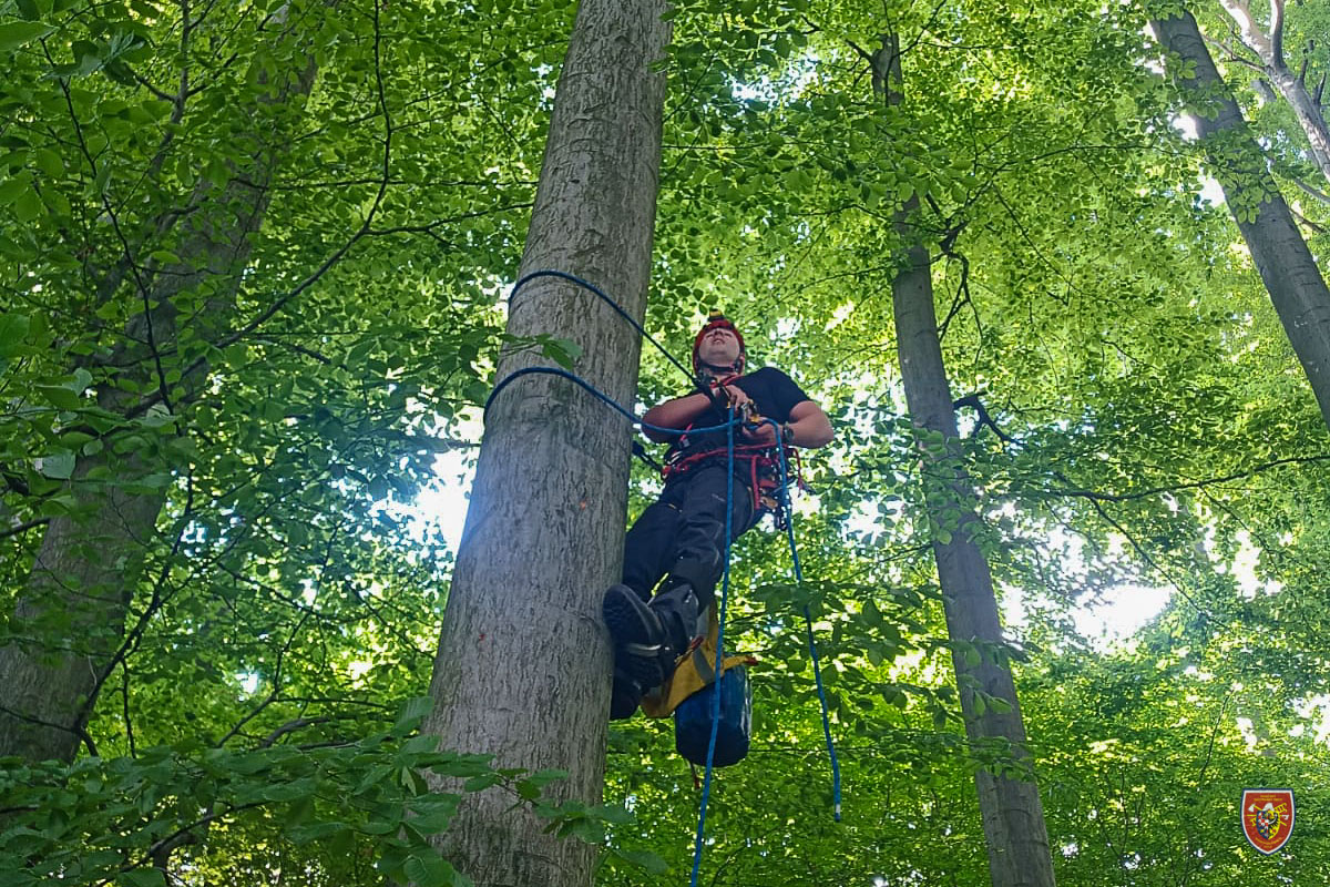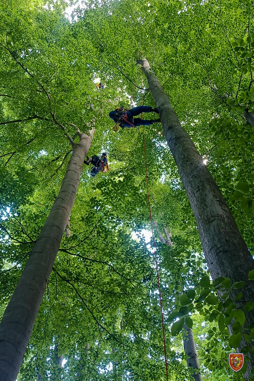 Dvojice figurantů na hasiče čekala v korunách zhruba 30 metrů vysokých buků ve velmi špatně přístupném terénu. Pro autentičnost s sebou měli i plachtu, která představovala zachycené křídlo.
