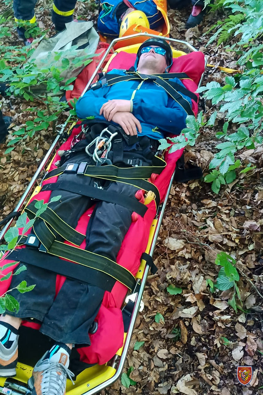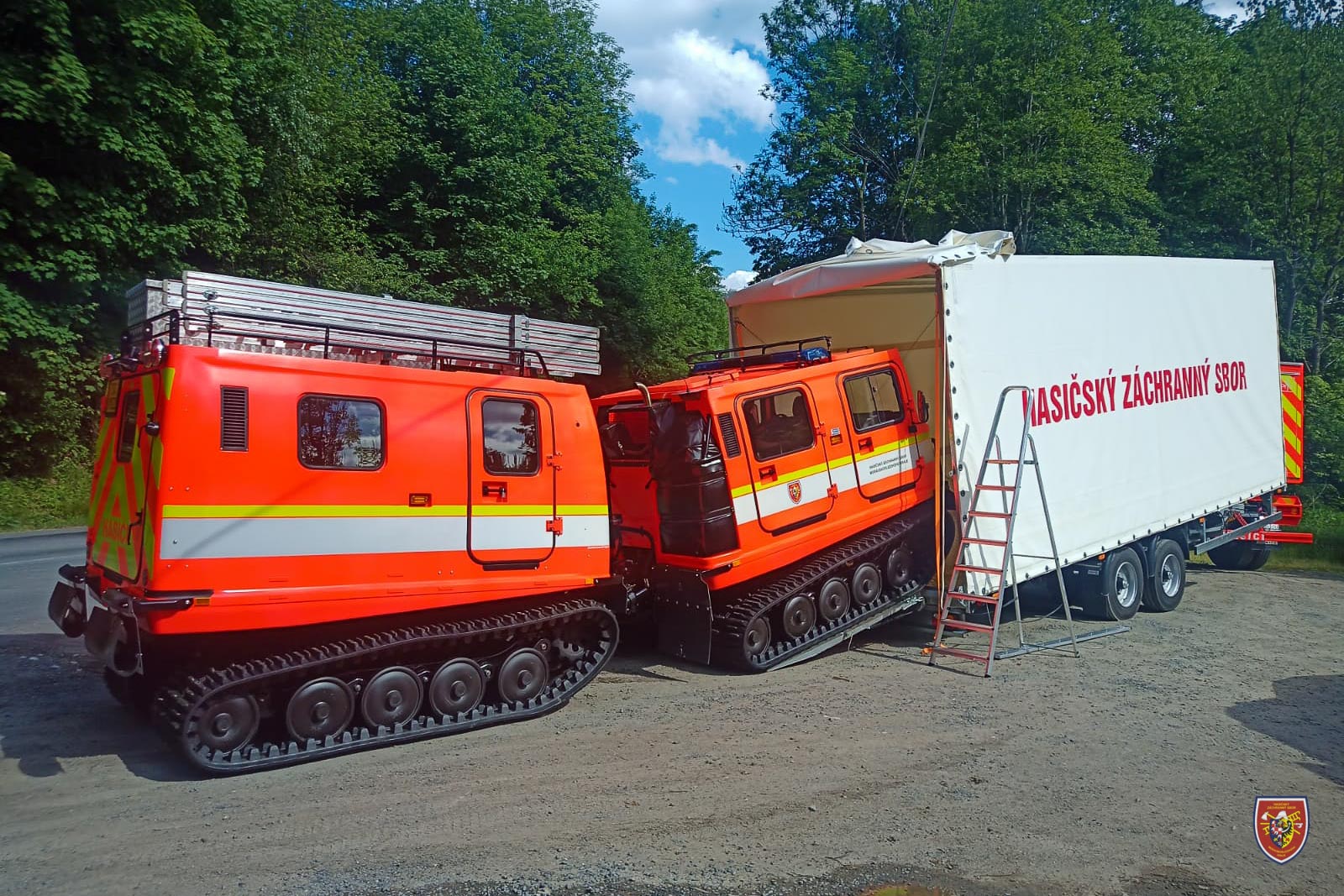 Tam je hasiči uložili na nosítka, zafixovali a převezli opět pomocí pásového vozidla k silnici.