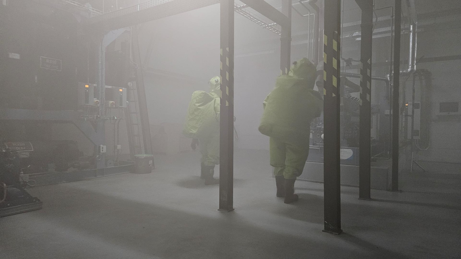 Zasahující hasiči od ostrahy objektu získali důležité informace o situaci a ověřili, že v budově se už nikdo nenachází. Na pokyn velitele zásahu byla vytyčena nebezpečná zóna, zřízeno dekontaminační stanoviště a stanovena taktika zásahu. Za použití výškové techniky bylo zahájeno skrápění odvětrávacích otvorů, aby se omezilo šíření nebezpečné látky do okolí.