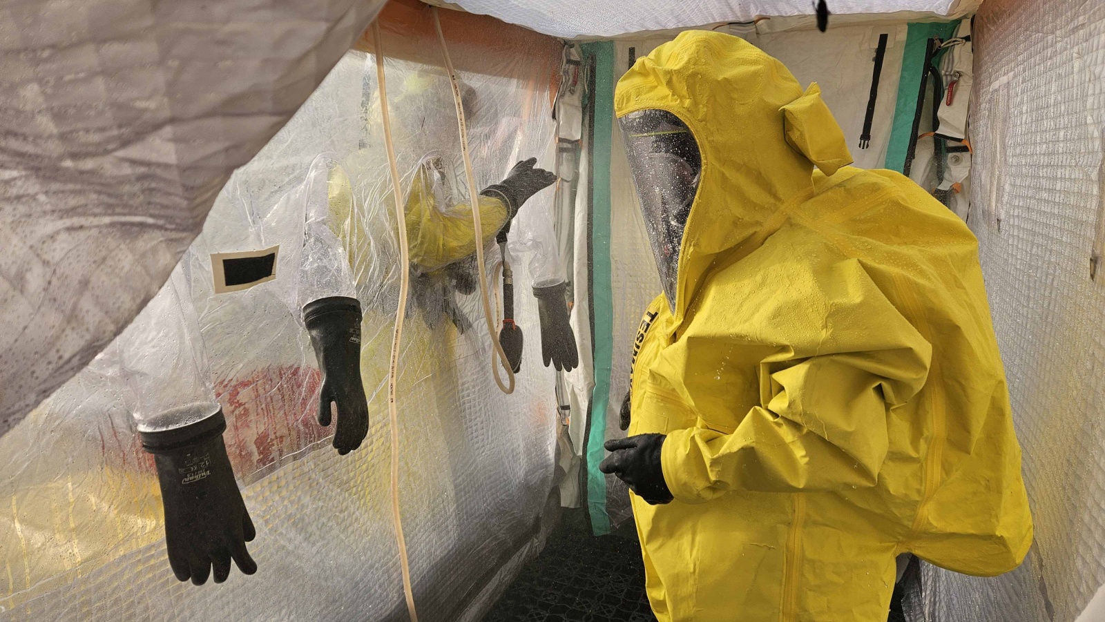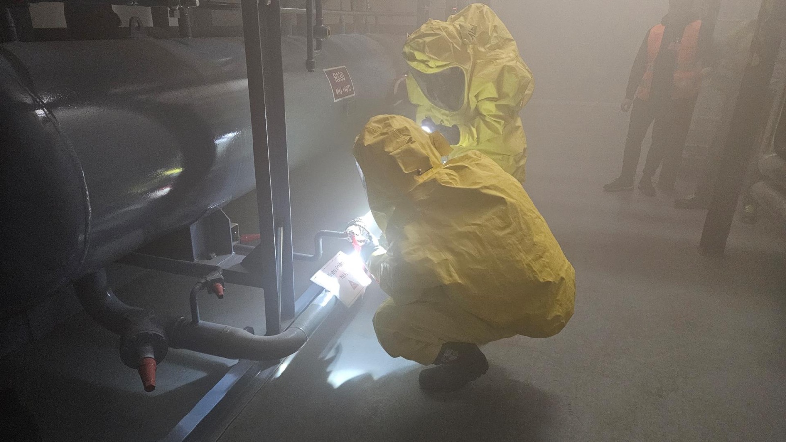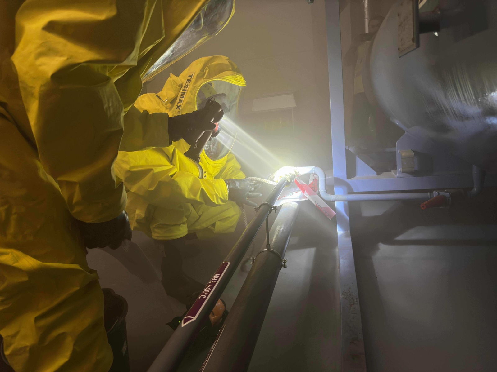Průzkumná skupina vybavená plynotěsnými obleky vstoupila do strojovny, kde pomocí termokamery lokalizovala místo úniku. Následně bylo poškozené potrubí provizorně utěsněno a zasahující hasiči podstoupili dekontaminaci. Po celou dobu zásahu probíhalo měření koncentrace nebezpečného plynu pomocí detekční techniky jak uvnitř, tak i vně objektu. Hasiči si při této příležitosti vyzkoušeli inovovanou taktiku výstavby dekontaminačního stanoviště, která je efektivnější s ohledem na čas a počet zapojených příslušníků.