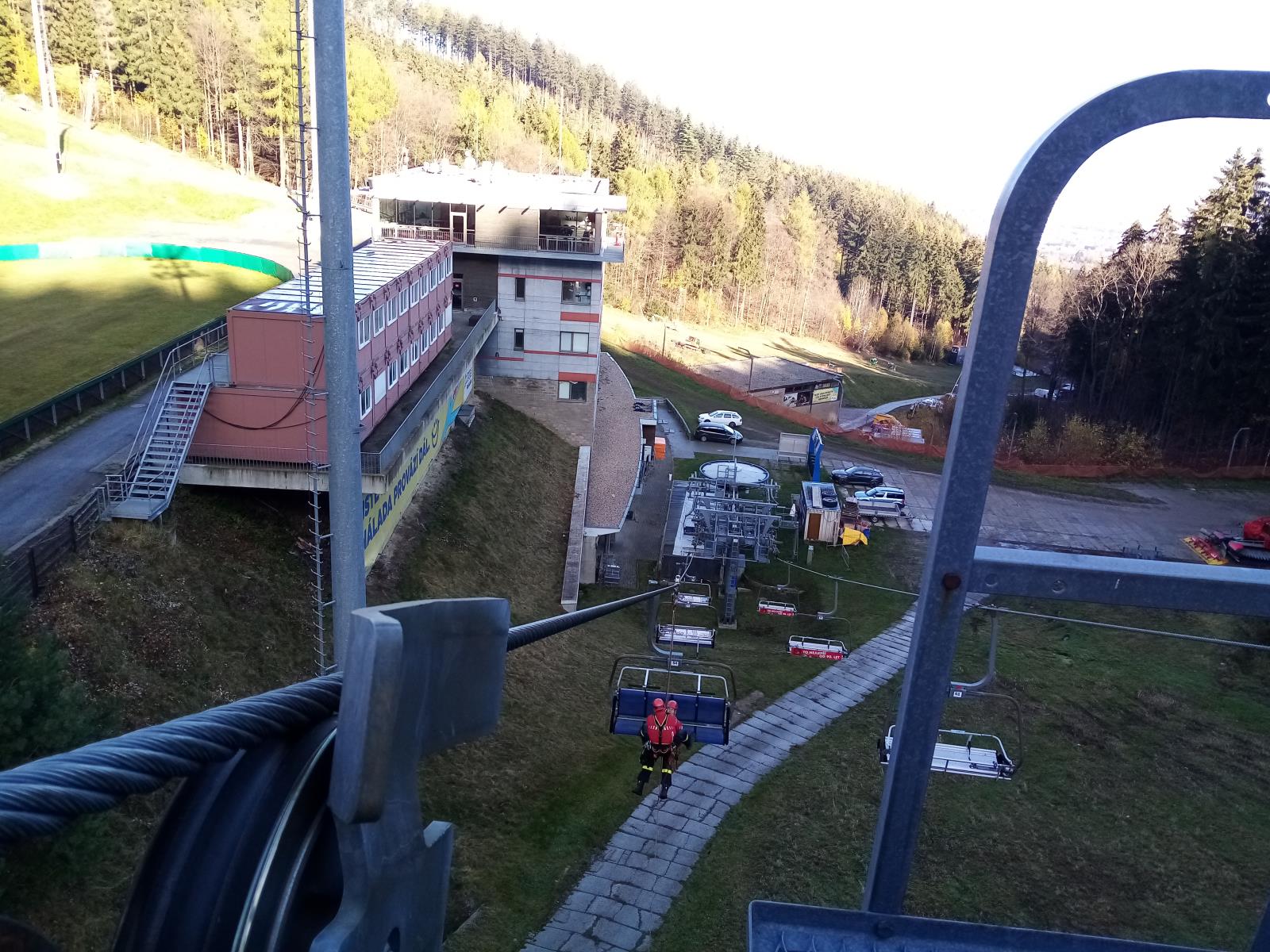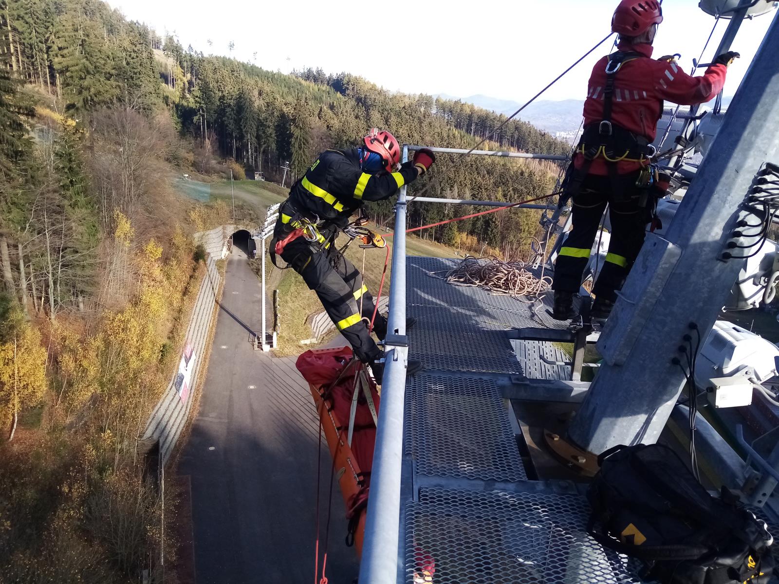 Připravenost hasičů – lezců v listopadu prověřila hned tři cvičení (11., 18. a 25. 11.) se stejným tématem – záchrana osob ze sedaček lanové dráhy. Postupně byly využity pro simulovaný zásah lanové dráhy na Skalce nebo v lokalitě Obřího sudu.