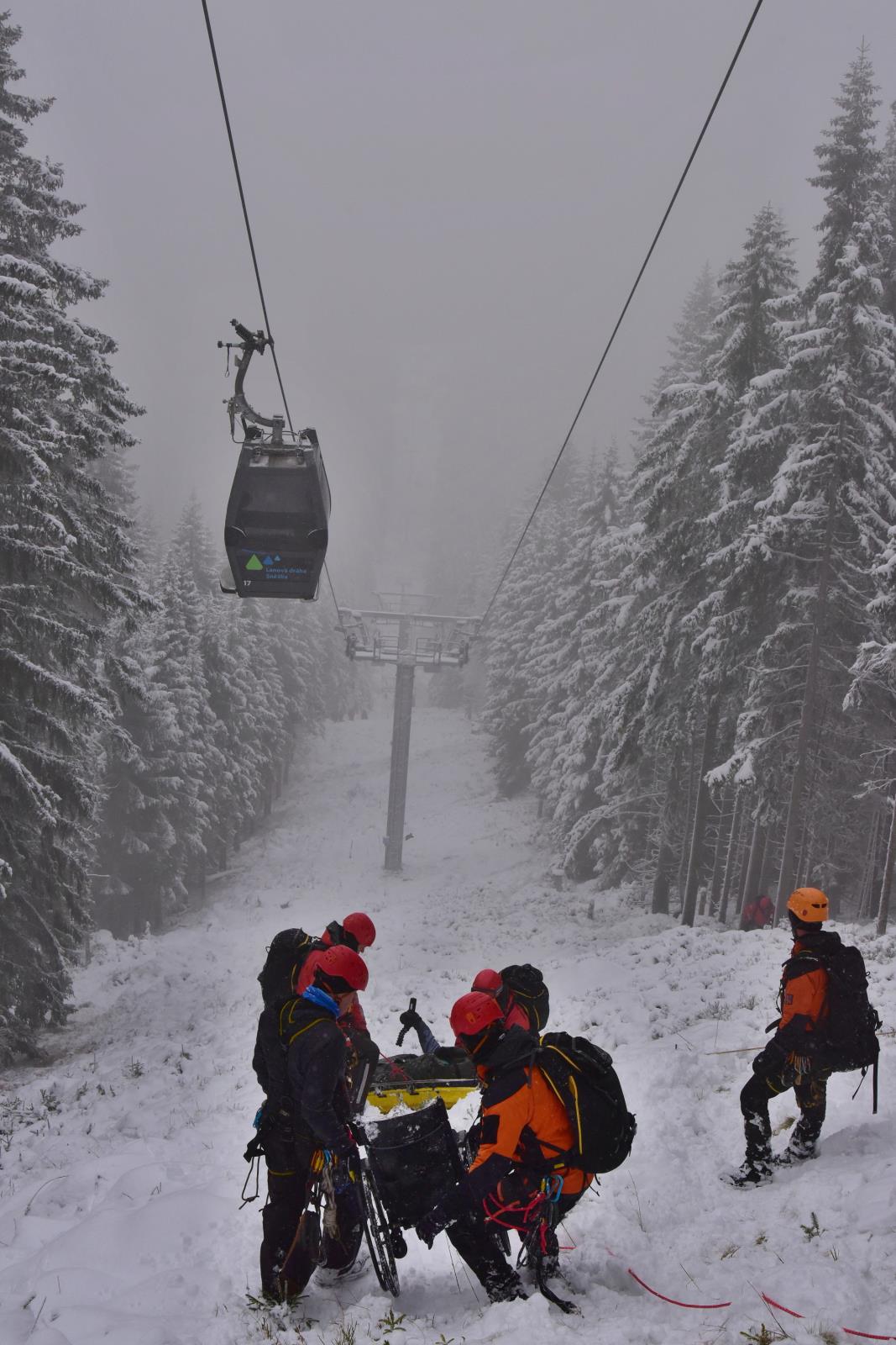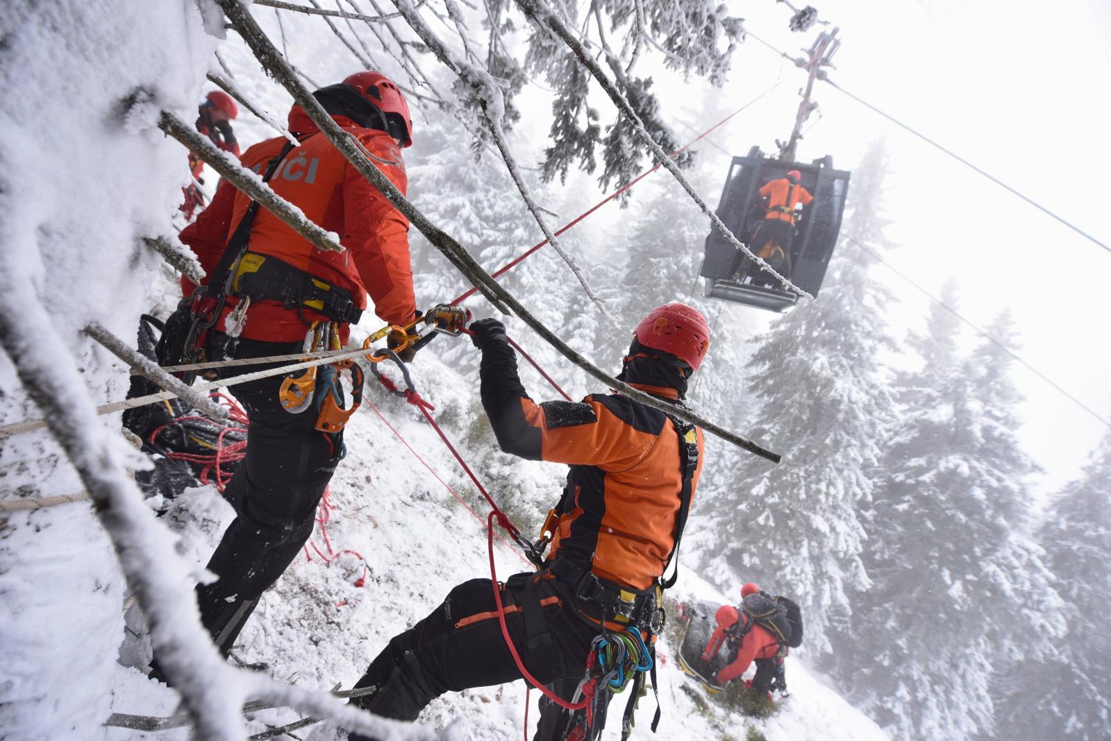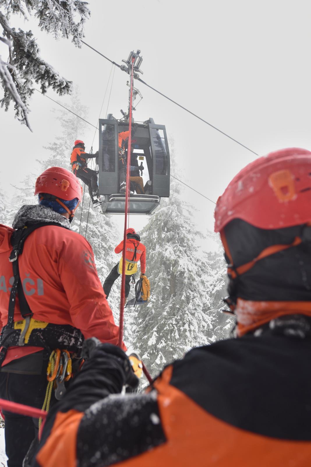 Doslova reálné zimní podmínky měli hasiči a horští záchranáři v Krkonoších, kde cvičili v pondělí 21. 11. 2022 na lanové dráze na Sněžku. Přes 50 záchranářů – profesionální hasiči se specializací na záchranu z výšky a nad volnou hloubkou ze všech územních odborů Královéhradeckého kraje a členové horské služby z ČR i Polska cvičili záchranu osob z kabinek porouchané lanovky za pomocí lanové techniky na úseku z Pece pod Sněžkou na Růžovou horu. Mezi figuranty byli také dva speciální hosté – naši kolegové Libor a Martin, kteří jsou na invalidním vozíku. Procvičili jsme si tak netradičně i evakuaci vozíčkářů a dále jejich transport těžko přístupným horským terénem přímo pod lanovkou.