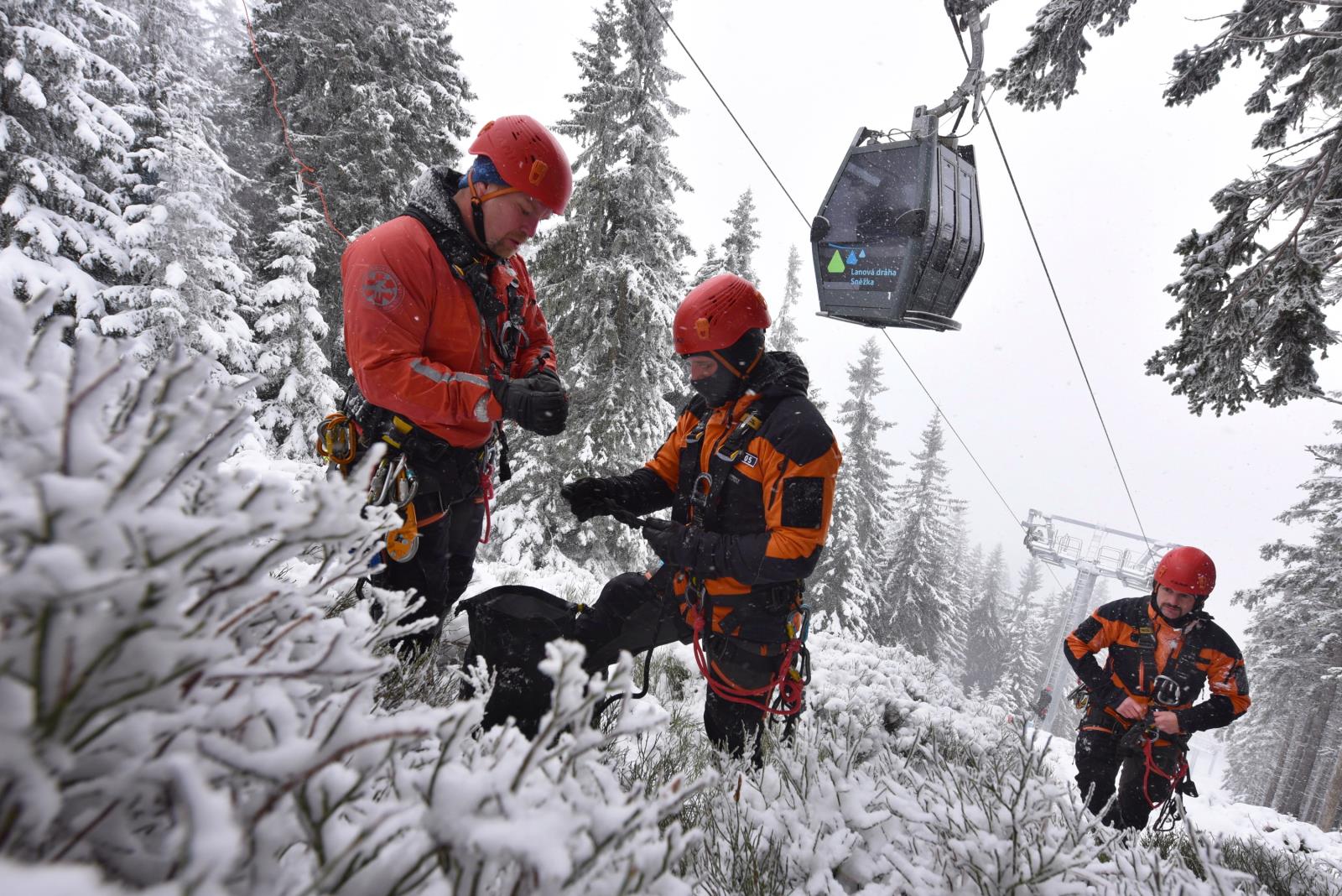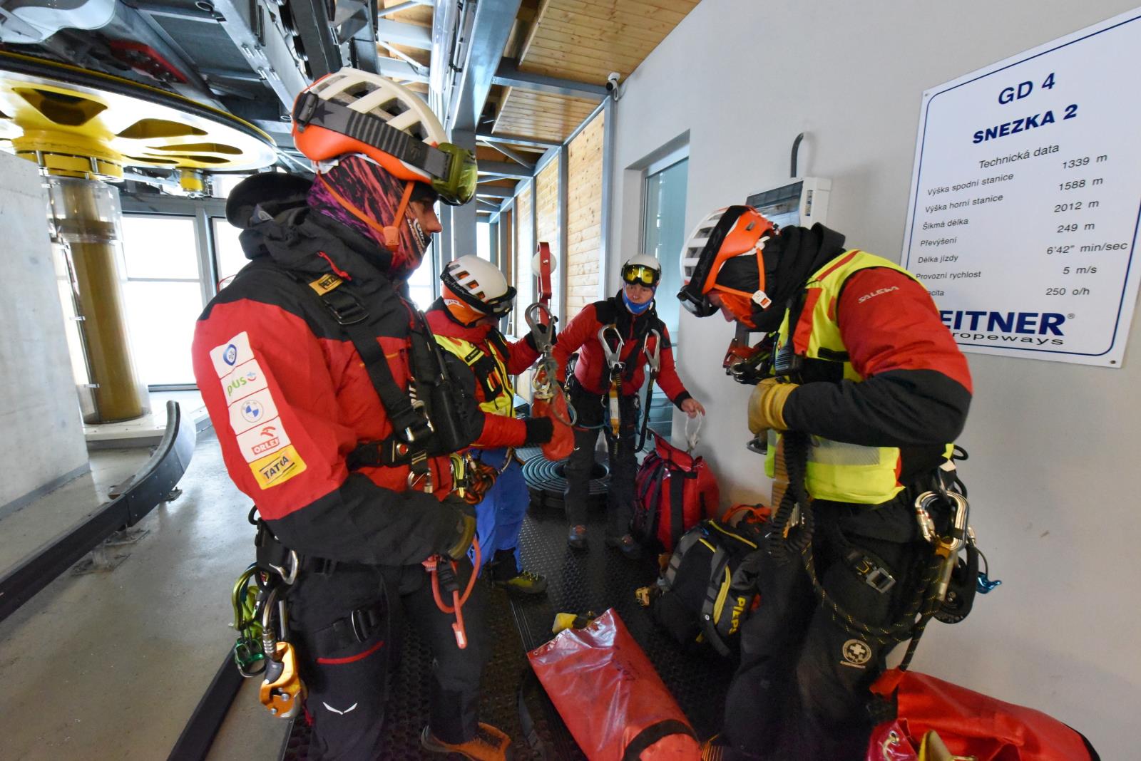 Hasiči a horská služba cvičili záchranu osob z lanovky na Sněžku
