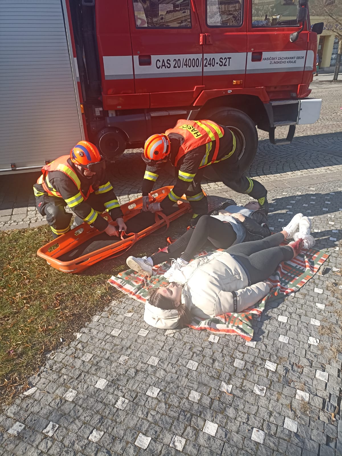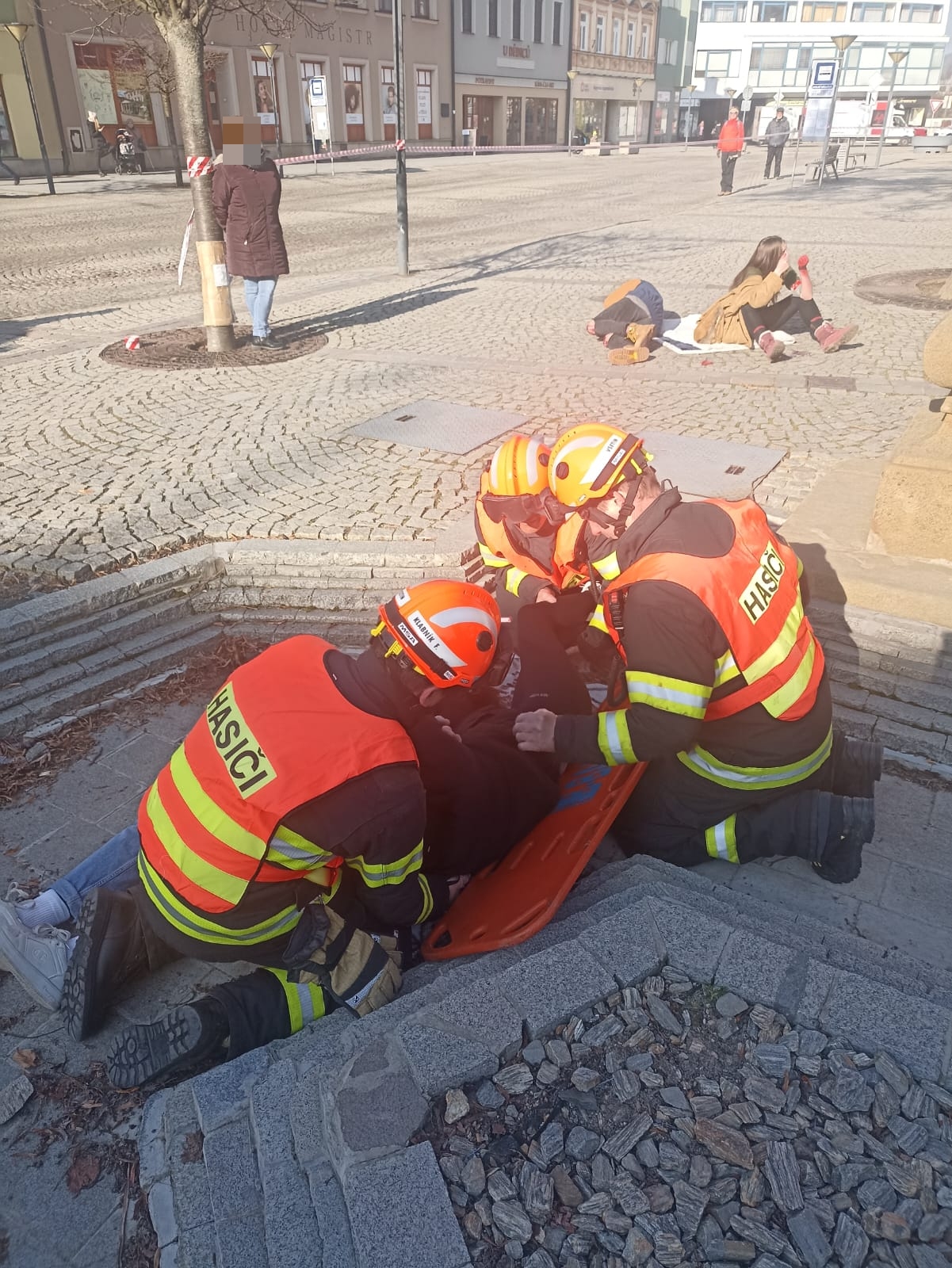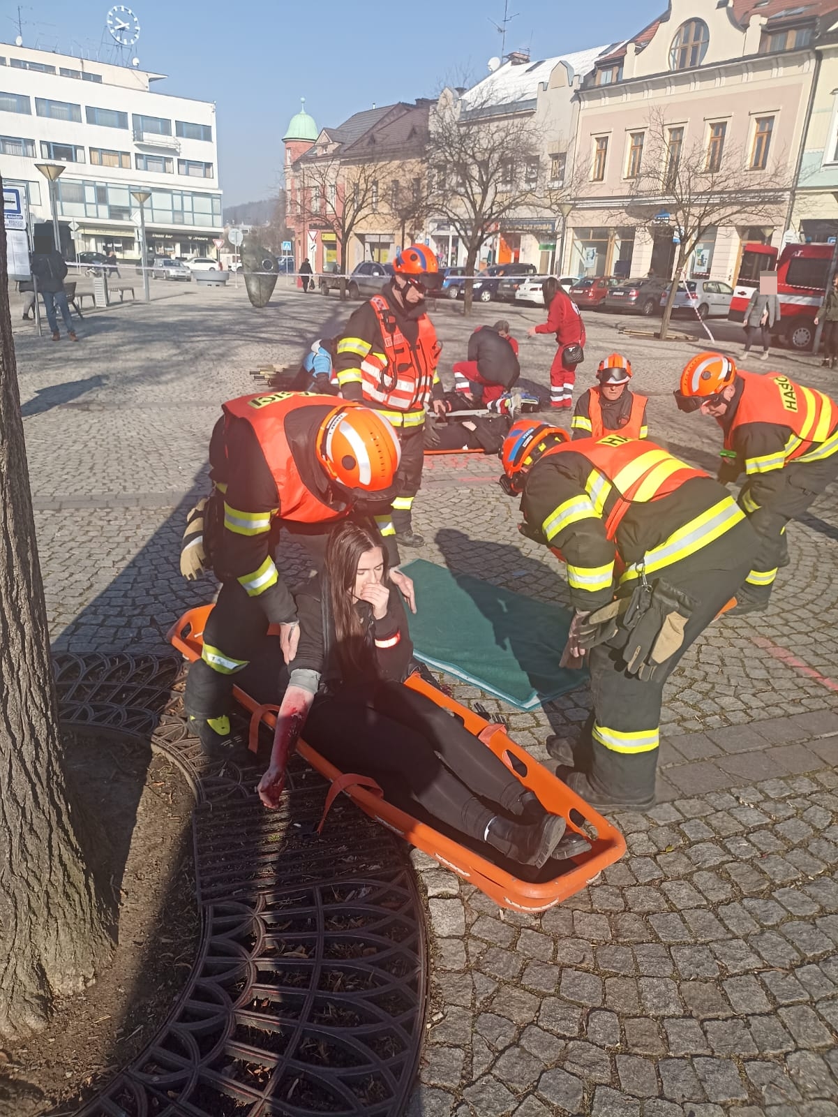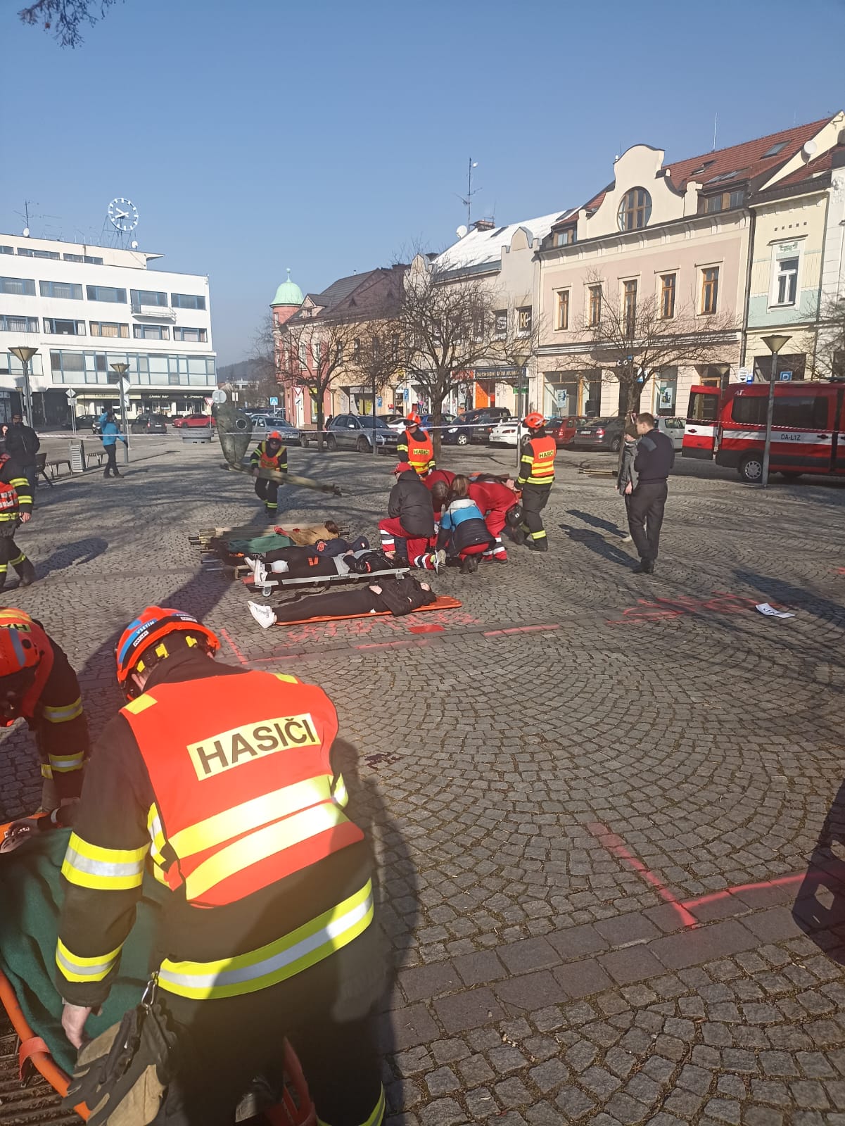 Profesionální hasiči si vybírají různá místa k realizaci svých činností tak, aby simulovali co nejvěrohodněji reálnou situaci a cvičení bylo co nejefektivnější v procvičení různých taktik zásahu. Takovýmto místem se dnes dopoledne stalo Dolní náměstí ve Vsetíně. Kolemjdoucí občané tak mohli vidět hasiče a nejen je ty  v akci. Figuranty si zahráli studenti Střední zdravotnické školy Vsetín. Dalšími zúčastněnými byli i zástupci ČČK – oblastní spolek Vsetín. Všem tak patří velké poděkování za pomoc při realizaci tohoto cvičení.