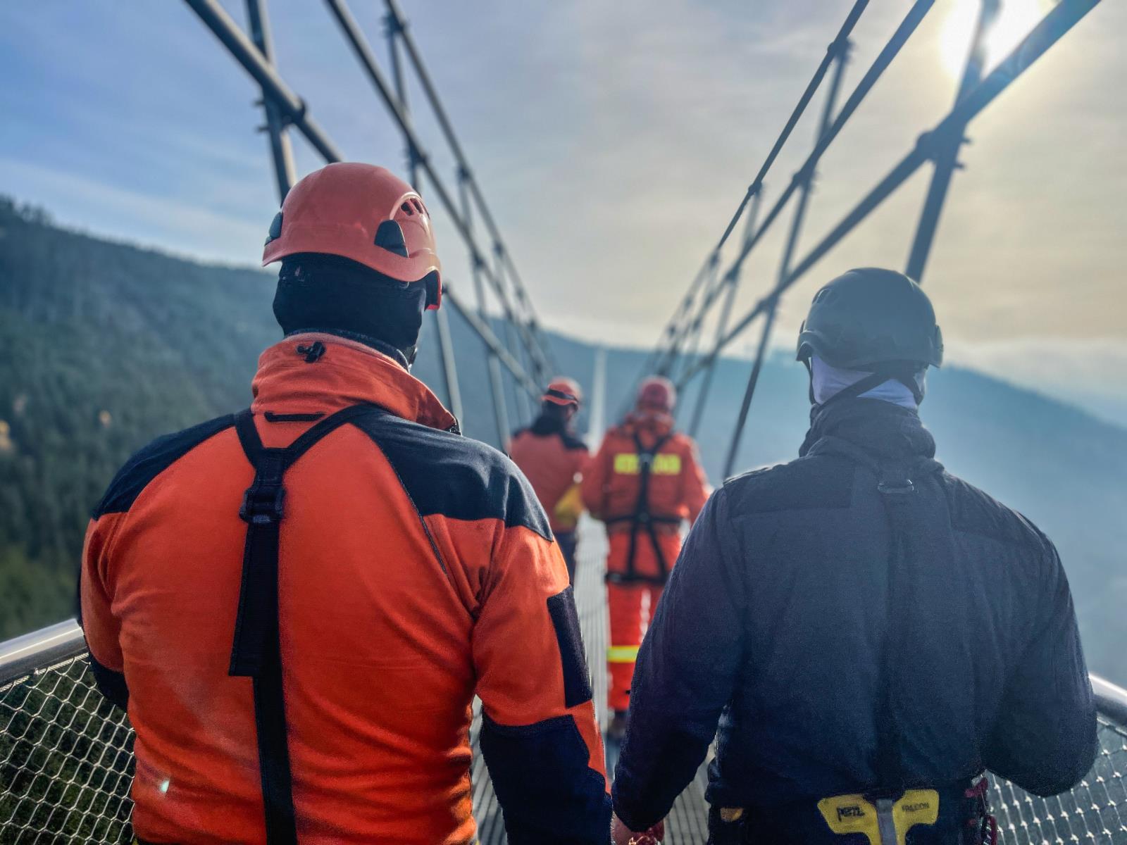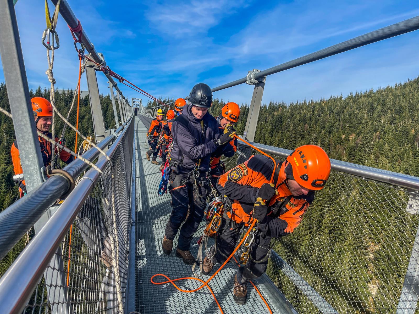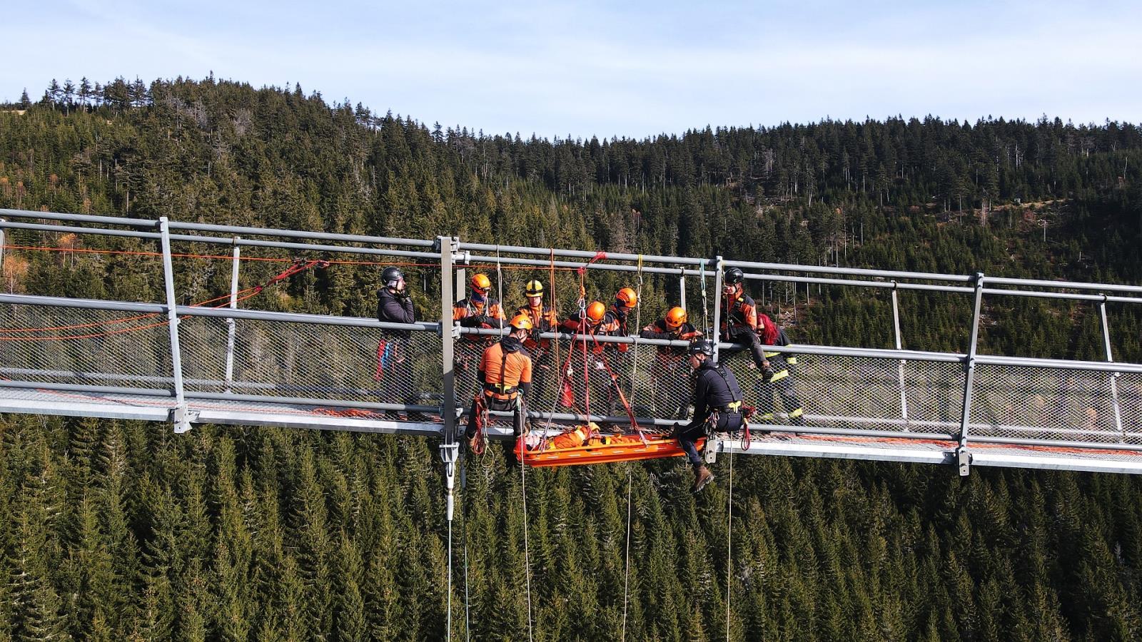Naši hasiči se nejprve seznámili s problematikou výškových turistických atrakcí. Následně procvičili záchranu vyčerpaného servismana z konstrukce lanového mostu, který je ve výšce 95 metrů nad horským údolím. Zraněného technika zajistili a poskytli mu první pomoc. Výzvou pak bylo jeho uložení do nosítek nad volnou hloubkou.