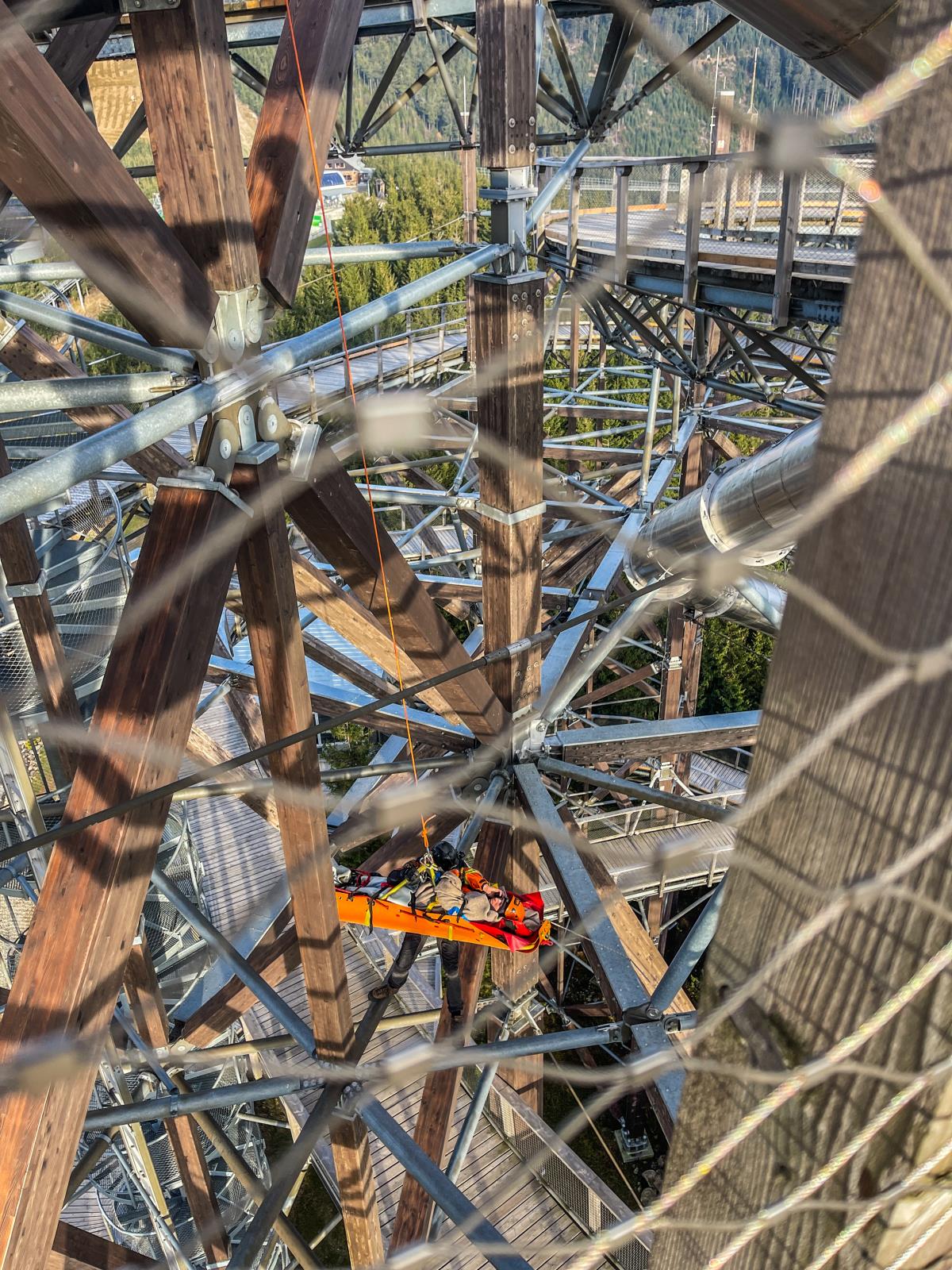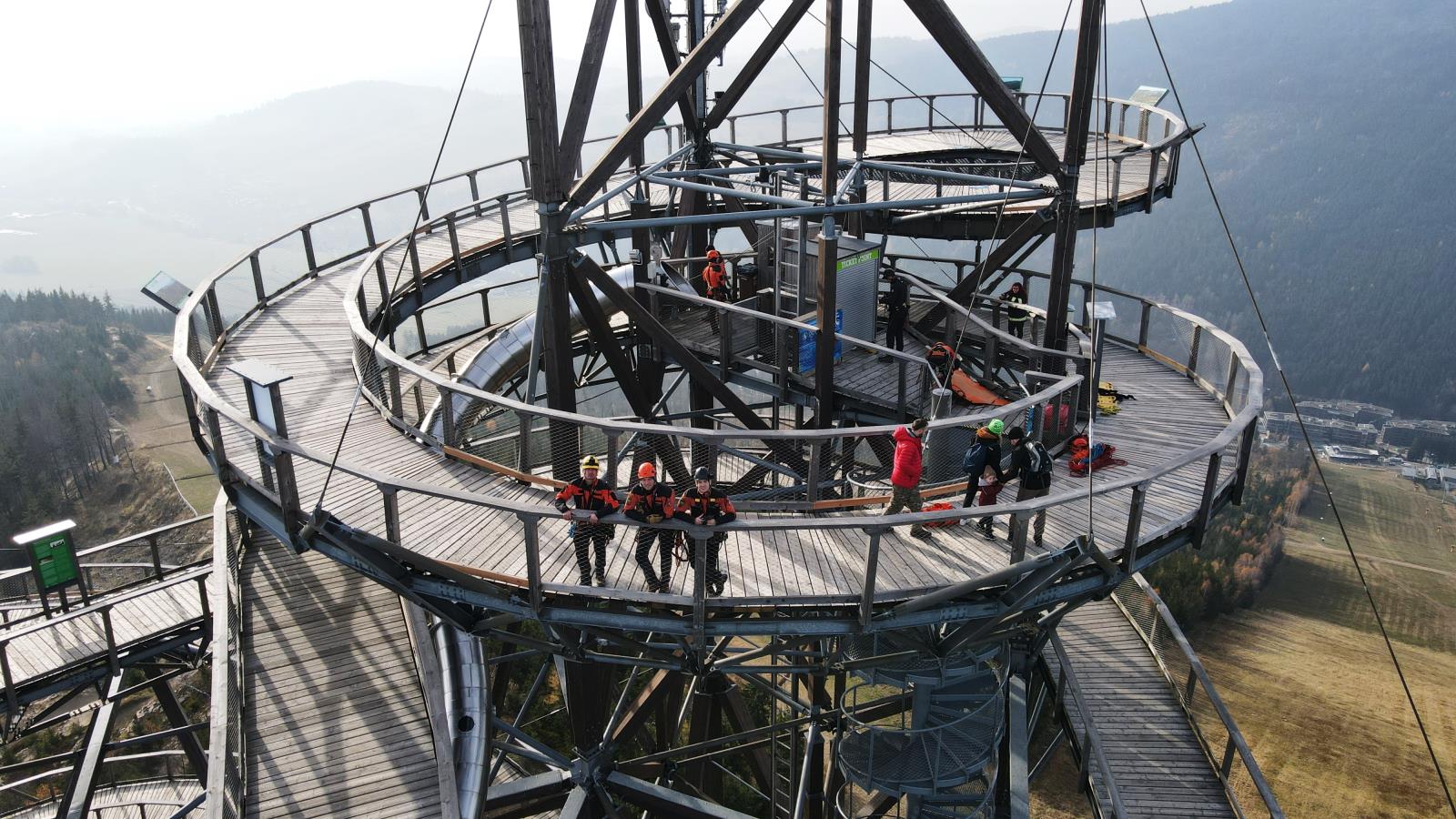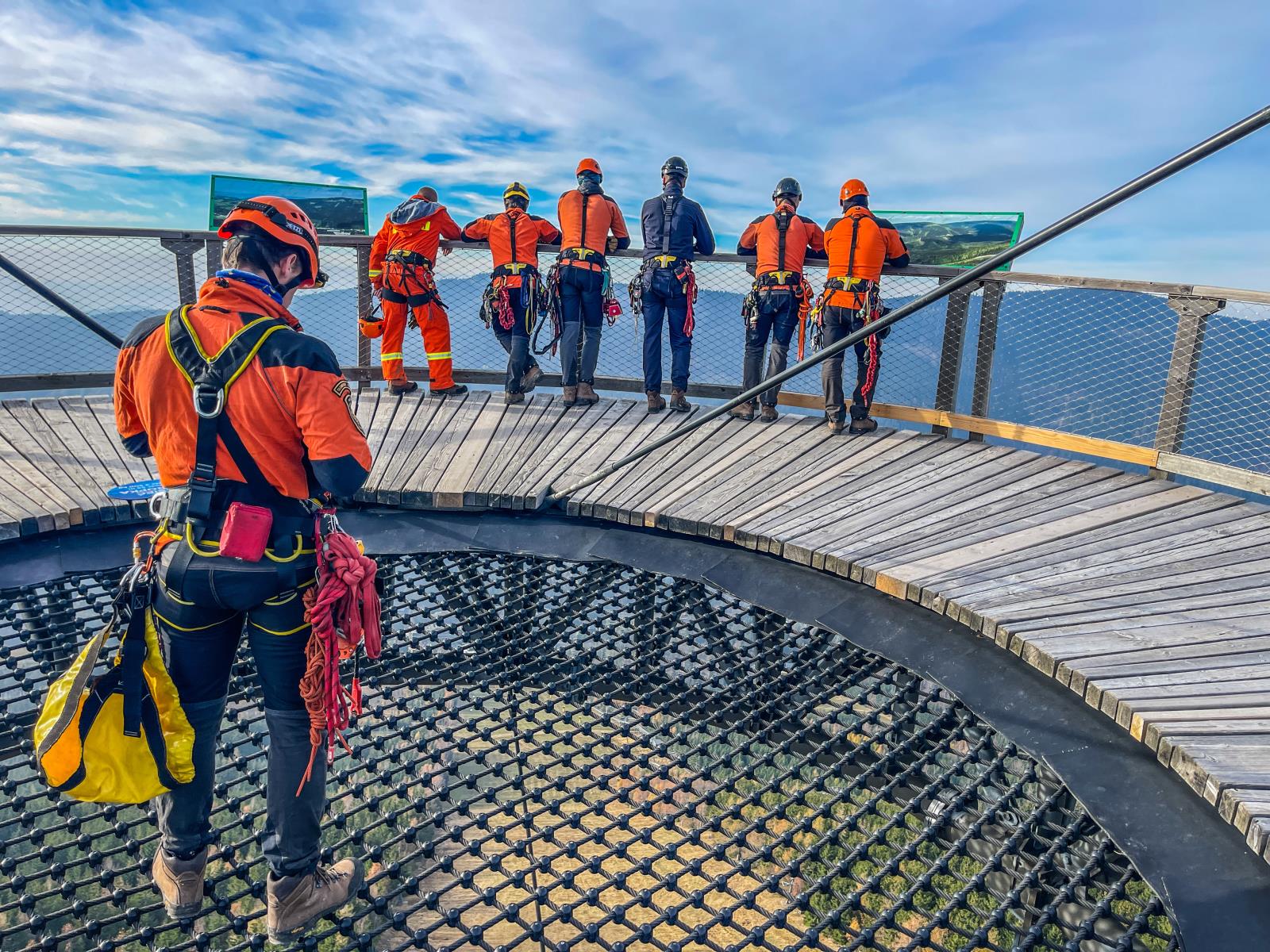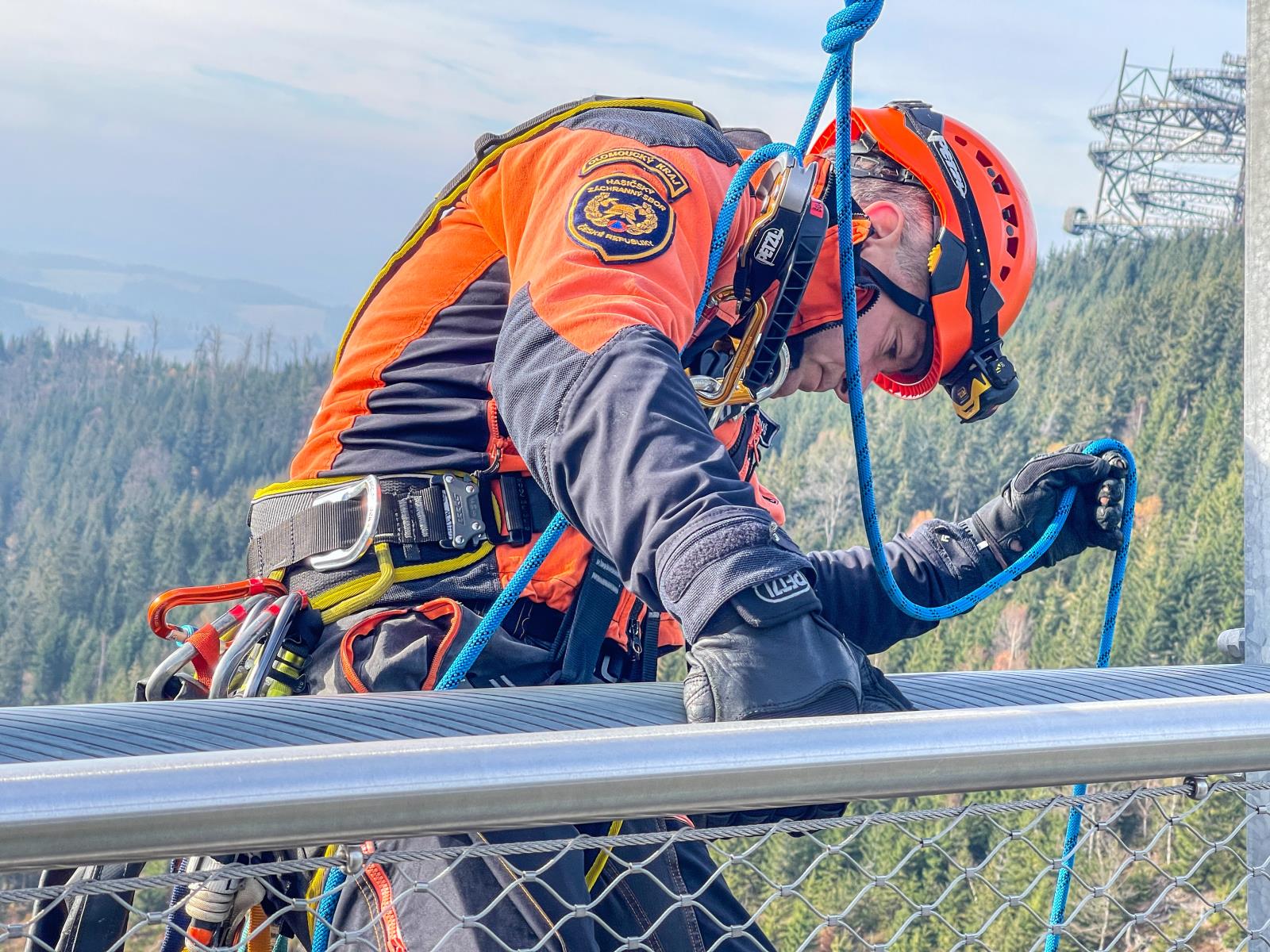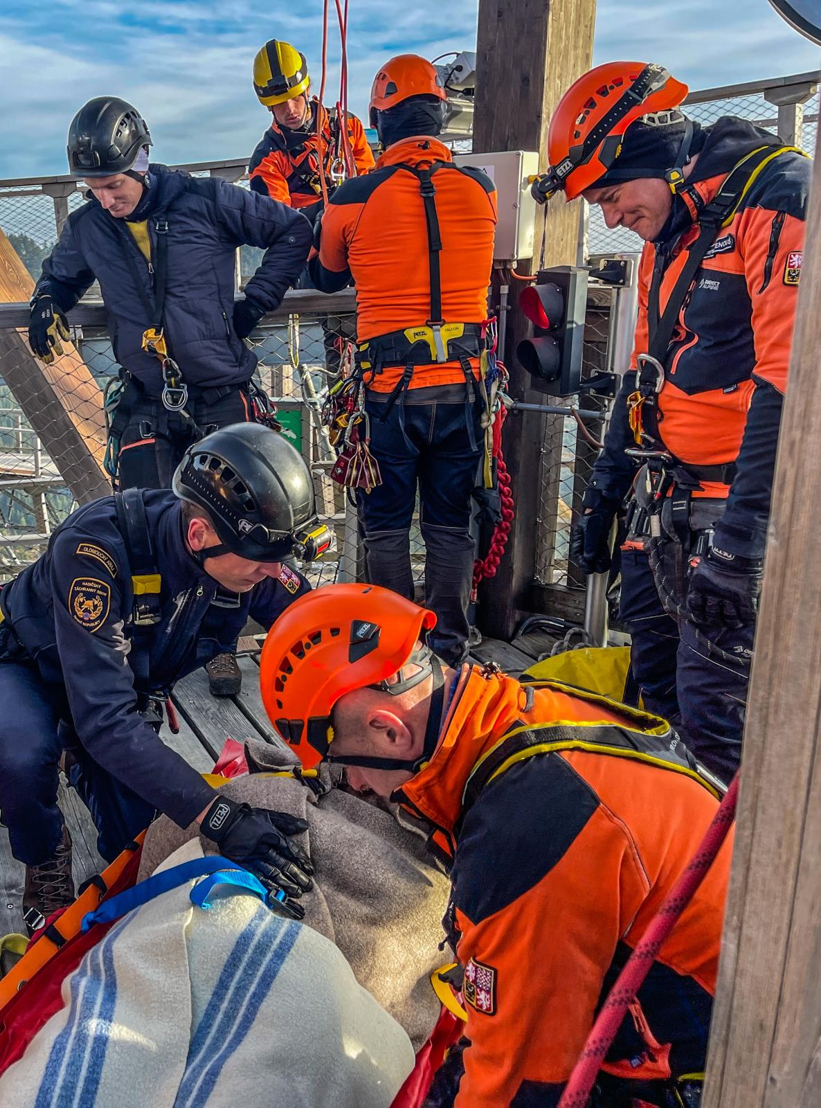 Na stezce v oblacích jsme si vyzkoušeli záchranu turisty, který chtěl i přes uzávěru vyzkoušet kovový tobogán a uvíznul v něm. Pomocí lanových technik jsme jej dostali bezpečně ven, poté jsme využili možností složité konstrukce turistické atrakce a procvičili jsme záchranu fotografa, který si pořizuje selfie v místech, kam je zakázaný vstup.