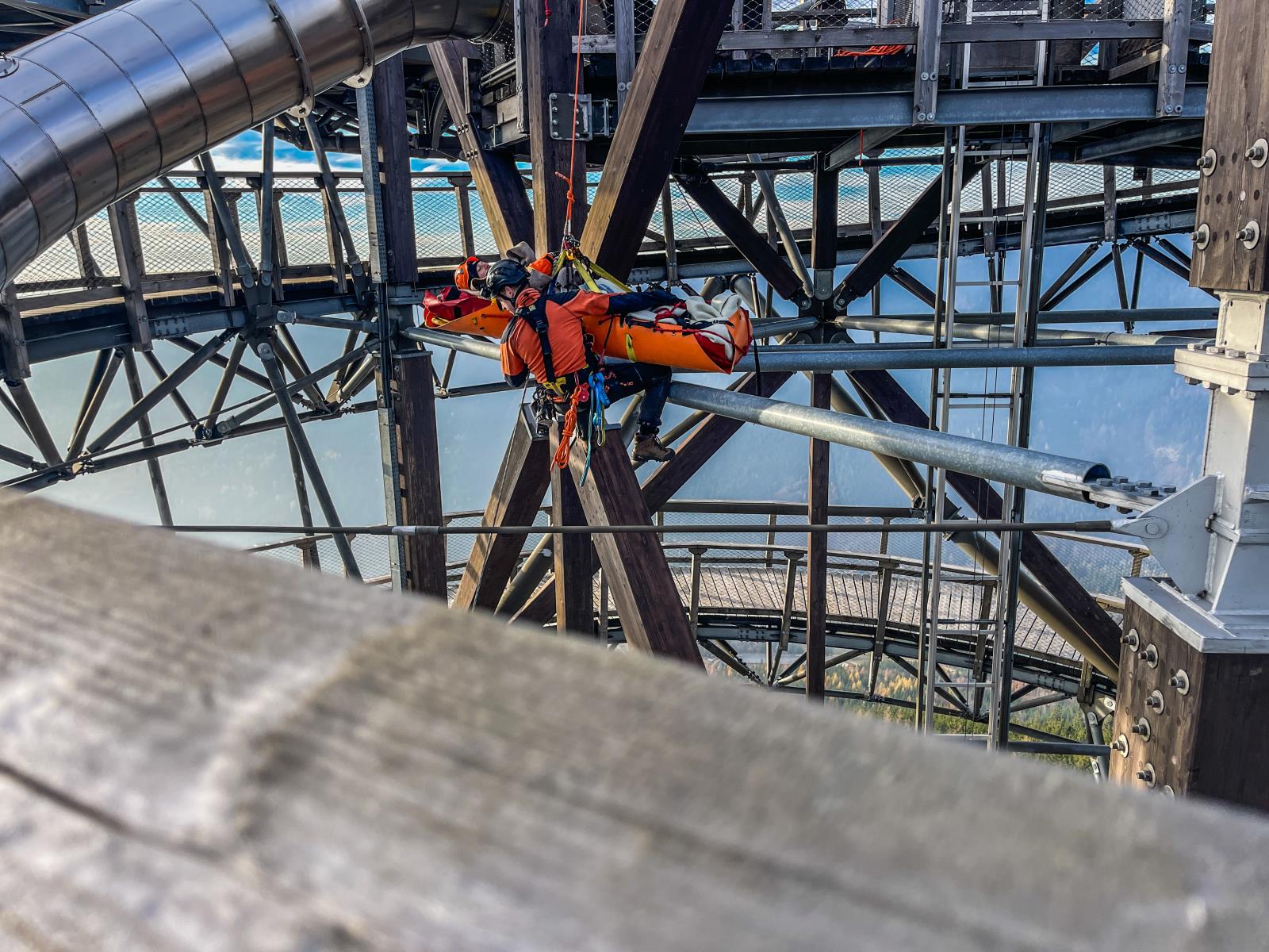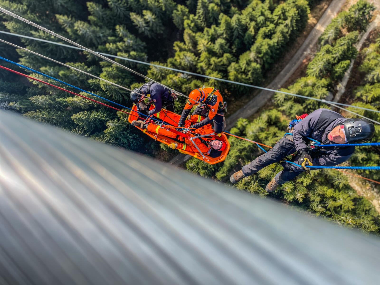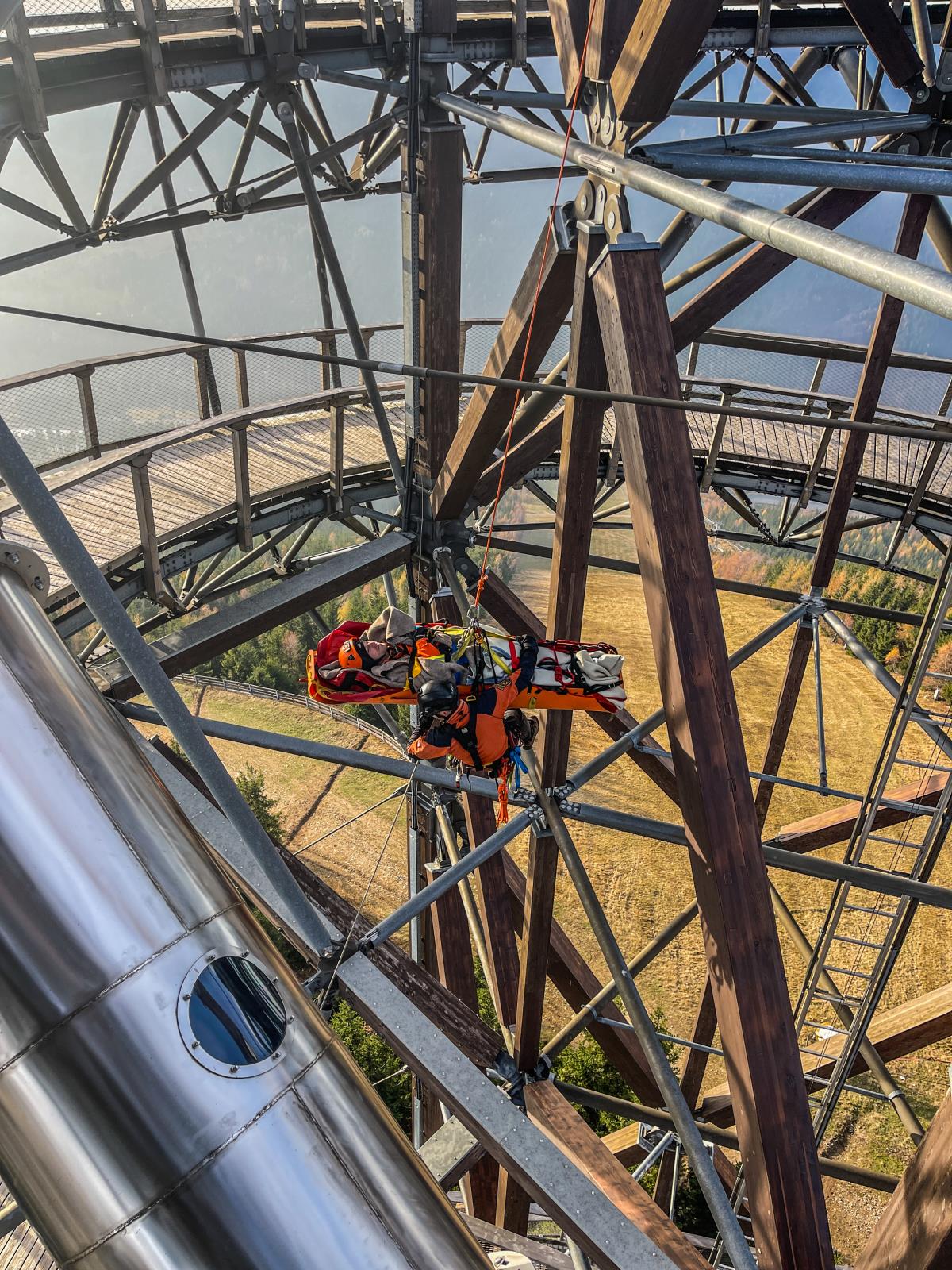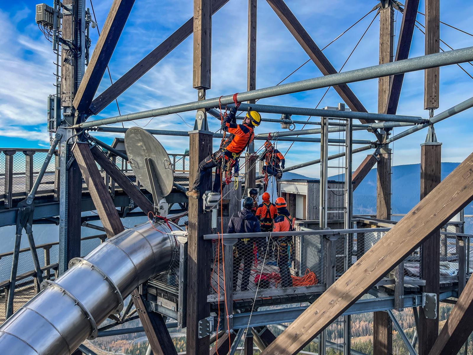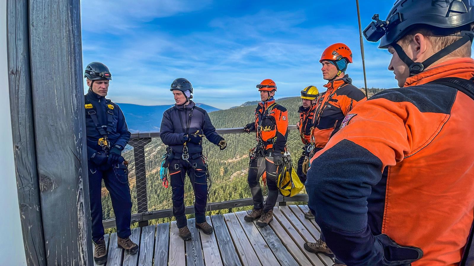 Na stezce v oblacích jsme si vyzkoušeli záchranu turisty, který chtěl i přes uzávěru vyzkoušet kovový tobogán a uvíznul v něm. Pomocí lanových technik jsme jej dostali bezpečně ven, poté jsme využili možností složité konstrukce turistické atrakce a procvičili jsme záchranu fotografa, který si pořizuje selfie v místech, kam je zakázaný vstup.